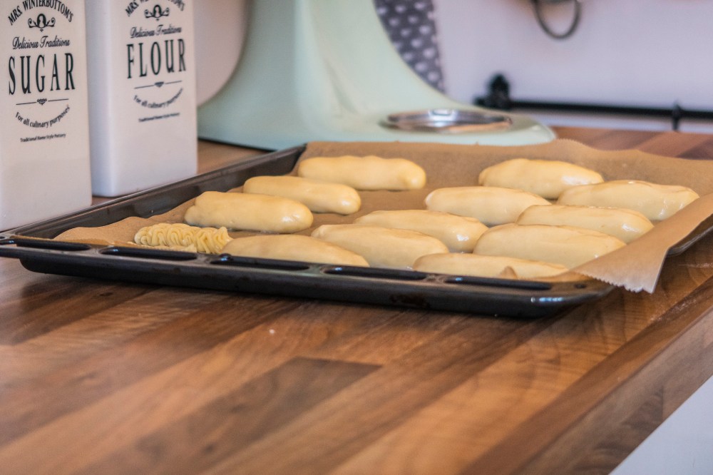 Den fertigen Teig könnt ihr in einen Spritzbeutel füllen und dann auf ein Backblech spritzen. Lasst euch aber vorwarnen: Kraft ist hier gefragt! Da mir dabei schon ein paar mal die Spritzbeutel geplatzt sind (oh ja, man schaut ziemlich blöd, wenn man das Gesicht plötzlich voll mit Teig hat), mache ich das lieber mit den Händen. Befeuchtet dazu einfach die Hände mit Wasser (dadurch klebt der Teig nicht an den Fingern), nehmt ein wenig Teig und formt daraus eine Wurst mit ca. 10 cm Länge. Setzt diese mit genügend Abstand auf ein Backblech und bestreicht zum Schluss noch einmal alle mit etwas Wasser. Achtet dabei darauf, dass alle Eclairs etwa gleich groß sind. Nun ab damit für etwa 20 min. in den Backofen bis sie etwa goldbraun sind. Wichtig: die Backofentür geschlossen halten, sonst fallen die Eclairs ein.