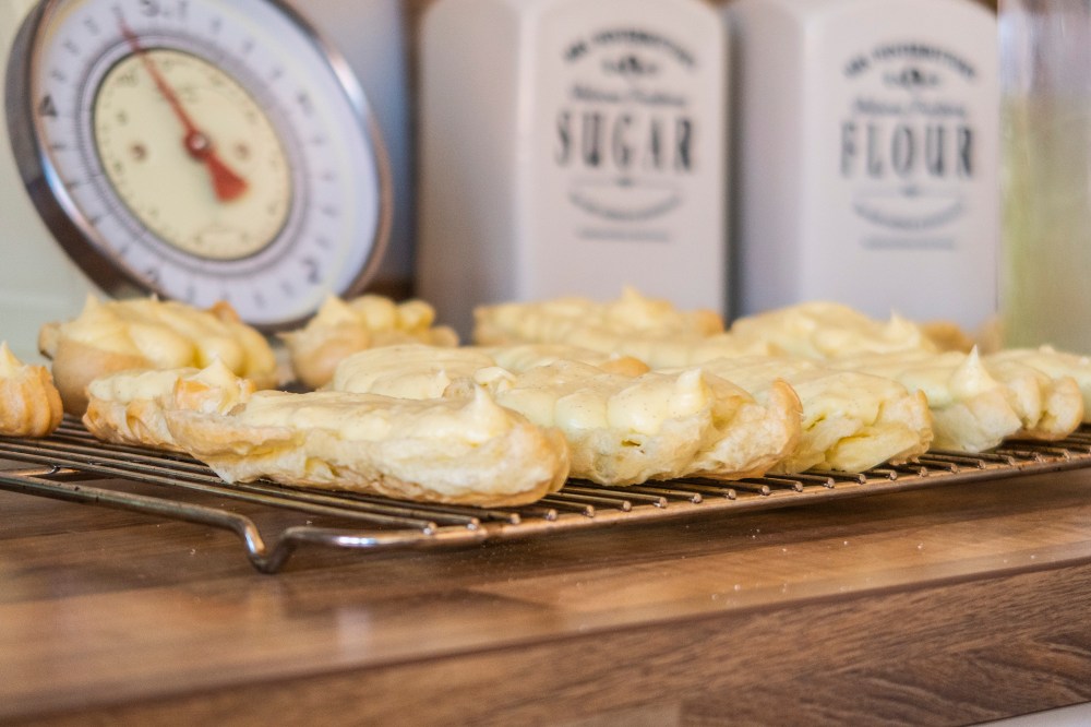 Die Eclairs auf einem Küchenrost komplett abkühlen lassen (das geht zum Glück recht schnell) und anschließend mit einem Brotmesser in zwei Hälften teilen.