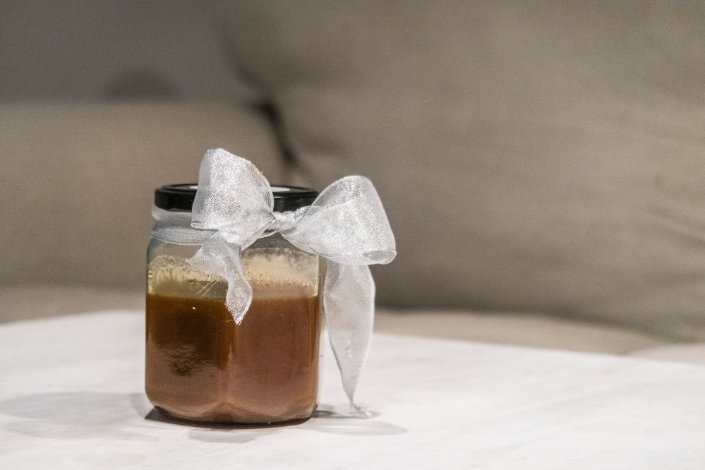 Die Karamellsoße in ein Gefäß umfüllen (z. B. in ein hohes Einmachglas, das ihr vorher mit kochendem Wasser ausgespült habt) und abkühlen lassen.