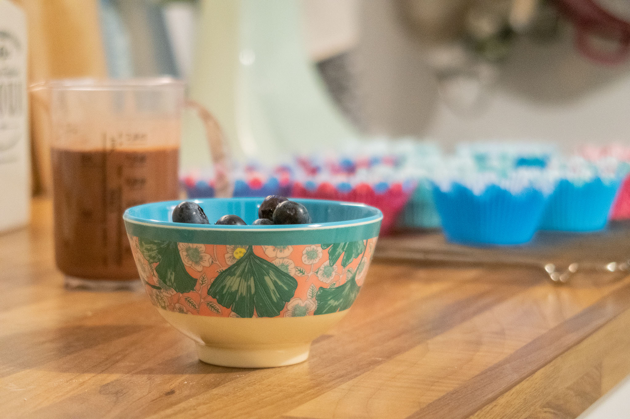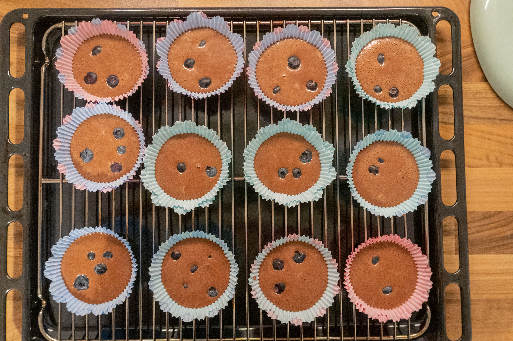 Nun geht es ans Befüllen der Muffinförmchen. Ihr könnt dazu Papier- oder Silikonmanschetten in eine feste Muffinform geben. Ich habe allerdings keine Muffinform und gebe daher meine Papiermanschetten einfach direkt auf mein Backrost. Das funktioniert auch einwandfrei. Um das Befüllen zu erleichtern, füllt den (etwas flüssigen) Teig einfach in einen Messbecher und dann zu etwa 2/3 in eure Förmchen. Gebt dann nach Lust und Laune Blaubeeren hinzu.