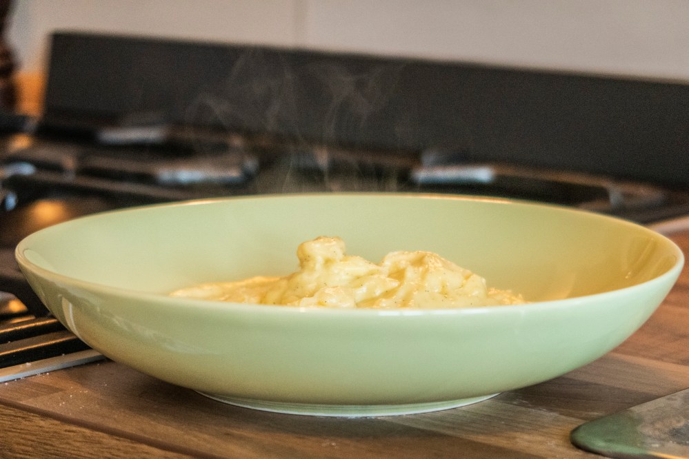 In der Zwischenzeit könnt ihr die Crème pâtissière für die Füllung vorbereiten. Gebt die Milch, zusammen mit dem herausgekratzten Mark und der Schote, in einen Topf. Auf mittlerer Hitze erwärmen. Die Schote herausnehmen.