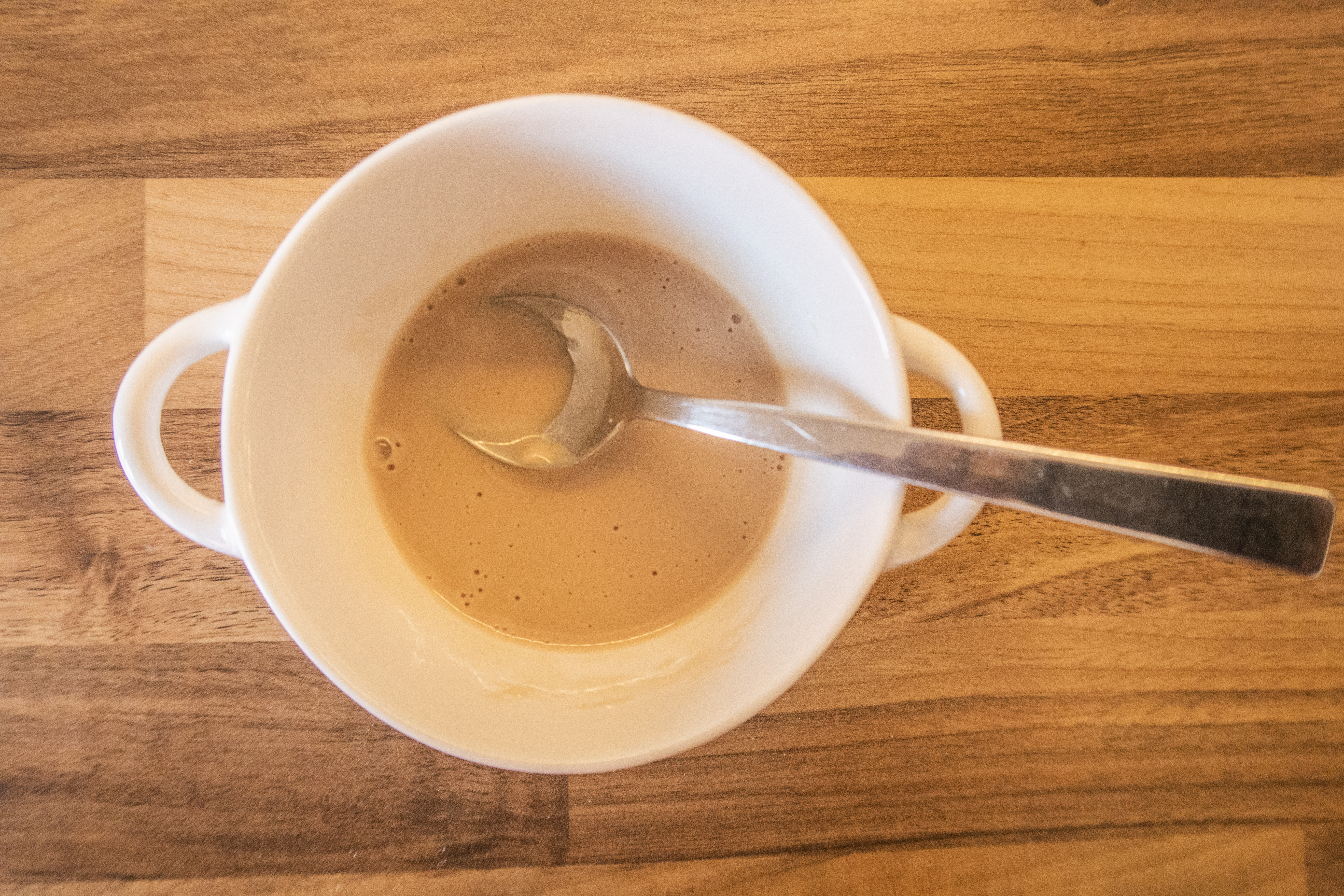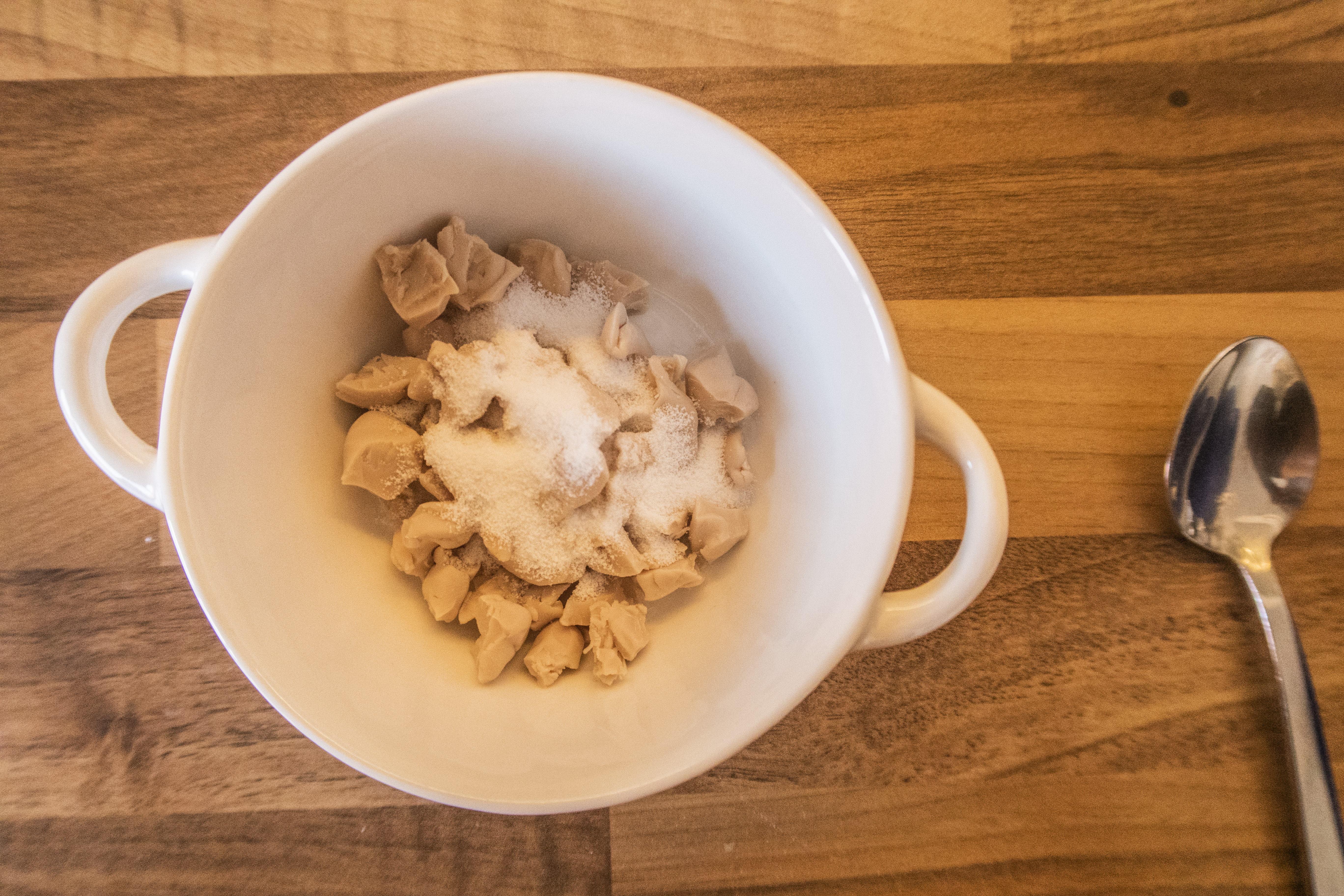 Zuerst wird der Hefeteig zubereitet. Dazu bröselt ihr die Hefe in eine kleine Schüssel und gebt einen Esslöffel vom Getreidezucker hinzu. Rührt nun beides mit Hilfe eines Löffels zusammen. Dadurch verflüssigt sich die Hefe und fängt an zu arbeiten.