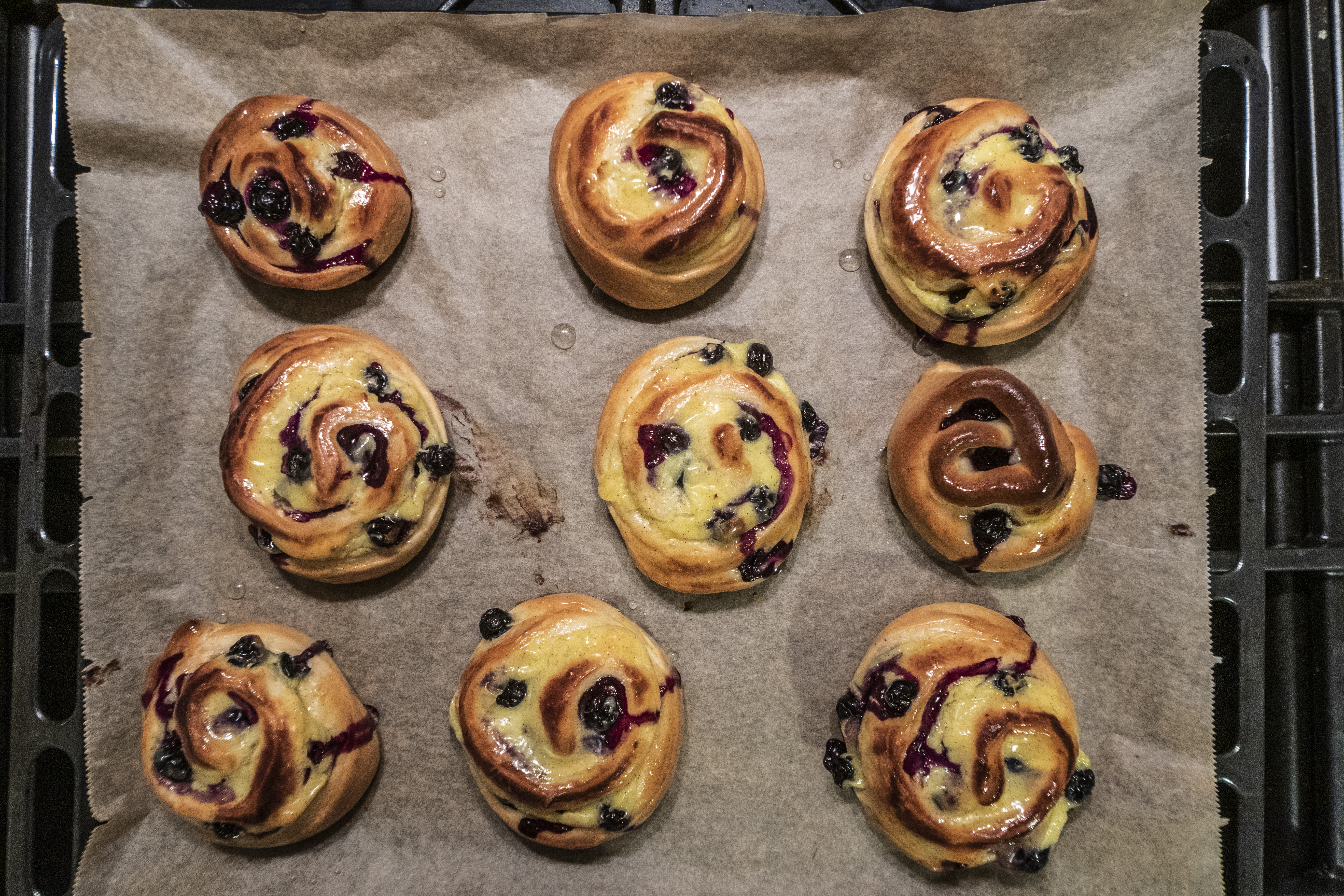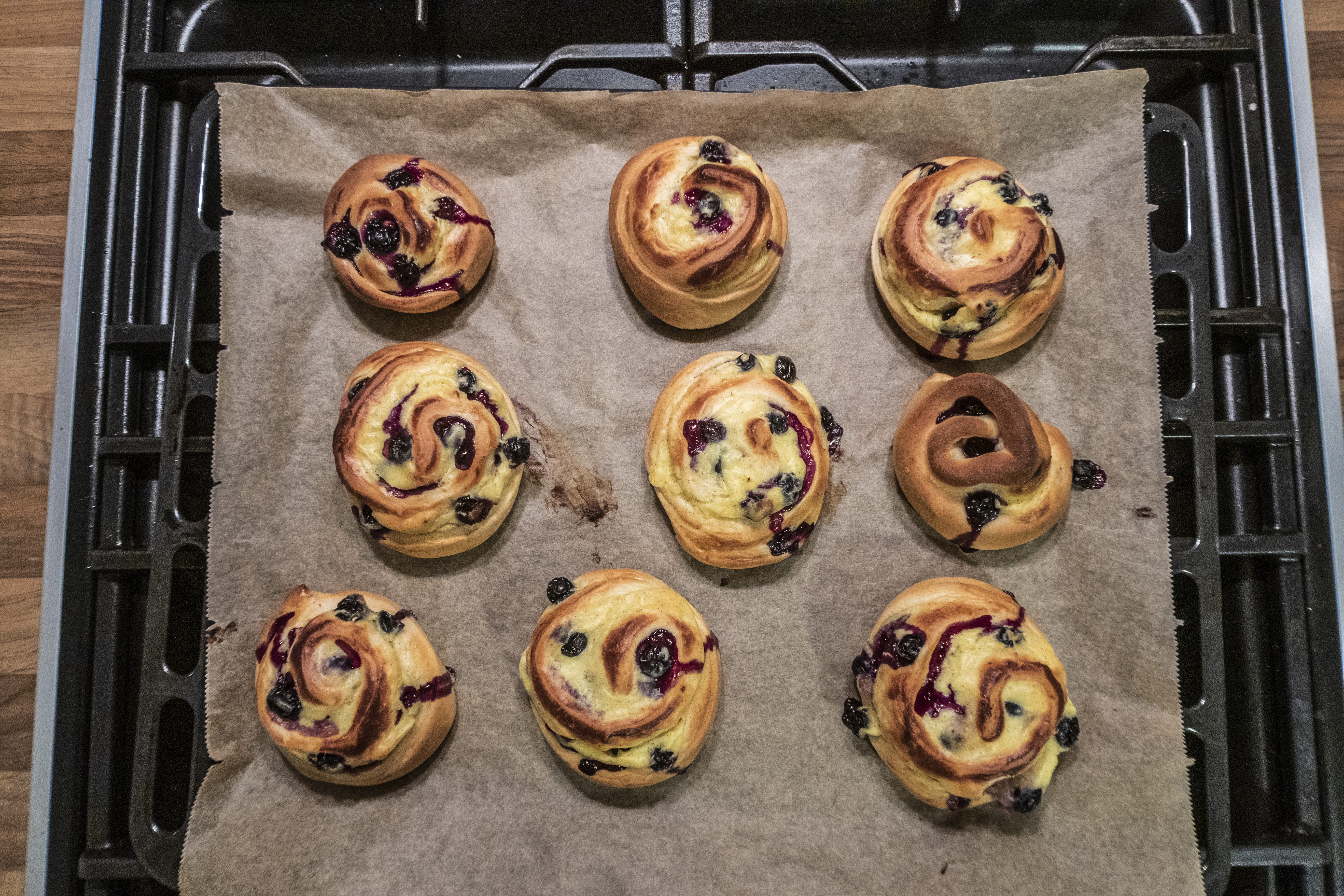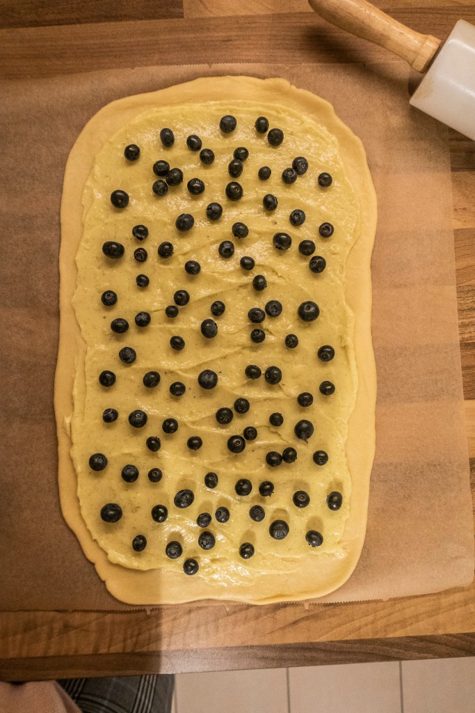 Wenn der Hefeteig an Volumen gewonnen hat, knetet ihn noch einmal leicht durch. Rollt ihn dann mit Hilfe eines Nudelholzes zu einem Rechteck mit einer Dicke von etwa 0,5 cm aus. Darauf verstreicht ihr die abgekühlte Crème pâtissière. Lasst dabei jeweils einen Rand von 1 cm frei. Verteilt nun die Blaubeeren auf der Creme. Rollt den belegten Teig von der kurzen Seite möglichst eng auf. Streicht das Ende mit einem verquirlten Ei ein und klebt es so an die Heferolle fest. Schneidet nun jeweils 2 cm breite Schnecken ab und legt diese auf ein mit Backpapier belegtes Backblech. Lasst diese noch einmal 30 Minuten gehen.