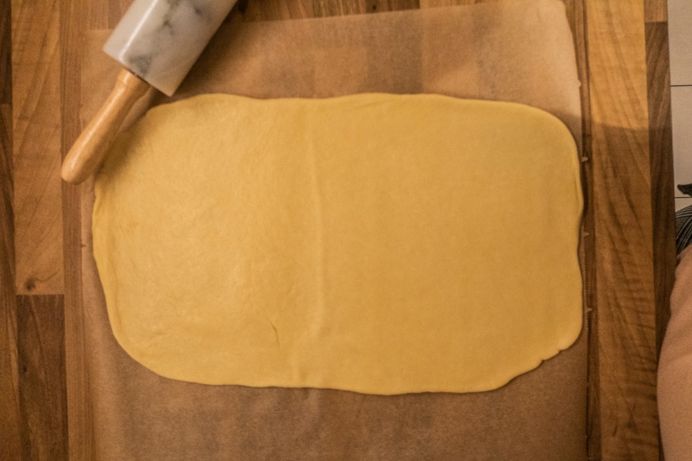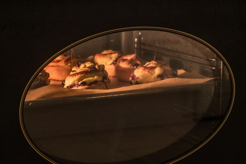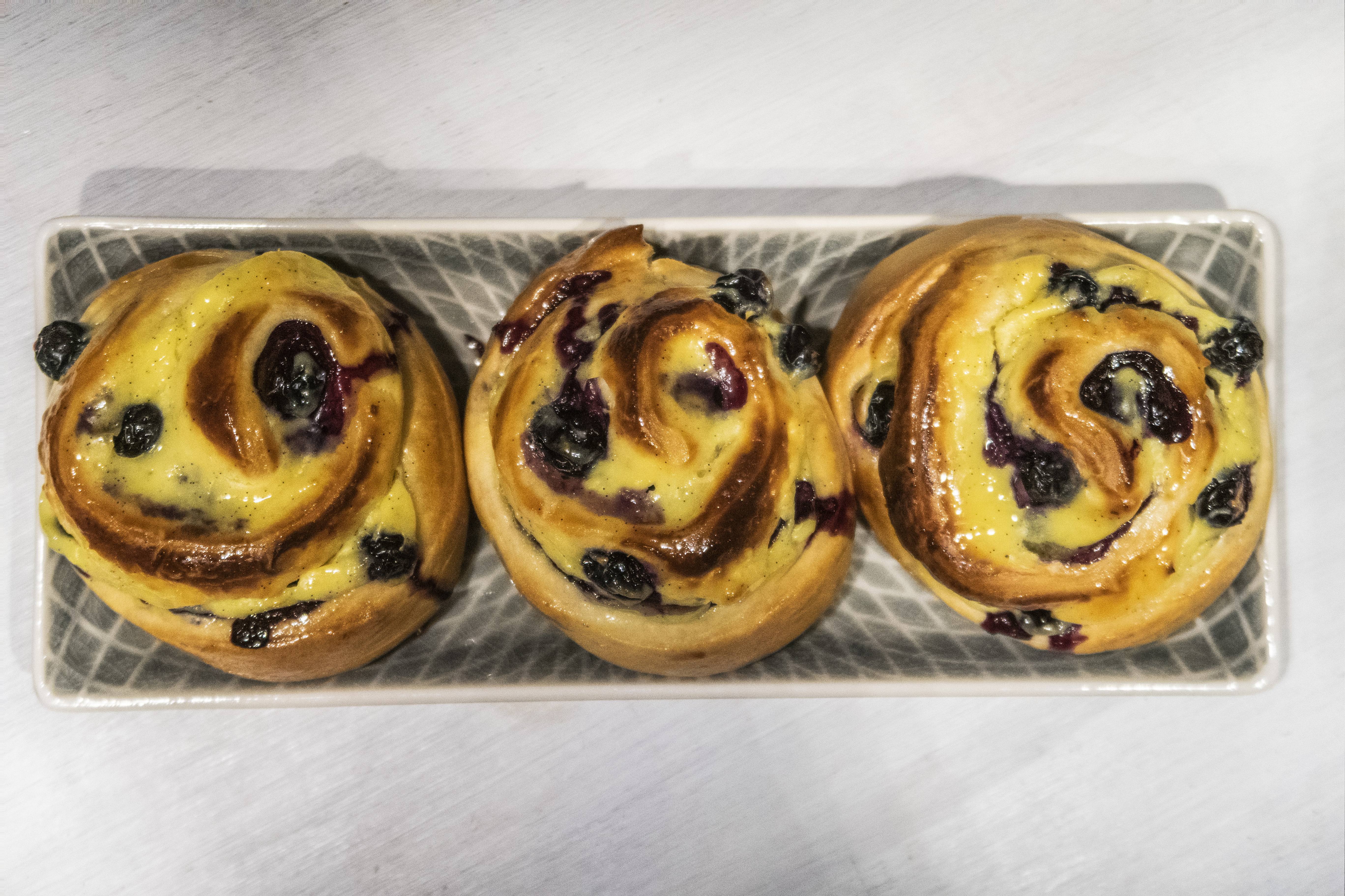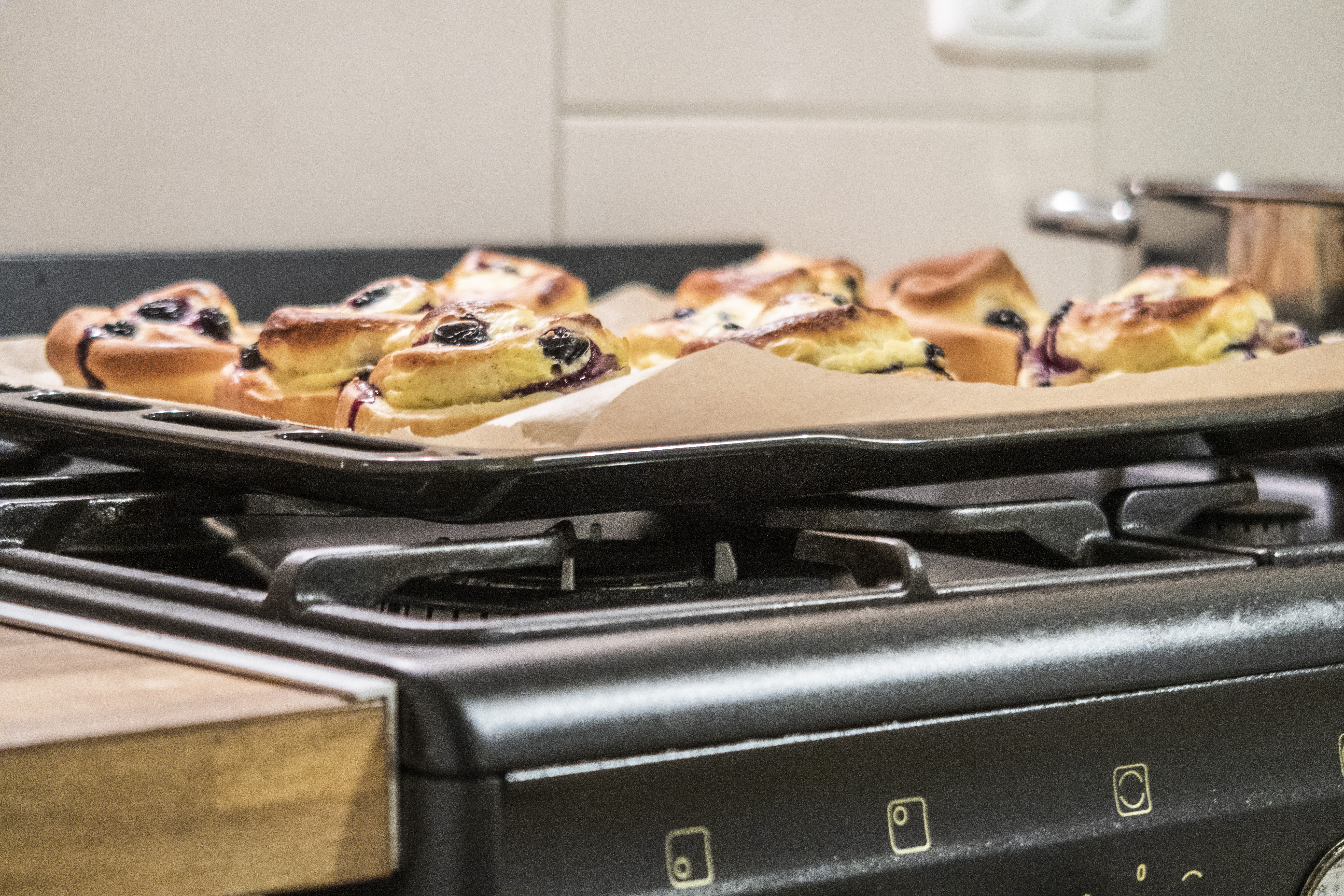 Wenn der Hefeteig an Volumen gewonnen hat, knetet ihn noch einmal leicht durch. Rollt ihn dann mit Hilfe eines Nudelholzes zu einem Rechteck mit einer Dicke von etwa 0,5 cm aus. Darauf verstreicht ihr die abgekühlte Crème pâtissière. Lasst dabei jeweils einen Rand von 1 cm frei. Verteilt nun die Blaubeeren auf der Creme. Rollt den belegten Teig von der kurzen Seite möglichst eng auf. Streicht das Ende mit einem verquirlten Ei ein und klebt es so an die Heferolle fest. Schneidet nun jeweils 2 cm breite Schnecken ab und legt diese auf ein mit Backpapier belegtes Backblech. Lasst diese noch einmal 30 Minuten gehen.