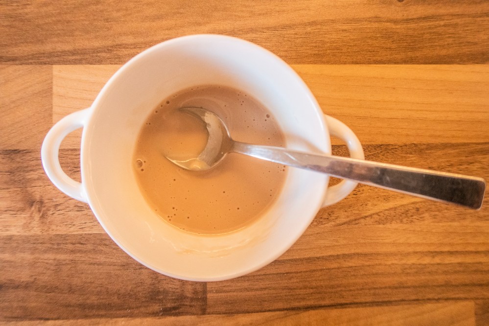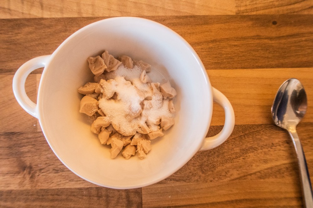 Erwärmt 60 ml der Milch in einem Topf. Die Milch soll wirklich nur warm werden, nicht heiß. Zerbröselt die Hefe in einer kleinen Schüssel und gebt 10 g vom Getreidezucker hinzu. Rührt mit einem kleinen Löffel beides solange zusammen, bis sich die Hefe verflüssigt hat. Dann fängt die Hefe auch wirklich an zu arbeiten.