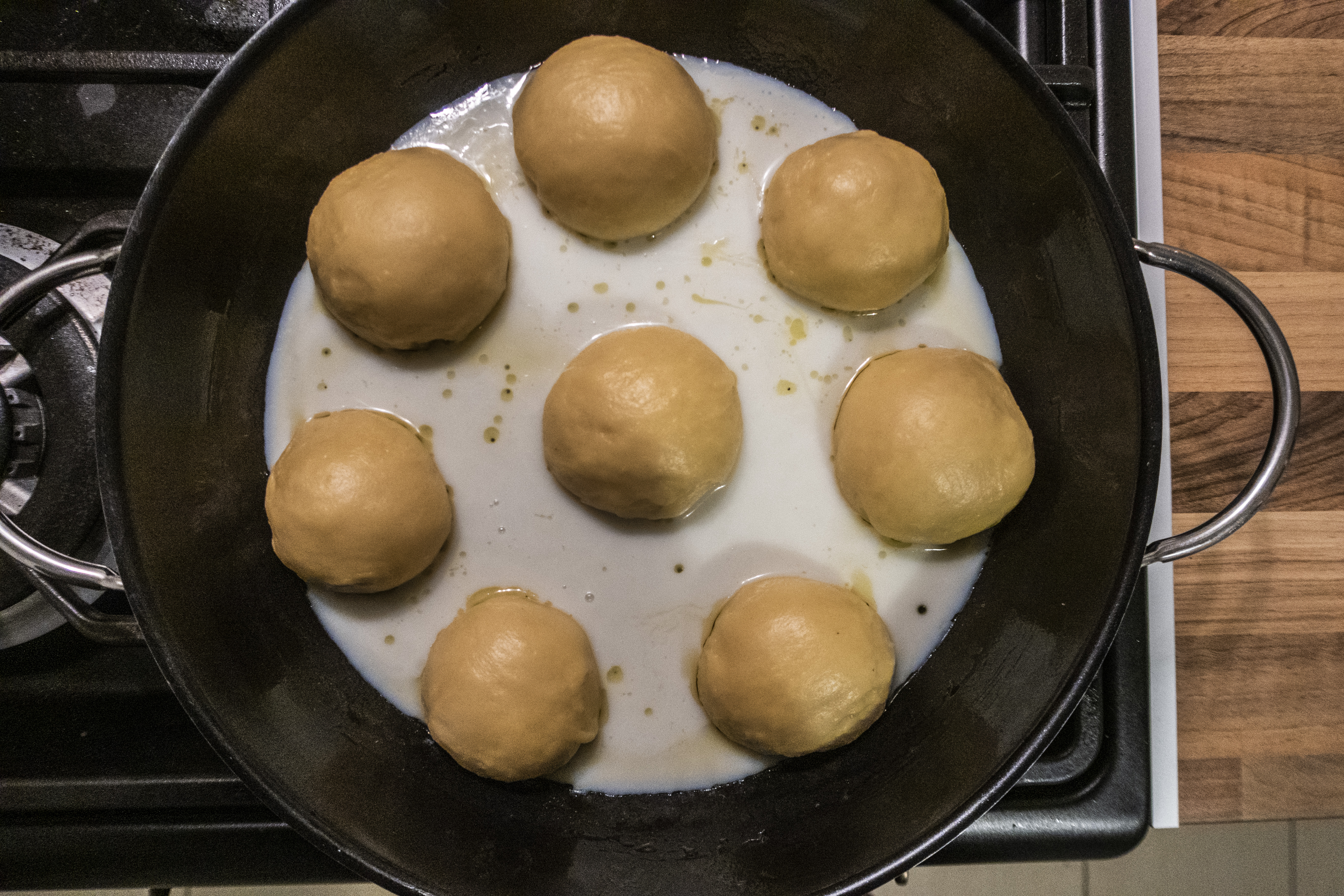 Nehmt euch eine große Pfanne (Durchmesser ca. 28-30 cm) mit hohem Rand und fettet diese ordentlich mit Butter ein. Das ist wichtig, da ihr nicht wollt, dass euch eure Dampfnudeln am Boden festbrennen. Nun knetet den Hefeteig noch einmal vorsichtig durch und teilt ihn in 8 gleich große Stücke. Formt nun aus jedem der 8 Teigstücke je eine runde Kugel und setzt diese in eure gebutterte Pfanne. Lasst die Teiglinge wieder eine halbe Stunde lang gehen (am besten wieder im Ofen). Ihr solltet jetzt noch Platz in der Pfanne haben, schließlich gehen eure Dampfnudeln noch ordentlich auf.