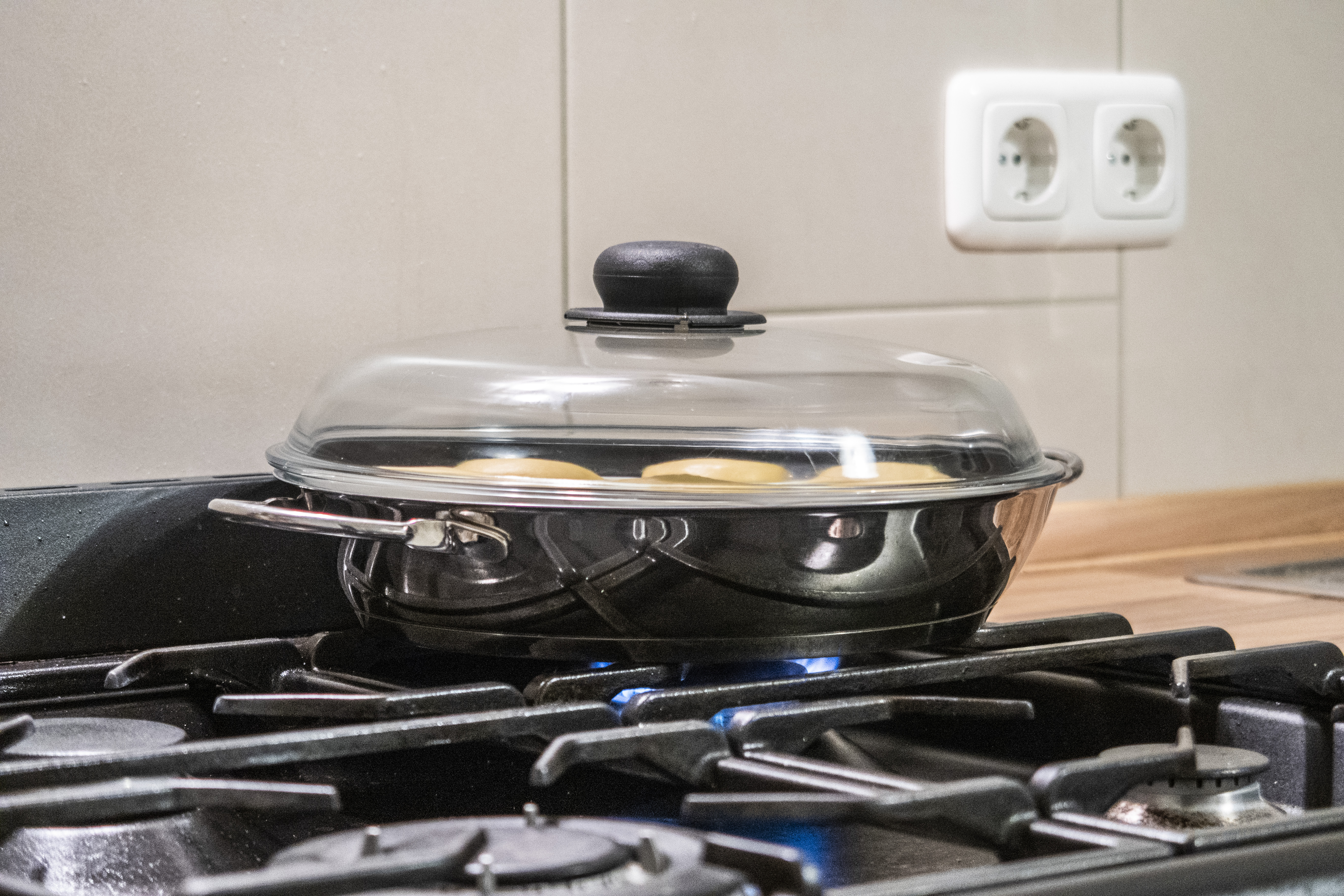 Mischt die restliche Milch mit dem restlichen Getreidezucker zusammen und gebt die Flüssigkeit zu den Dampfnudeln in die Pfanne. Gebt einen passenden Deckel auf eure Pfanne und dämpt eure Dampfnudeln für etwa 20-22 Minuten bei mittlerer Hitze. Dabei sollten sie noch schön aufgehen. Wie immer bei Milchgerichten ist etwas Vorsicht geboten: passt vor allem zum Schluss auf, dass euch die Milch nicht anbrennt (auch dafür war es wichtig, die Pfanne richtig einzufetten) und nehmt die Dampfnudeln rechtzeitig vom Herd. Sie sollen durch die Milch und den Zucker von unten karamellisieren, aber natürlich nicht anbrennen. Und schon könnt ihr sie servieren! Dazu passt zum Beispiel eine selbstgemachte Vanillesauce.