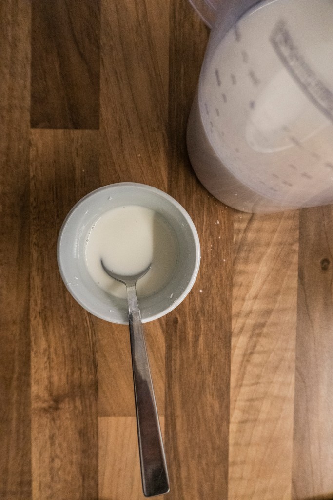 Zuerst rührt ihr die Speisestärke mit etwas Milch an. Das kennen wir schon aus der Zubereitung von Vanillesauce aus der Tüte.