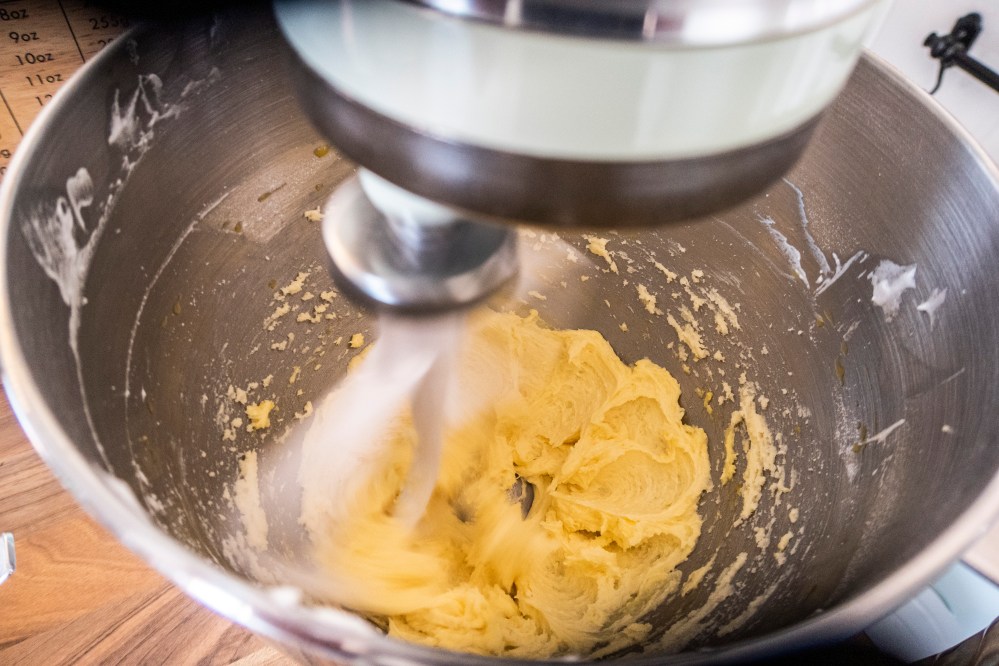 Gebt die Butter, die restlichen 140 g Getreidezucker, den Vanillezucker und die Zitronenschale in eine Schüssel und rührt die Masse schaumig auf. Nun die Eigelbe einzeln (!) dazu geben und jeweils etwa eine Minute unterrühren. Das ist wichtig, da ihr sonst keinen Teig erhaltet, sondern eher eine glitschige Masse, die sich weigert, sich zu verbinden (man könnte auch von Arbeitsverweigerung sprechen und die möchte niemand).