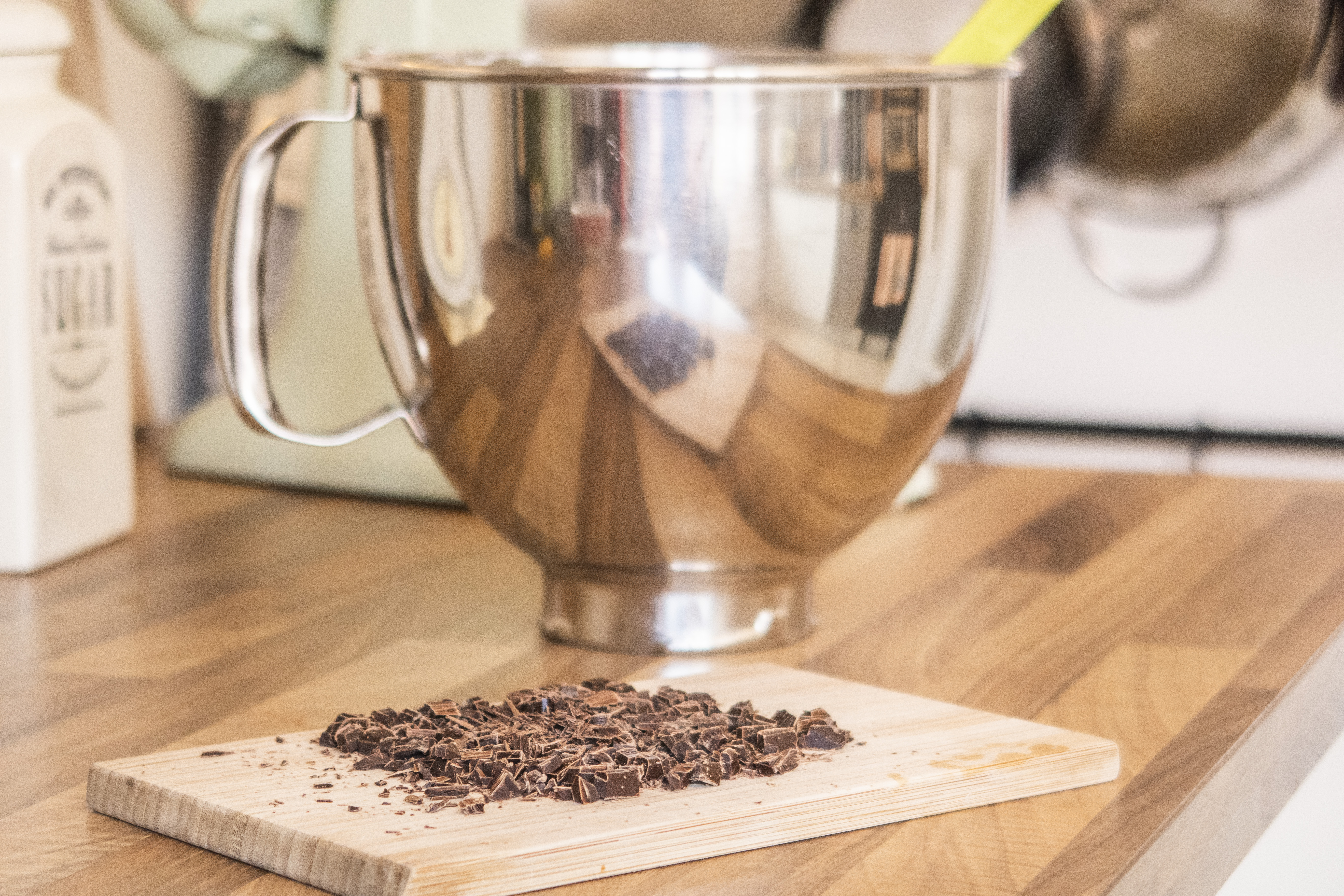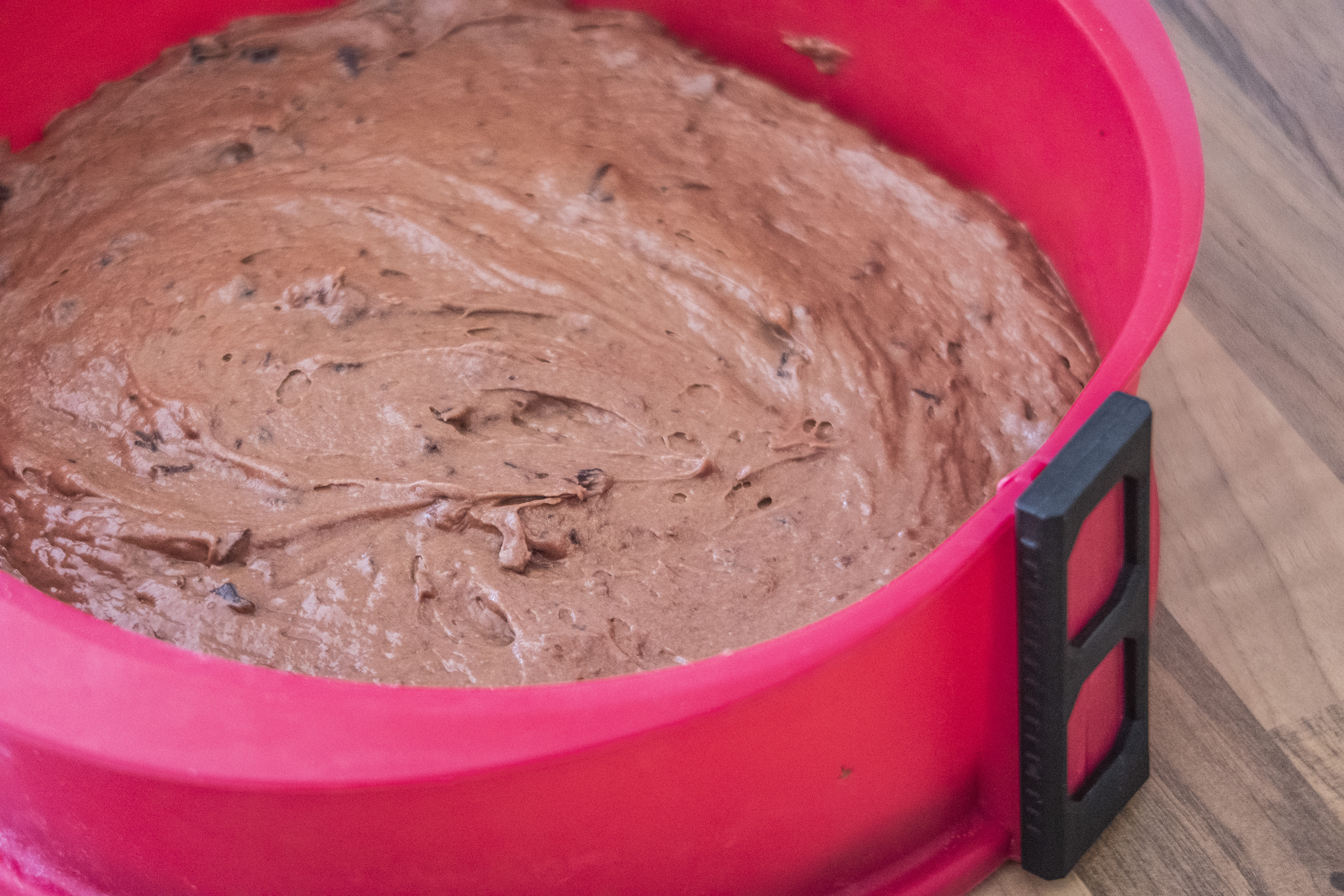 Hackt eure fruktosearme Schokolade in kleine Stücke. Grundsätzlich könnt ihr nehmen, welche euch schmeckt. Ich finde, eine Nougatschokolade passt sehr gut dazu, weil sie dem Kuchenteig damit eine gewisse Schmelzigkeit verleiht. Aber wie gesagt, nehmt, was euch gefällt. Die zerhackte Schokolade dann nur noch einmal kurz unterheben und schon kann euer Teig in eine Backform. Meine Kuchenform hat einen Durchmesser von 22 cm, ist also ein wenig kleiner, als die Standardvariante. Selbstverständlich könnt ihr auch eine andere Größe nehmen. Je nachdem ist dann euer Teig dünner oder dicker und die Backzeit verändert sich etwas. Aber ansonsten ist das kein Problem. Der Teig kommt dann für etwa 30 Minuten (bei 22 cm Durchmesser) in den Ofen.