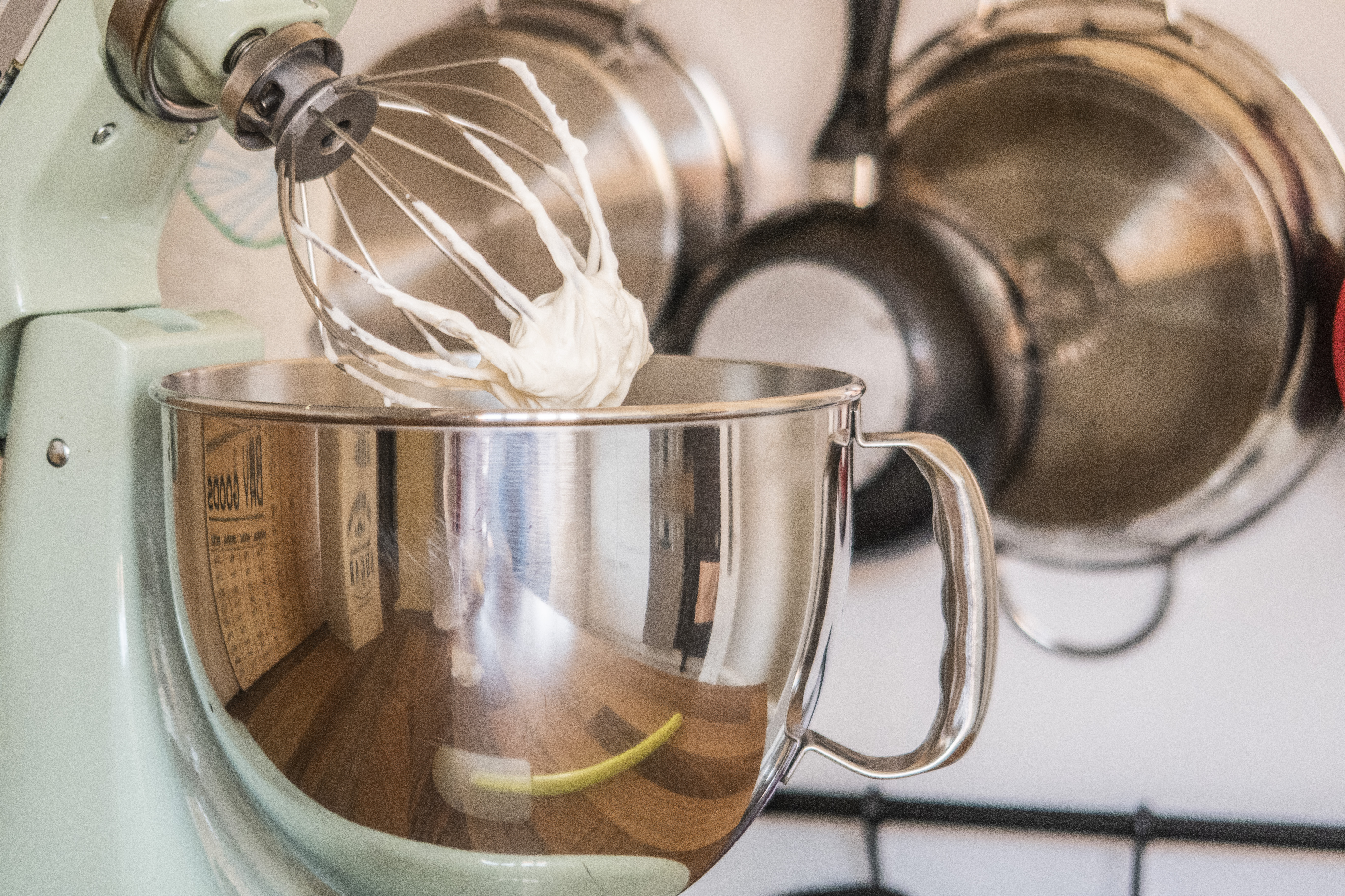 In der Zwischenzeit könnt ihr eure Creme vorbereiten. Dazu schlagt ihr die Sahne mit dem Getreidezucker leicht steif. In dem Fall wirklich nur ganz leicht, denn nun kommen noch die restlichen Zutaten (bis auf die Himbeeren) hinzu und alles wird noch einmal zu einer festen Creme aufgeschlagen. Damit die Sahne das noch mitmacht und nicht überschlagen ist, übertreiben wir es in der ersten Runde nicht zu sehr. Probiert eure Creme und gebt ggf. noch etwas Zitronensaft hinzu – sie sollte schön „frisch“ schmecken. Stellt sie in den Kühlschrank, wo sie auf ihren großen Auftritt warten kann.