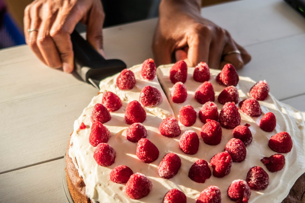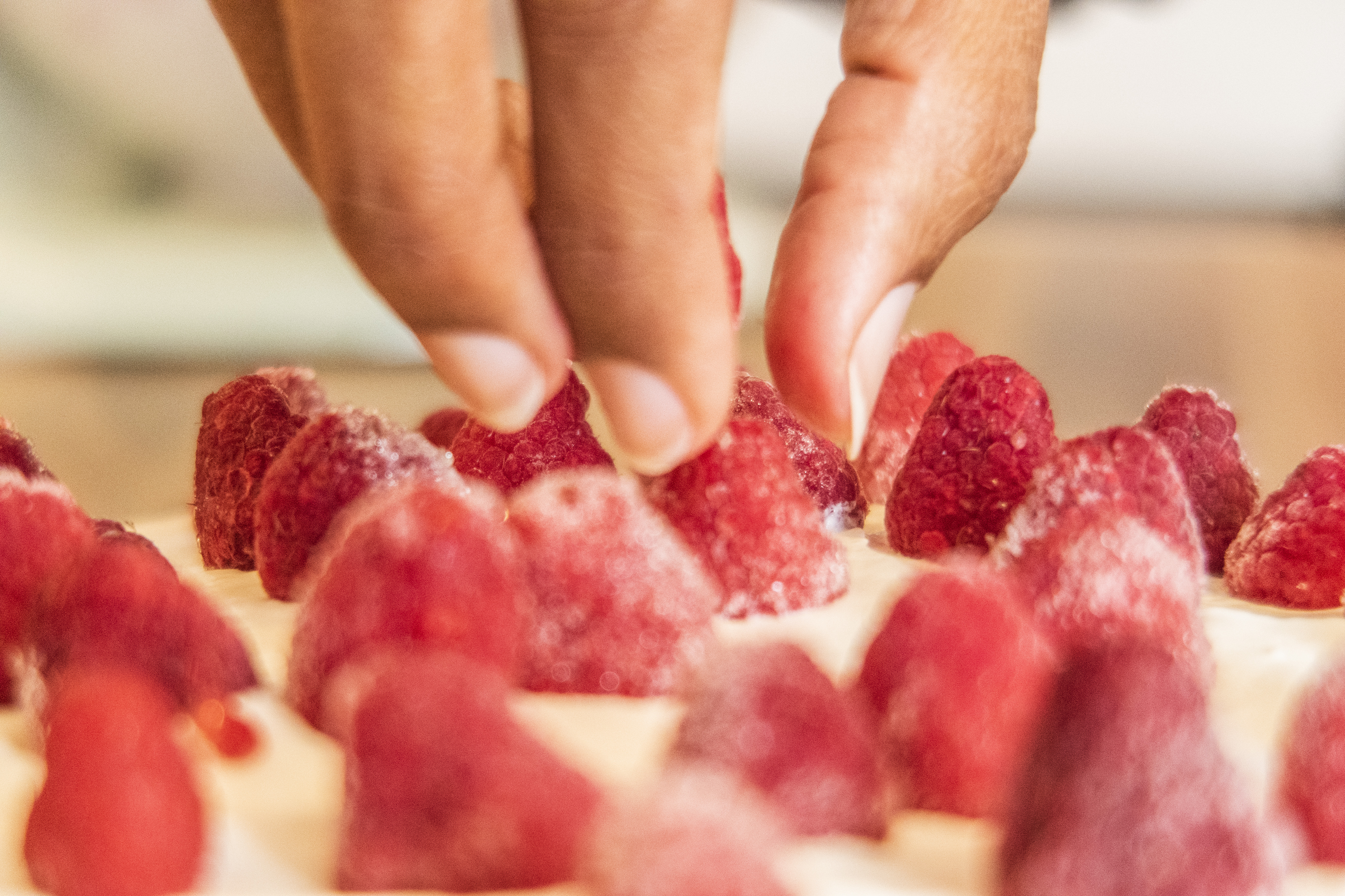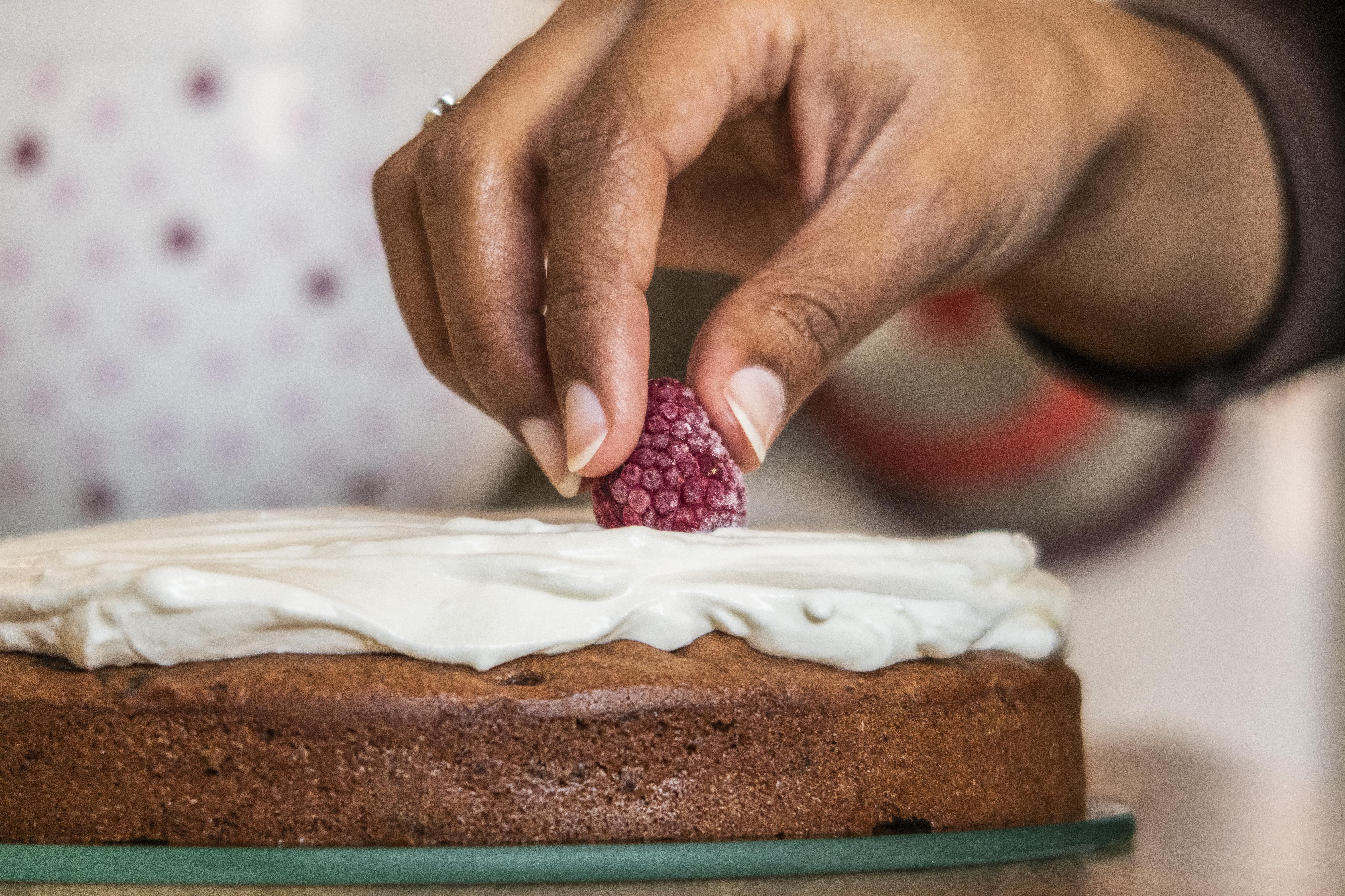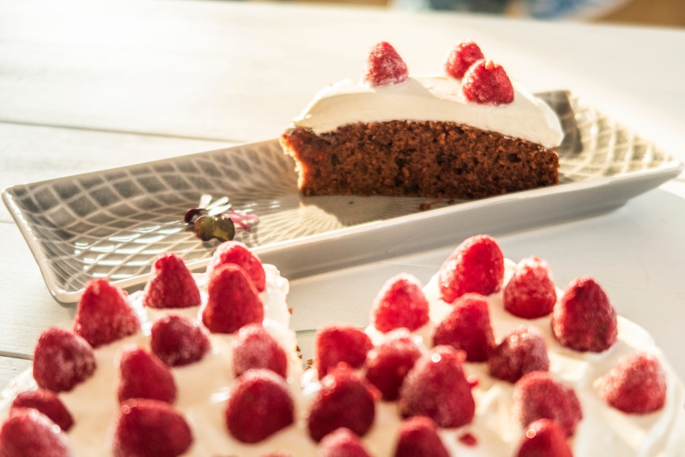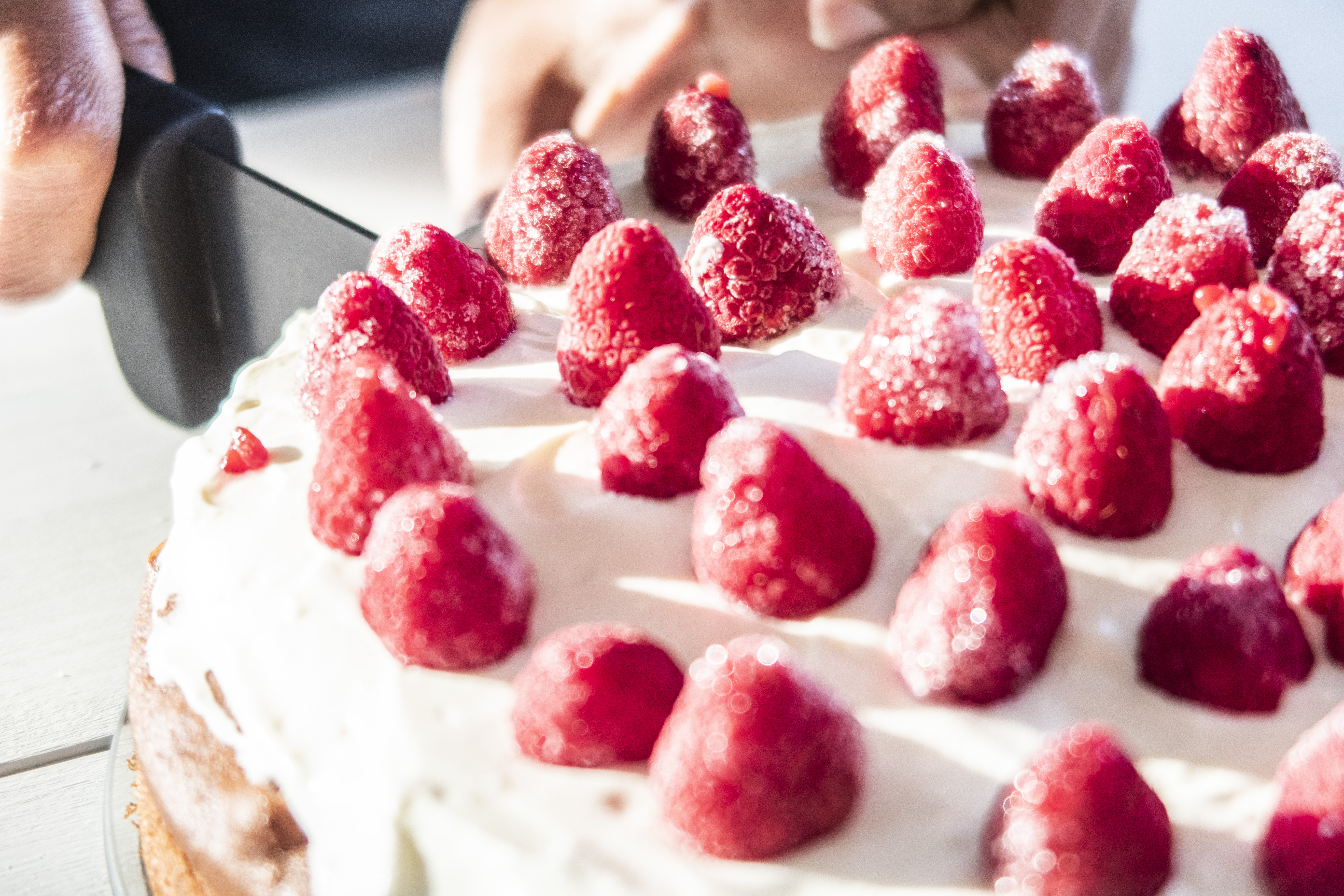 Ist der Kuchen abgekühlt, geht es nur noch ans Anrichten. Stellt den Kuchen auf eine Tortenplatte oder Teller, verteilt die Creme und drapiert eure Himbeeren darauf. Da aktuell noch keine Himbeersaison ist, habe ich einfach tiefgekühlte Himbeeren genommen. Und wie man auf den Bildern sehen kann, habe ich sie dafür nicht extra auftauen lassen, sondern direkt drauf gegeben. Ihr könnt die Himbeeren natürlich auch durch anderes, für euch verträgliches Obst austauschen. Und schon seid ihr fertig.