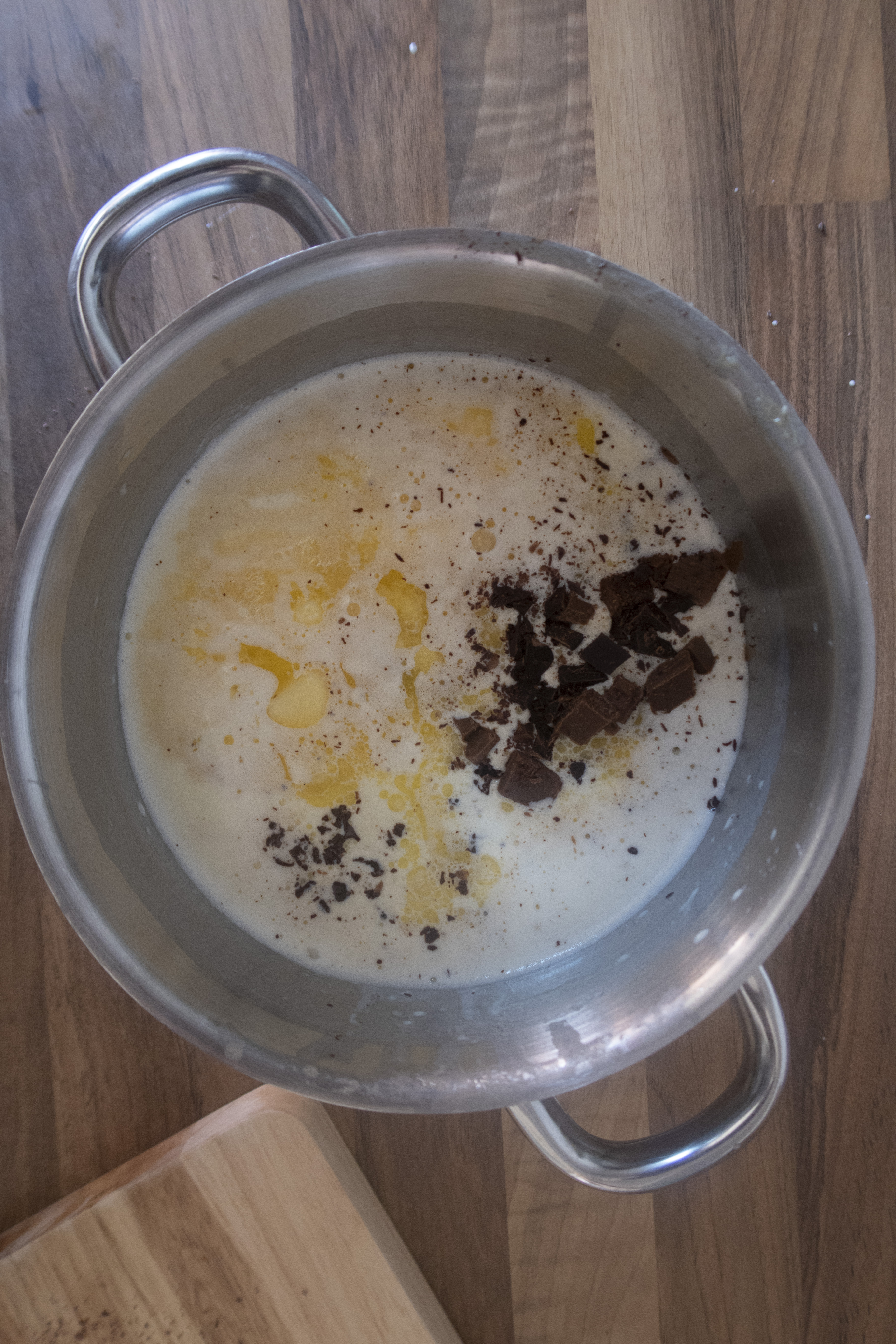 Zunächst bereitet ihr die Trüffelcreme vor. Das könnt ihr auch gerne schon am Vortag machen. Dazu hackt ihr die Schokolade und die Butter in kleine Stücke. Kocht die Sahne in einem Topf auf, nehmt diese wieder vom Herd und gebt die Schokolade sowie die Butter hinzu. Kurz warten und dann kräftig durchrühren, bis alles gut vermischt ist. Alles in eine Schüssel geben und ab damit in den Kühlschrank.