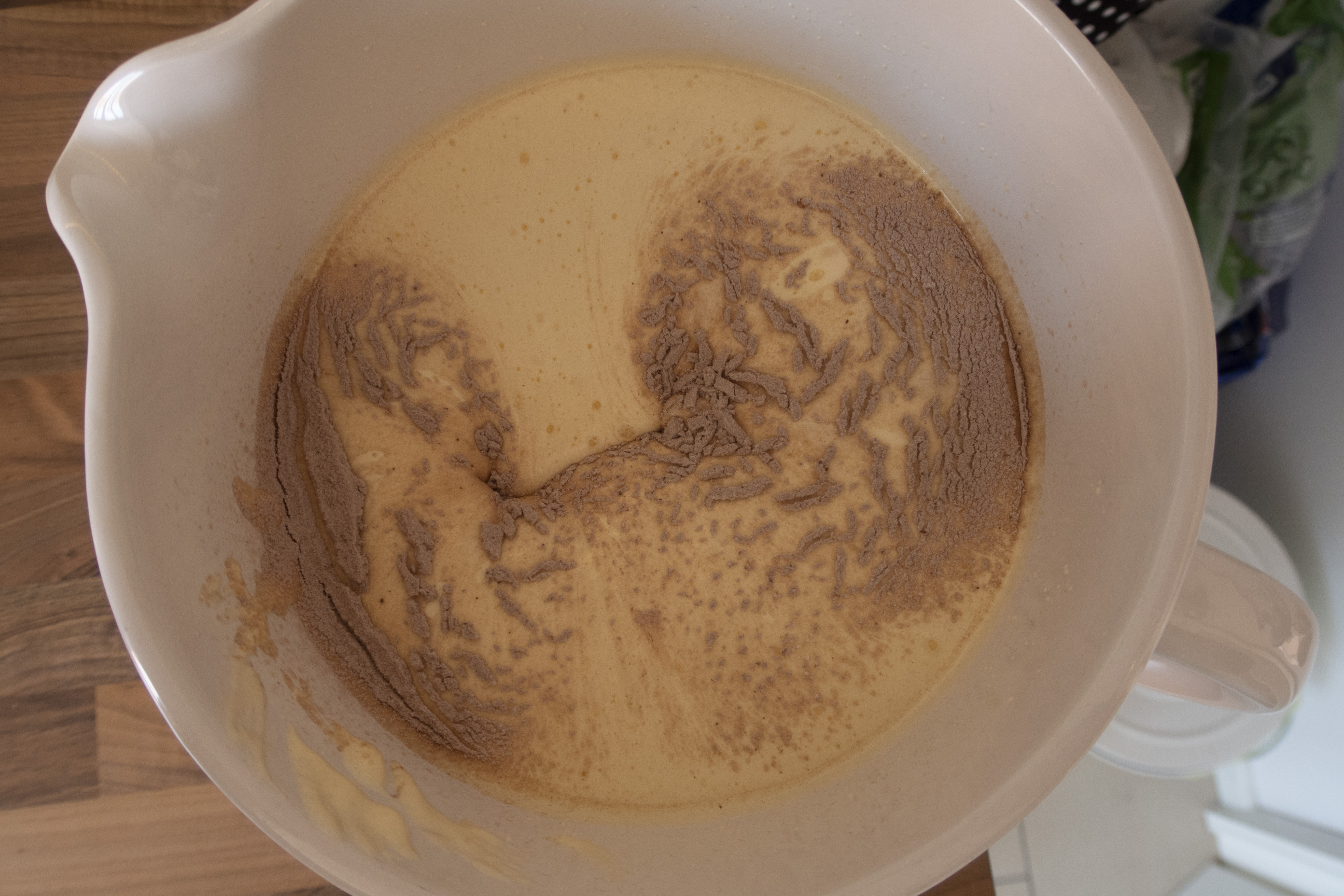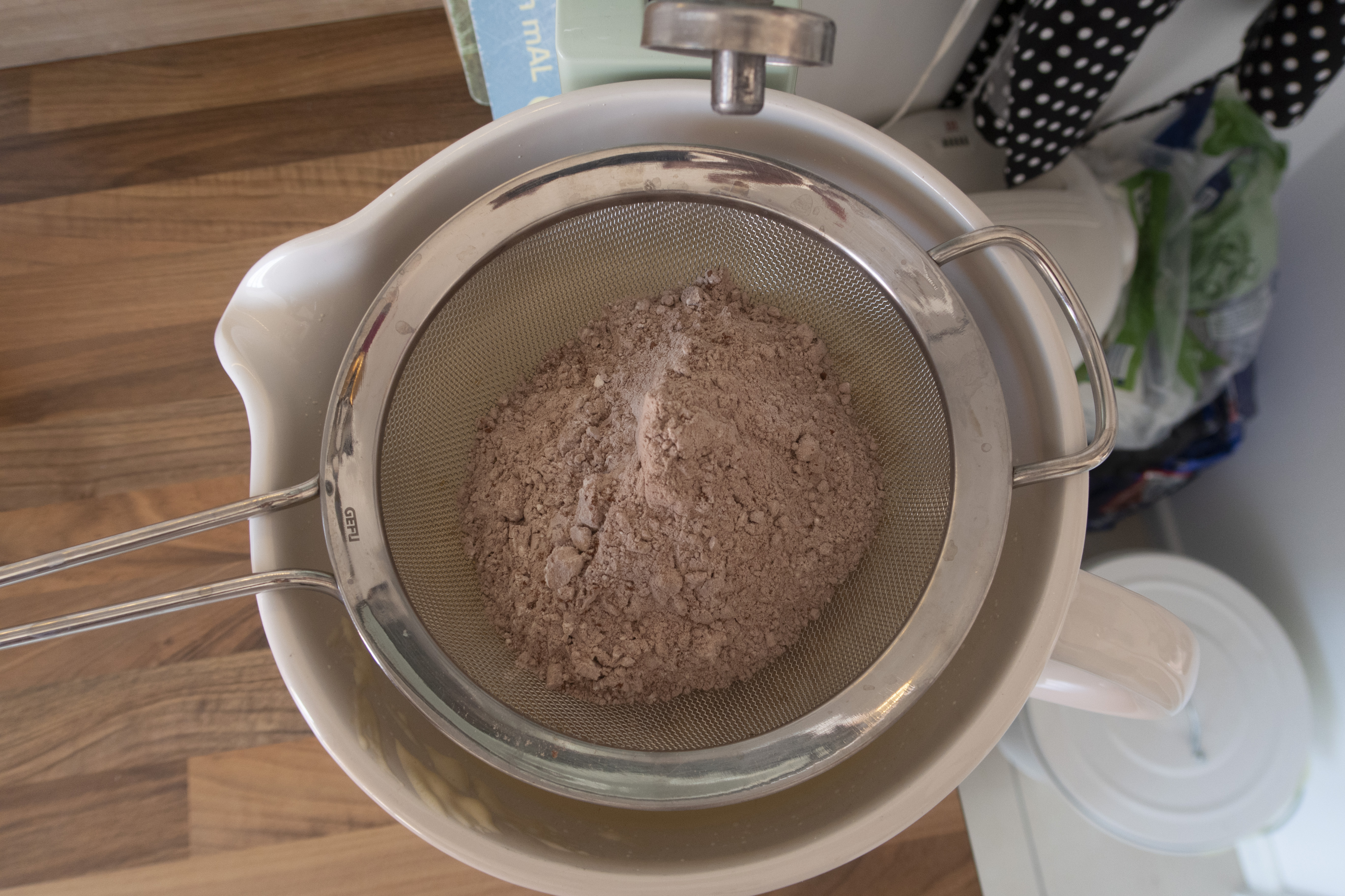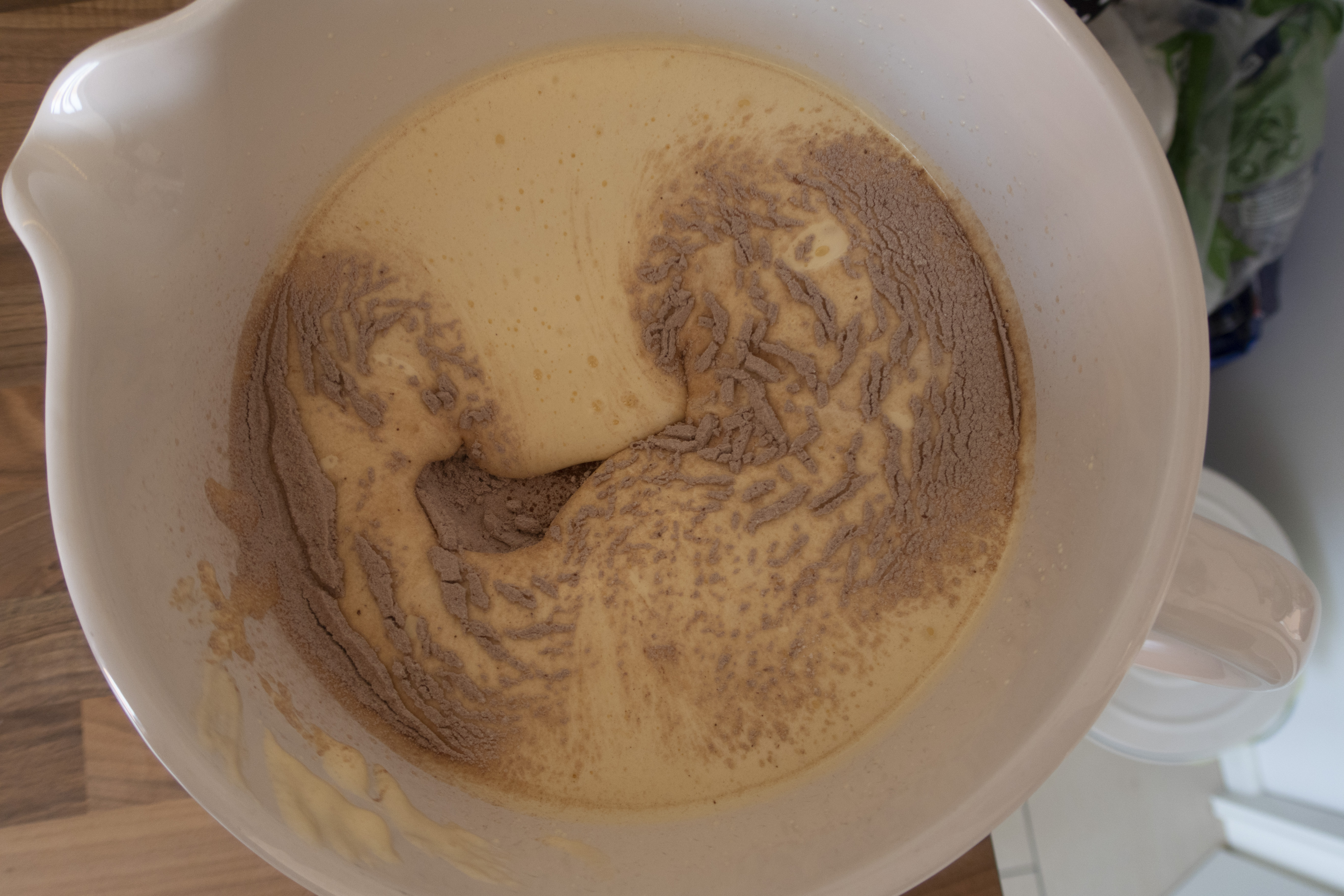 Schmelzt die Butter und lasst diese abkühlen. Gebt die kompletten Eier mit dem Getreidezucker in eine Rührschüssel und schlagt diese hell und cremig auf. Das kann schon mal bis zu 10 Minuten dauern. Hinterlässt der Rührbesen in der Eiermasse eine kleine Spur und hat die Masse deutlich an Volumen gewonnen, dann ist es genau richtig. Mischt das Mehl mit dem Kakao und dem Salz und siebt alles in die Eiermasse. Dabei geht ein Teil der Mehlmischung sehr schnell unter, sodass euer Teig wie ein fressender Smiley aussieht. Glaubt ihr nicht? Dann seht euch meine Fotos an (ihm scheint es zumindest zu schmecken). Gebt nun auch noch die flüssige Butter hinzu und hebt alles vorsichtig unter. Nicht zu kräftig, damit euch das Volumen bestehen bleibt.