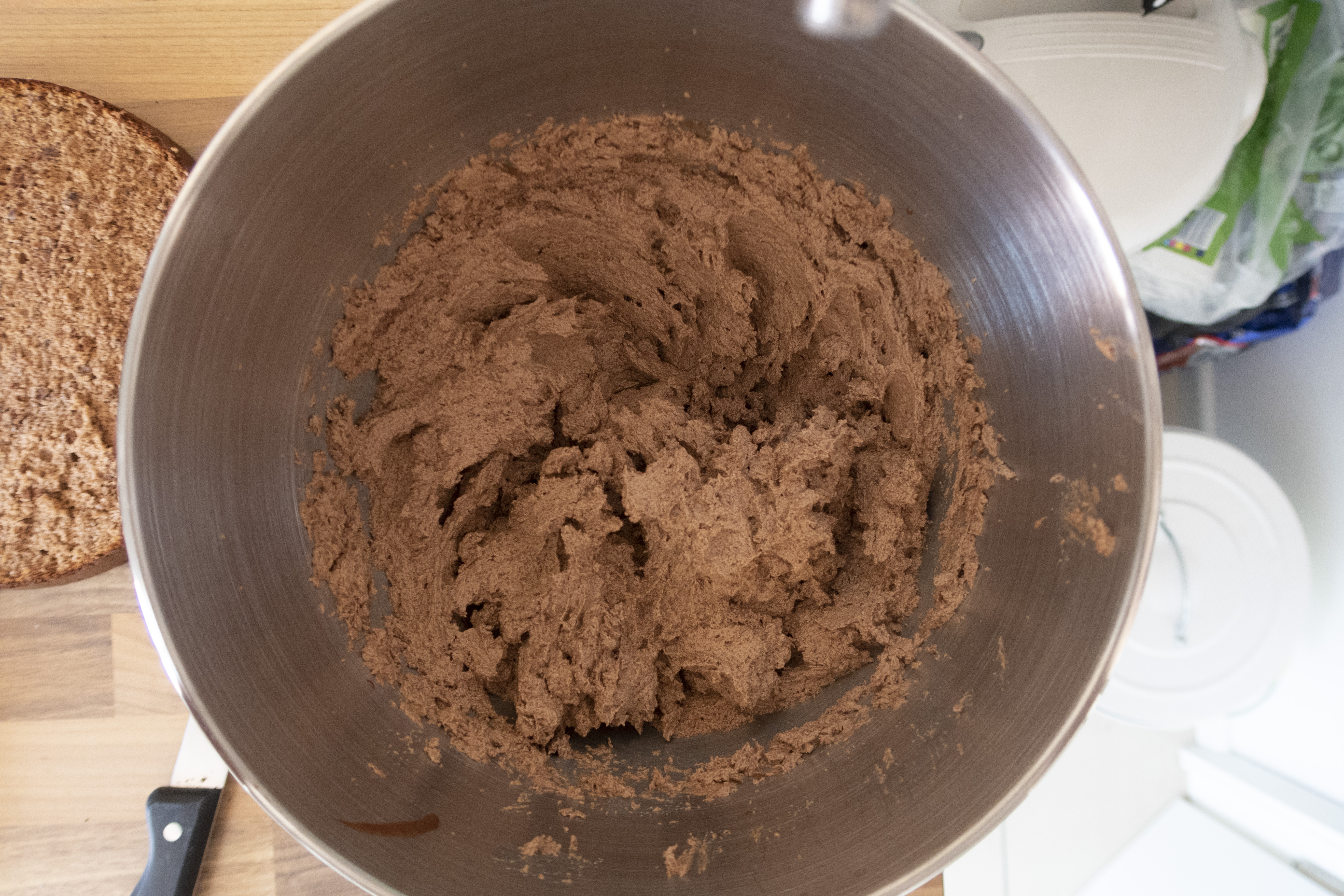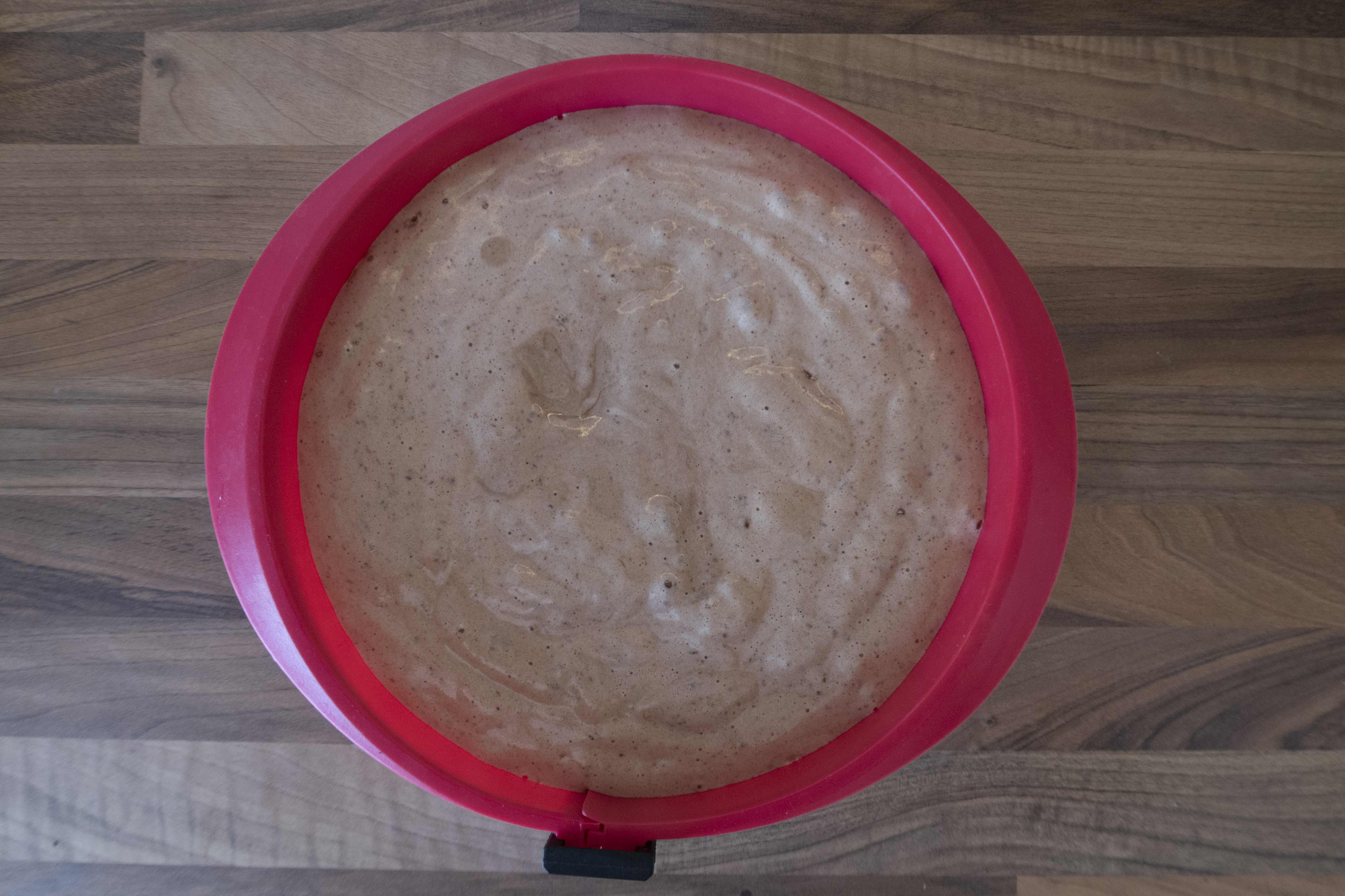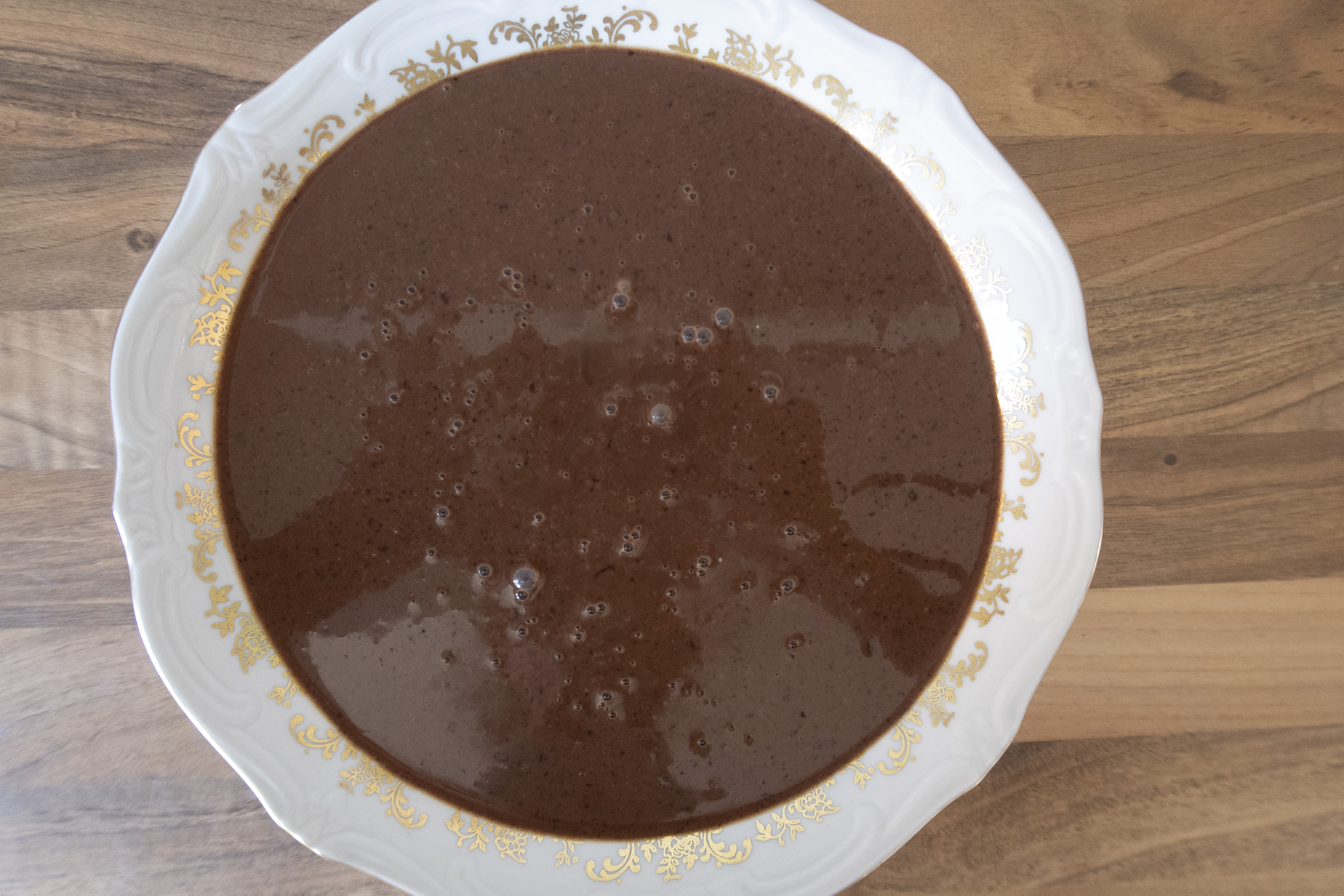 Schmelzt die Butter und lasst diese abkühlen. Gebt die kompletten Eier mit dem Getreidezucker in eine Rührschüssel und schlagt diese hell und cremig auf. Das kann schon mal bis zu 10 Minuten dauern. Hinterlässt der Rührbesen in der Eiermasse eine kleine Spur und hat die Masse deutlich an Volumen gewonnen, dann ist es genau richtig. Mischt das Mehl mit dem Kakao und dem Salz und siebt alles in die Eiermasse. Dabei geht ein Teil der Mehlmischung sehr schnell unter, sodass euer Teig wie ein fressender Smiley aussieht. Glaubt ihr nicht? Dann seht euch meine Fotos an (ihm scheint es zumindest zu schmecken). Gebt nun auch noch die flüssige Butter hinzu und hebt alles vorsichtig unter. Nicht zu kräftig, damit euch das Volumen bestehen bleibt.