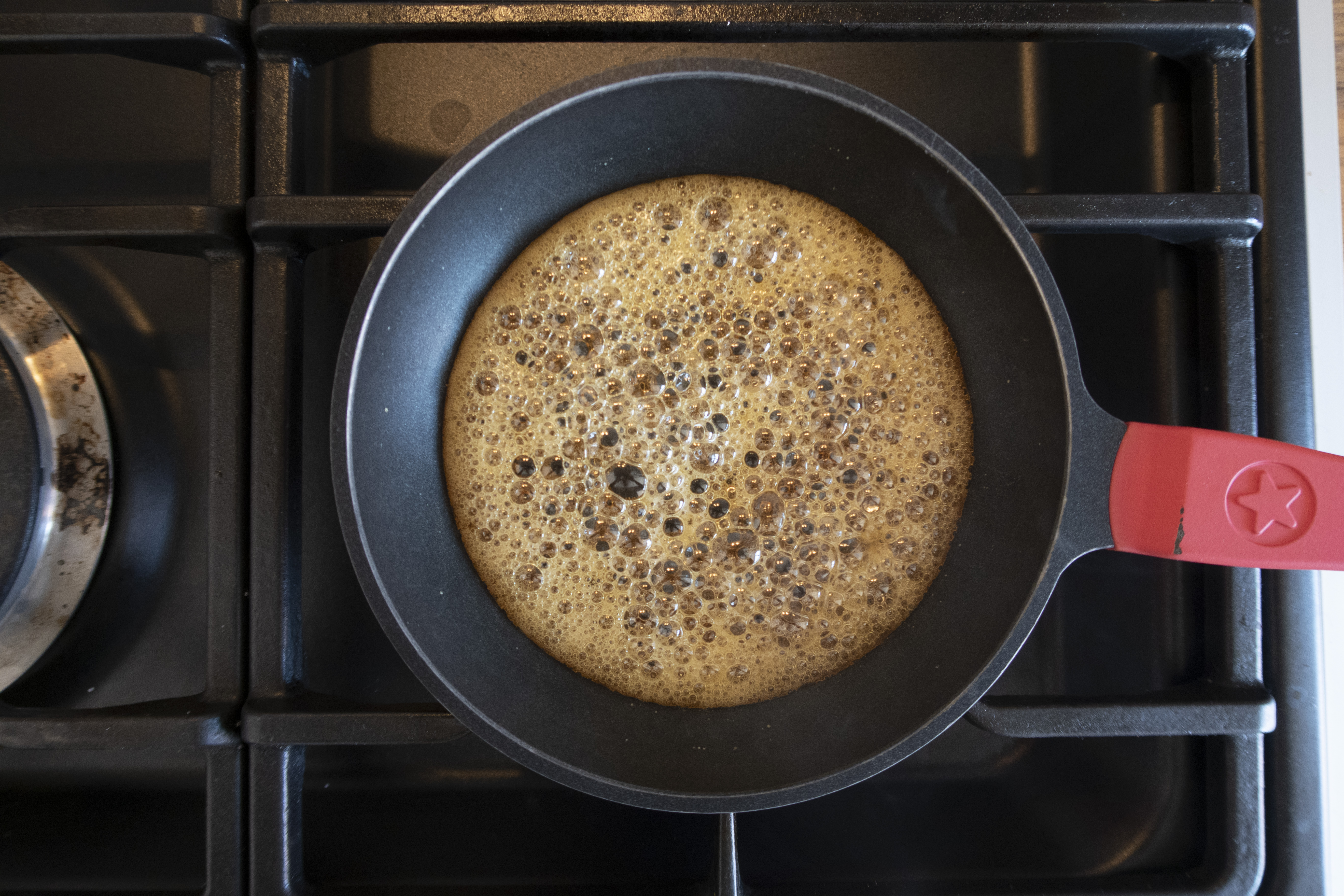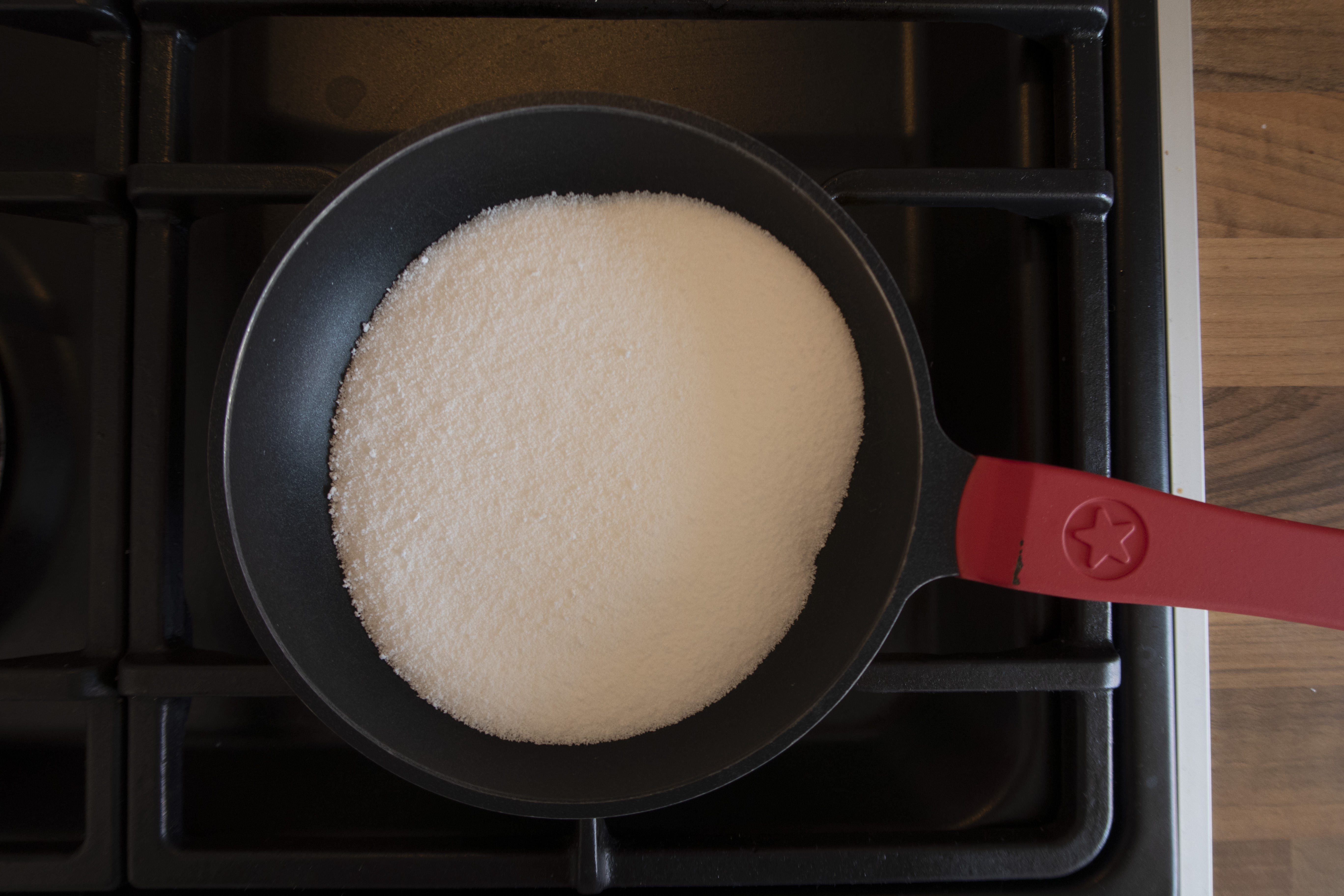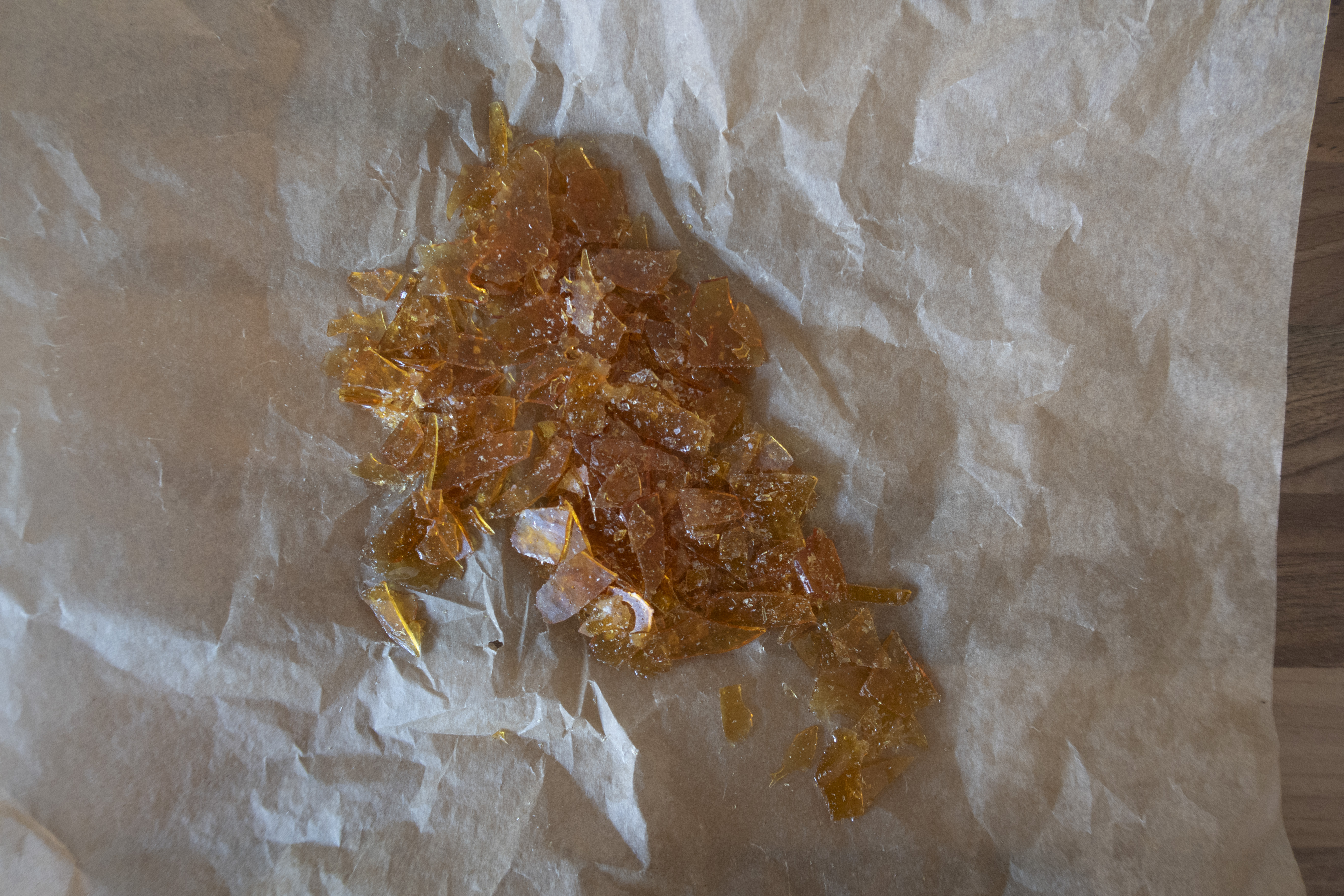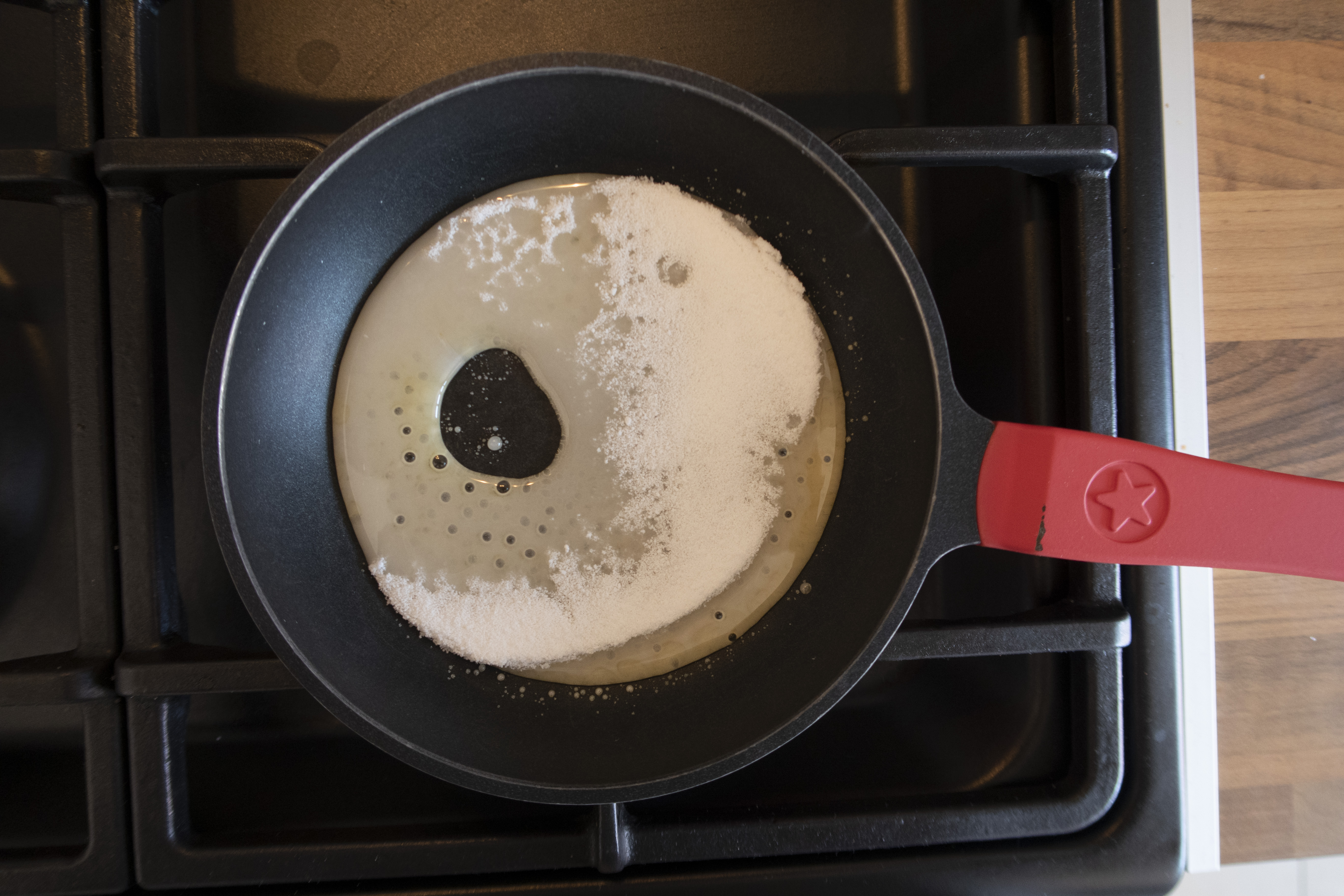 Jetzt fehlt noch das Karamell: gebt den Getreidezucker in eine kleine Pfanne und schmelzt diesen vorsichtig bei mittlerer Hitze. Sobald ihr eine typische Karamellfarbe habt (Achtung, das geht sehr schnell), gebt ihr dieses auf ein Backpapier und streicht das Karamell glatt. Vorsichtig: Karamell ist sehr heiß! Ich weiß, wovon ich spreche: ich habe nicht gut genug aufgepasst und leider einen kleinen Spritzer auf meine Nase bekommen – jetzt weiß ich wieder, warum es Sugar-Waxing gibt… Gebt nun noch etwas Salz auf das noch flüssige Karamell und lasst es abkühlen. Sobald es kalt ist, könnt ihr es in kleine Stücke zerhacken.