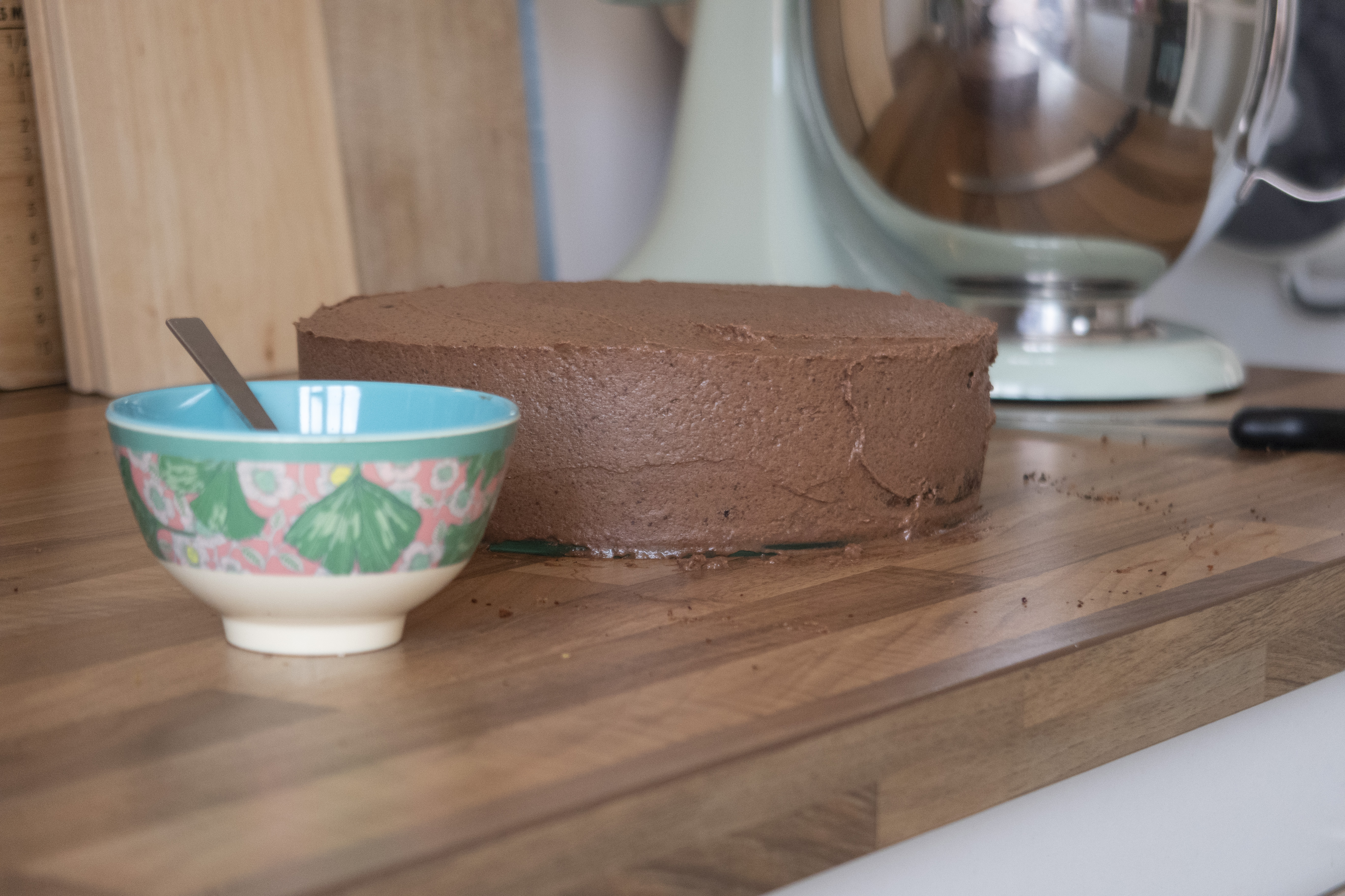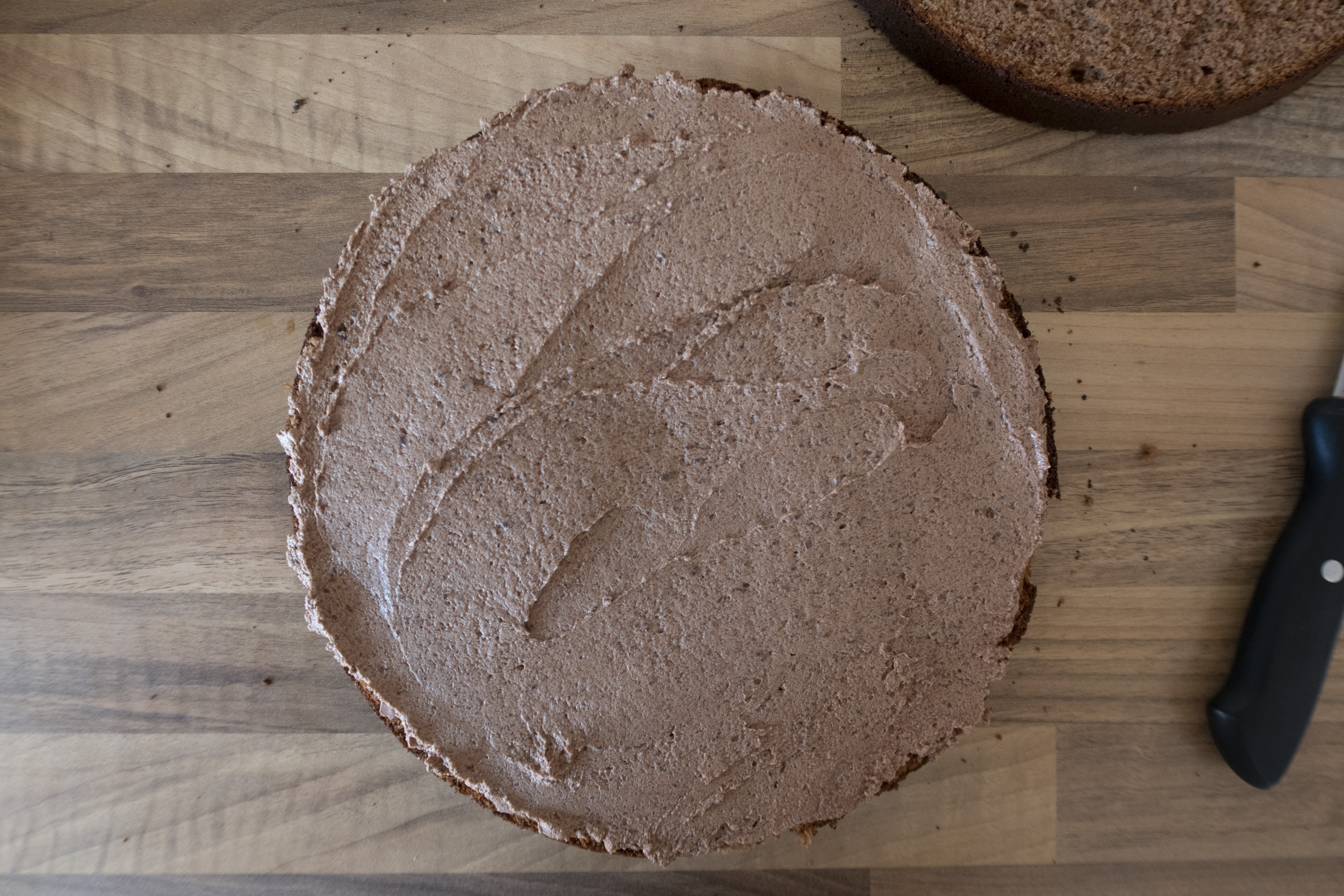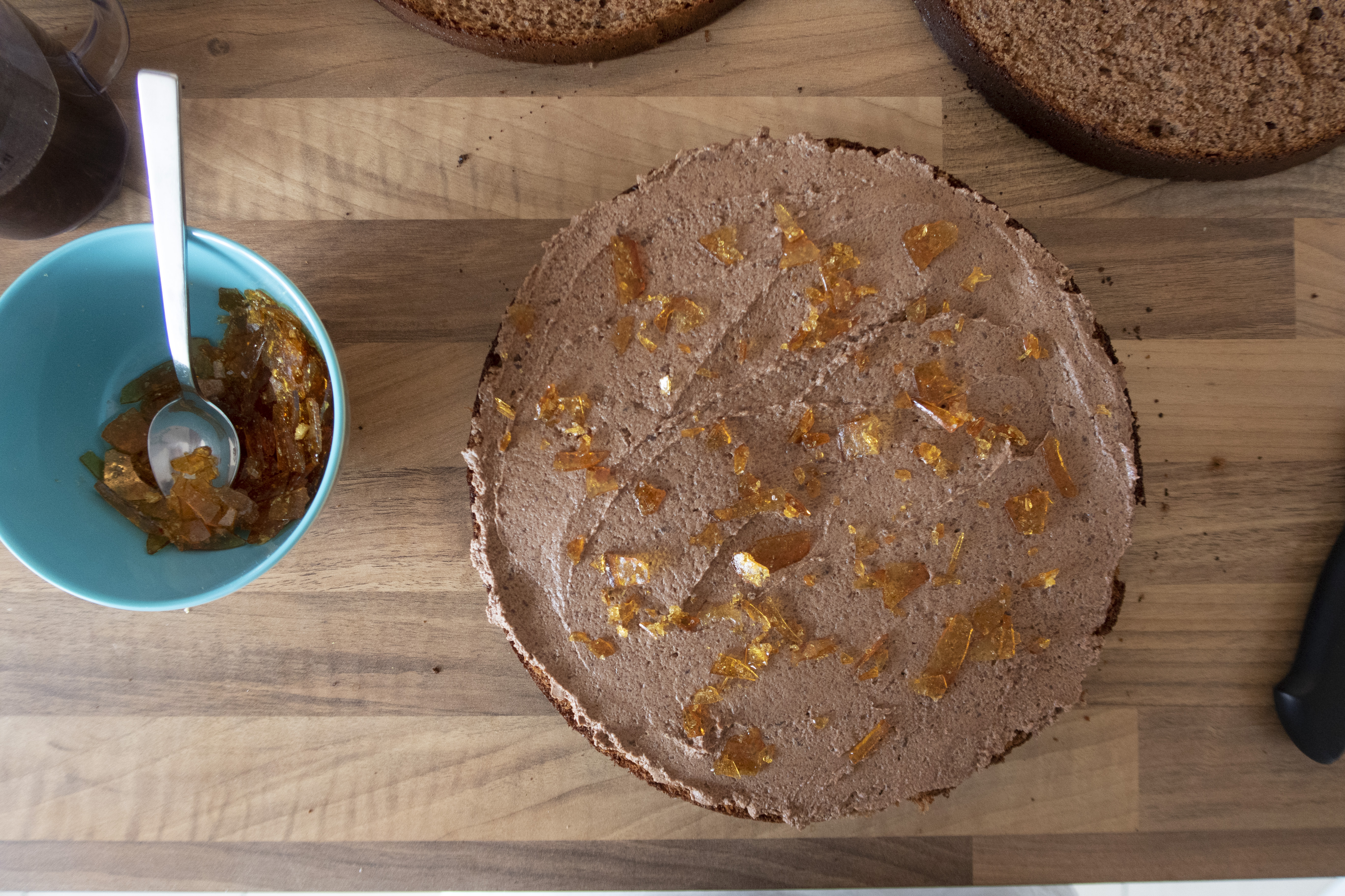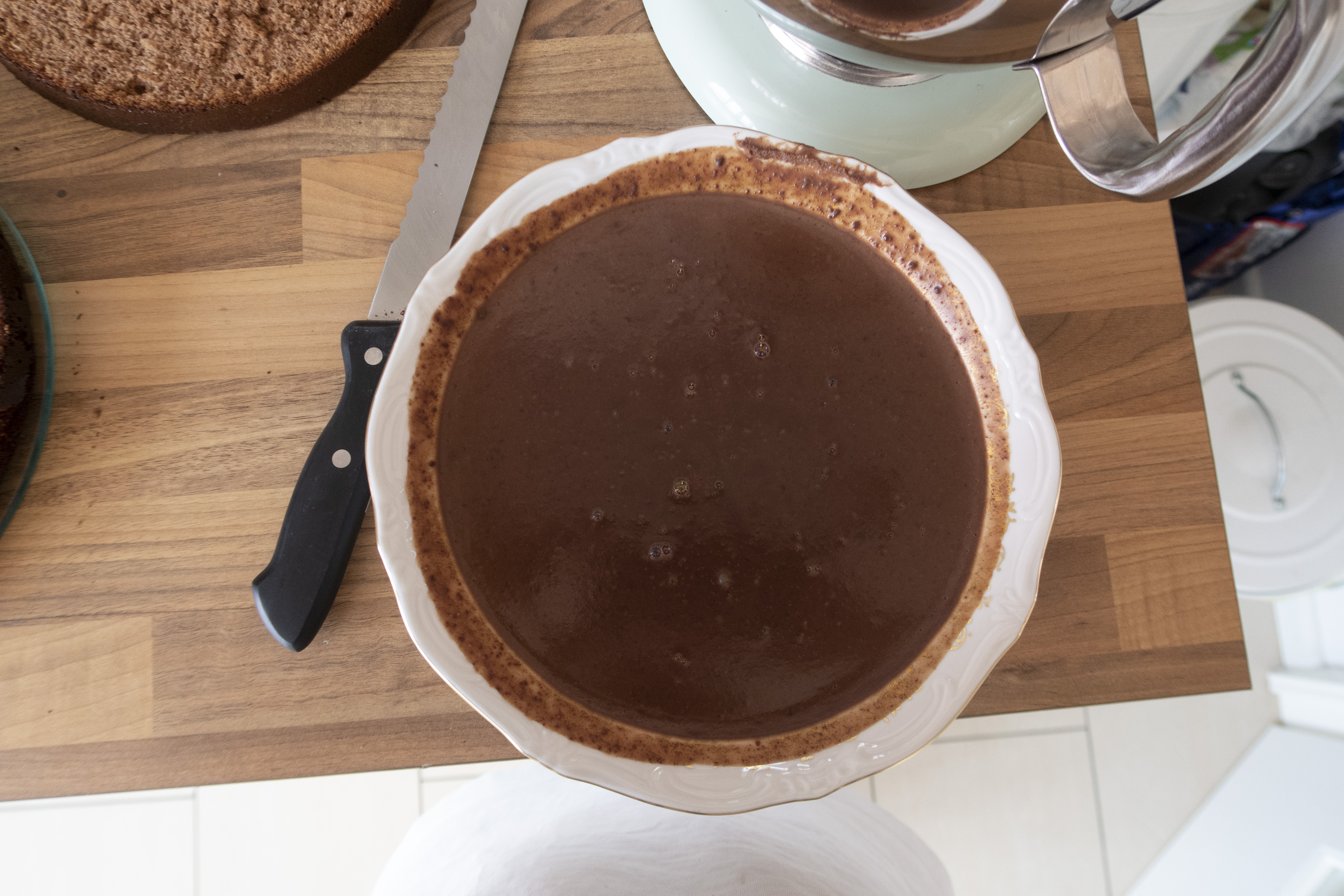 Schneidet nun den Buiskuit zweimal durch, damit ihr drei Böden erhaltet. Jetzt geht es ans Schichten: Legt den ersten Boden zurecht und tränkt ihn mit einem Drittel des Kaffees. Früher dachte ich immer, dass Tränken total unnötig ist. Da lag ich leider falsch. Da Torten normalerweise zum Abkühlen in den Kühlschrank kommen, trocknet der Buiskuit schnell aus. Die Tränke hilft dabei, dass die Torte weiterhin schön saftig bleibt. Auf den getränkten Buiskuit kommt ein Drittel der Trüffelcreme. Darauf gebt ihr etwas von den Karamellsplittern, somit gebt ihr der Torte mehr „Struktur“.
