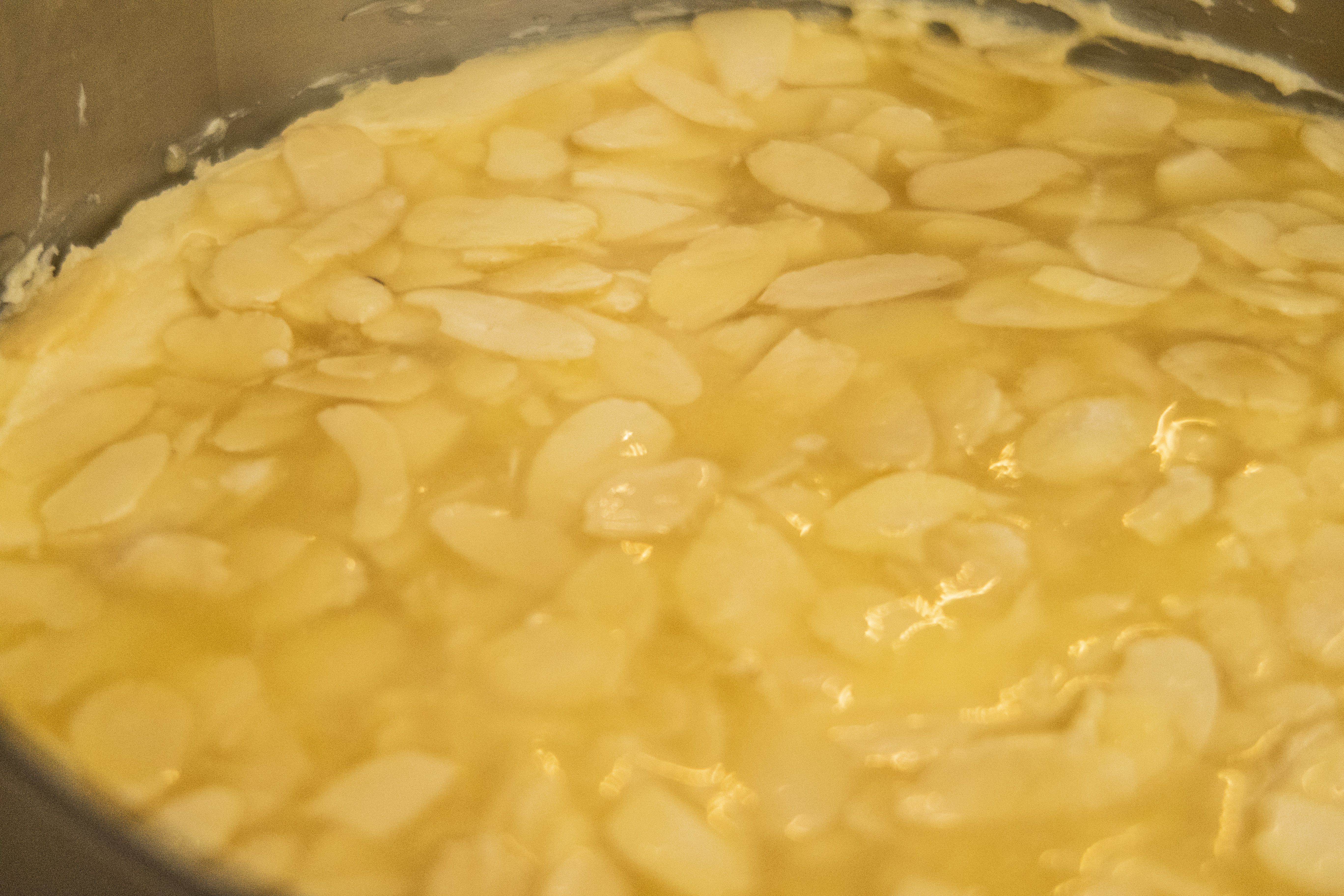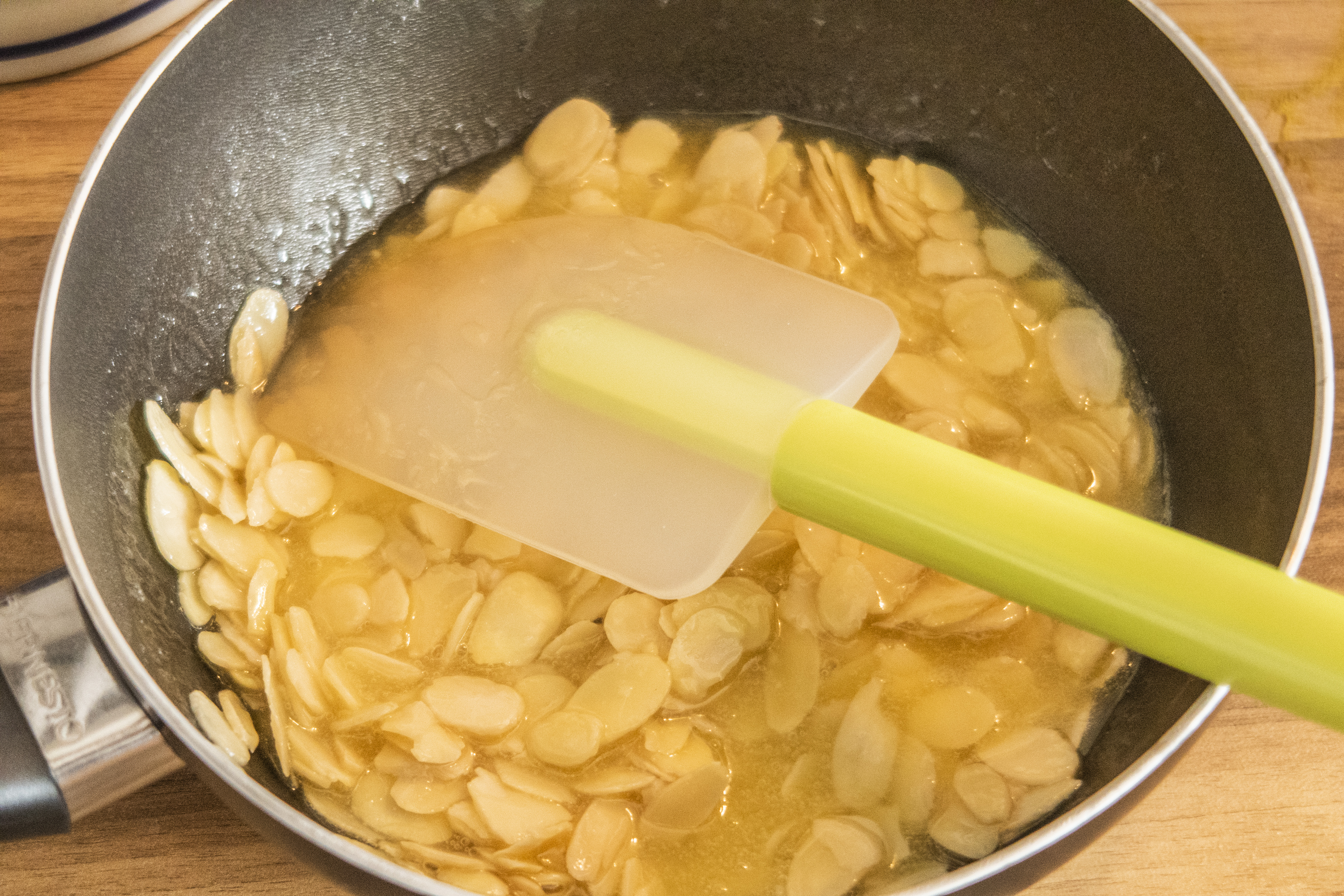 Zunächst bereiten wir den Mandelbelag vor. Dafür gebt ihr die Butter, den Reissirup und den Getreidezucker in einen Topf und schmelzt alles bei geringer bis mittlerer Hitze. Gebt dann die Mandelblättchen hinzu, rührt sie gut unter und lasst alles abkühlen.