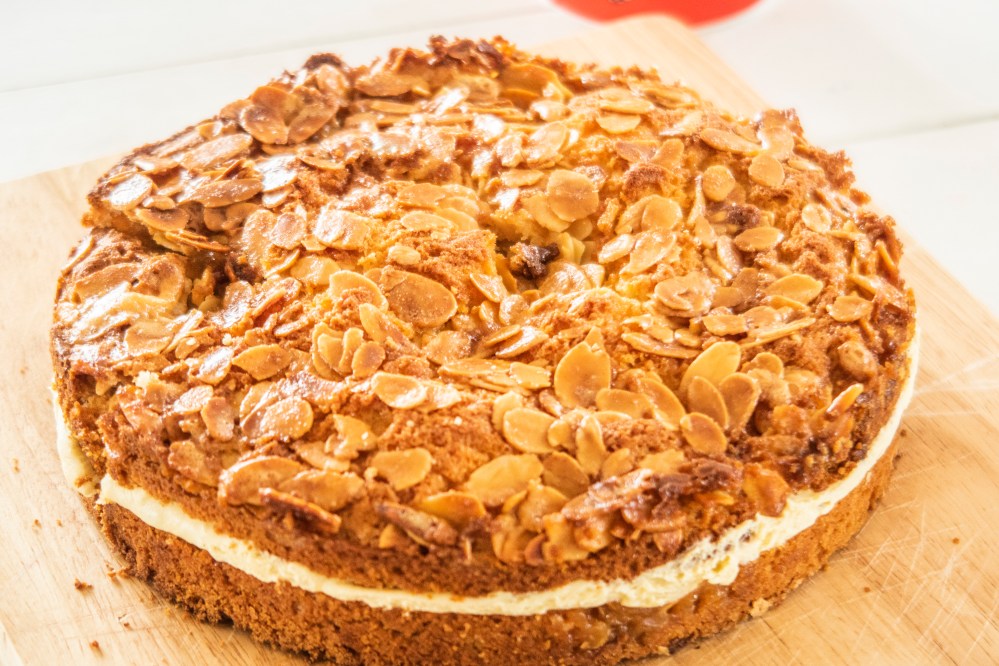 Ist alles weit genug abgekühlt, rührt ihr die weiche Butter schaumig. Fügt die Creme esslöffelweise hinzu und verrührt alles kräftig miteinander. Schneidet den Kuchen einmal in der Mitte durch, gebt die Vanillecreme auf den Boden und setzt den Deckel (mit der Mandelkruste oben) wieder darauf. Am besten gebt ihr für diesen Schritt den Kuchen wieder in die Springform, dann kann euch die Creme nicht abhanden gehen. Nun kommt der Bienenstich noch einmal für etwa 2 Stunden in den Kühlschrank bis ihr in Servieren könnt (oder in die Tiefkühltruhe, wenn ihr nicht so lange warten könnt).