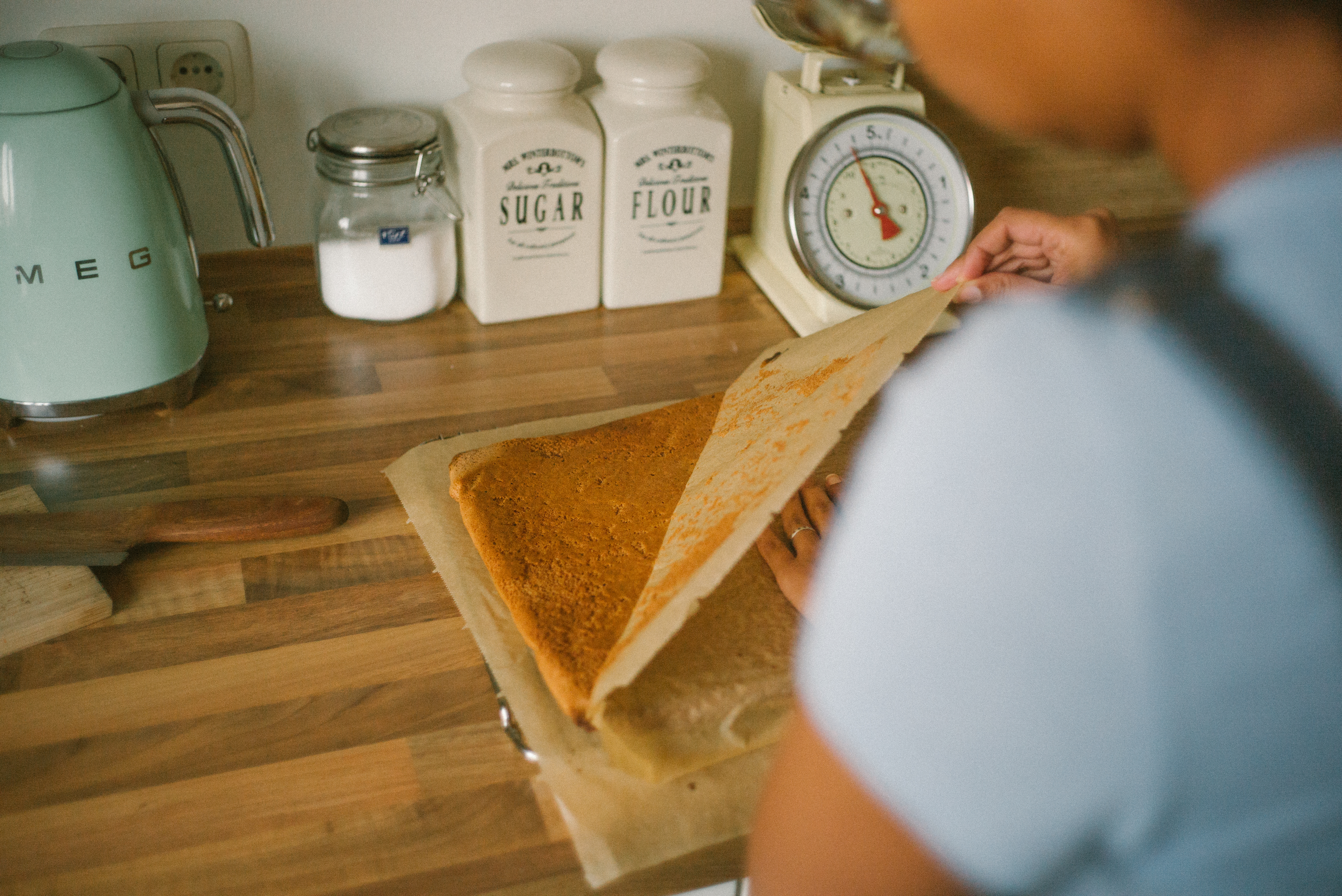 Nehmt den Biskuitkuchen aus dem Ofen und stürzt ihn auf ein zweites Backpapier. Entfernt vorsichtig das Backpapier, das ihr mit im Backofen hattet. Lasst den Teig auskühlen.