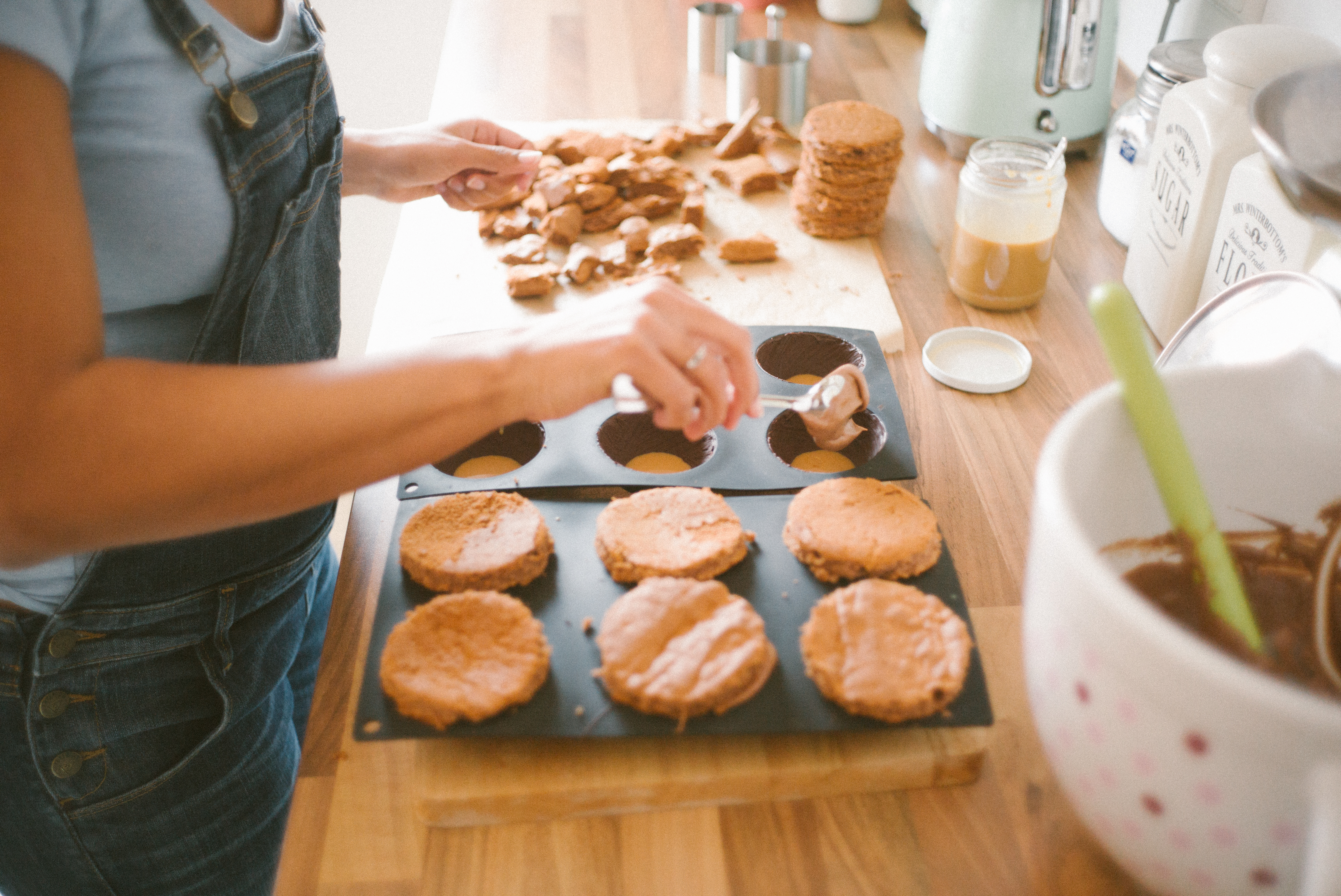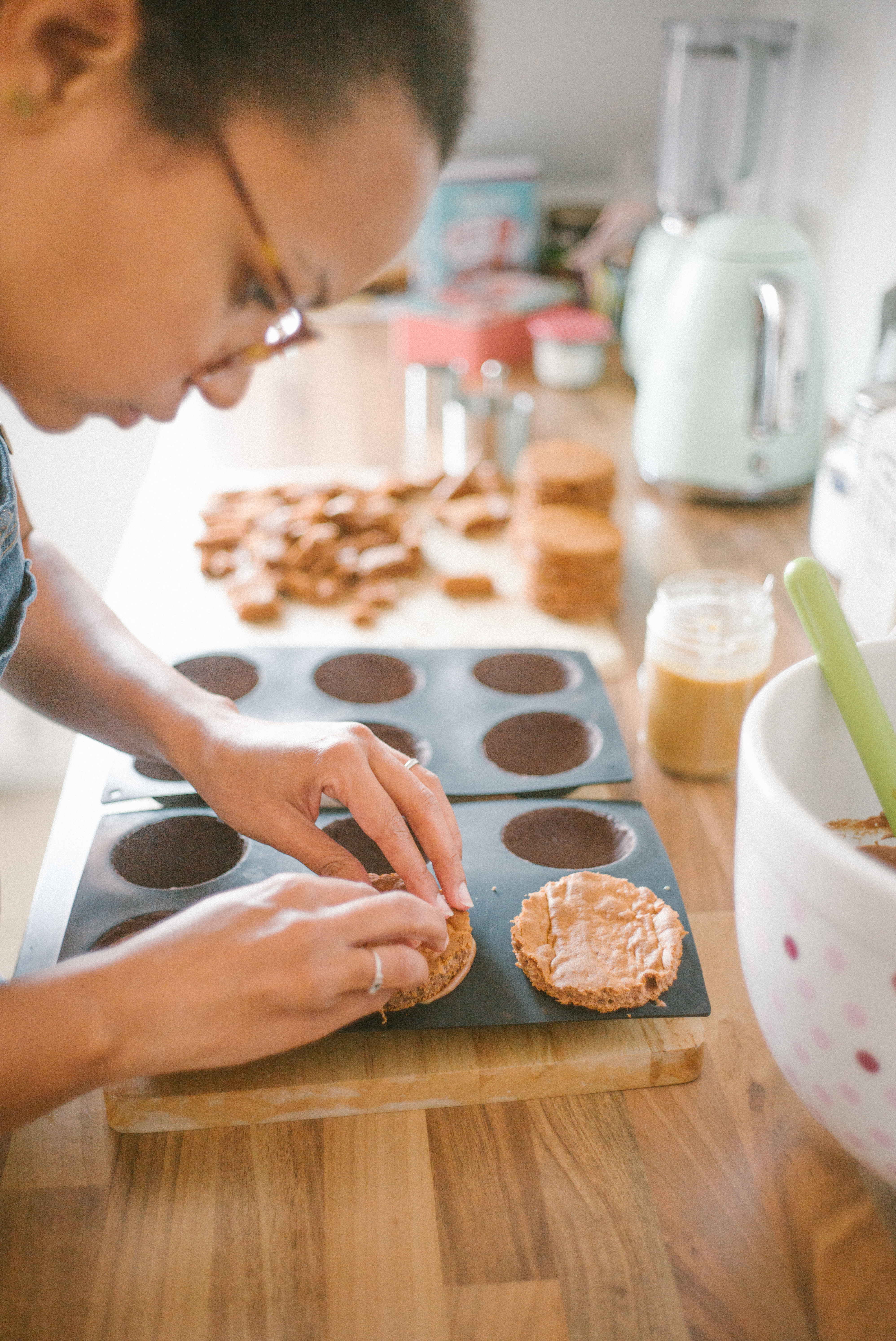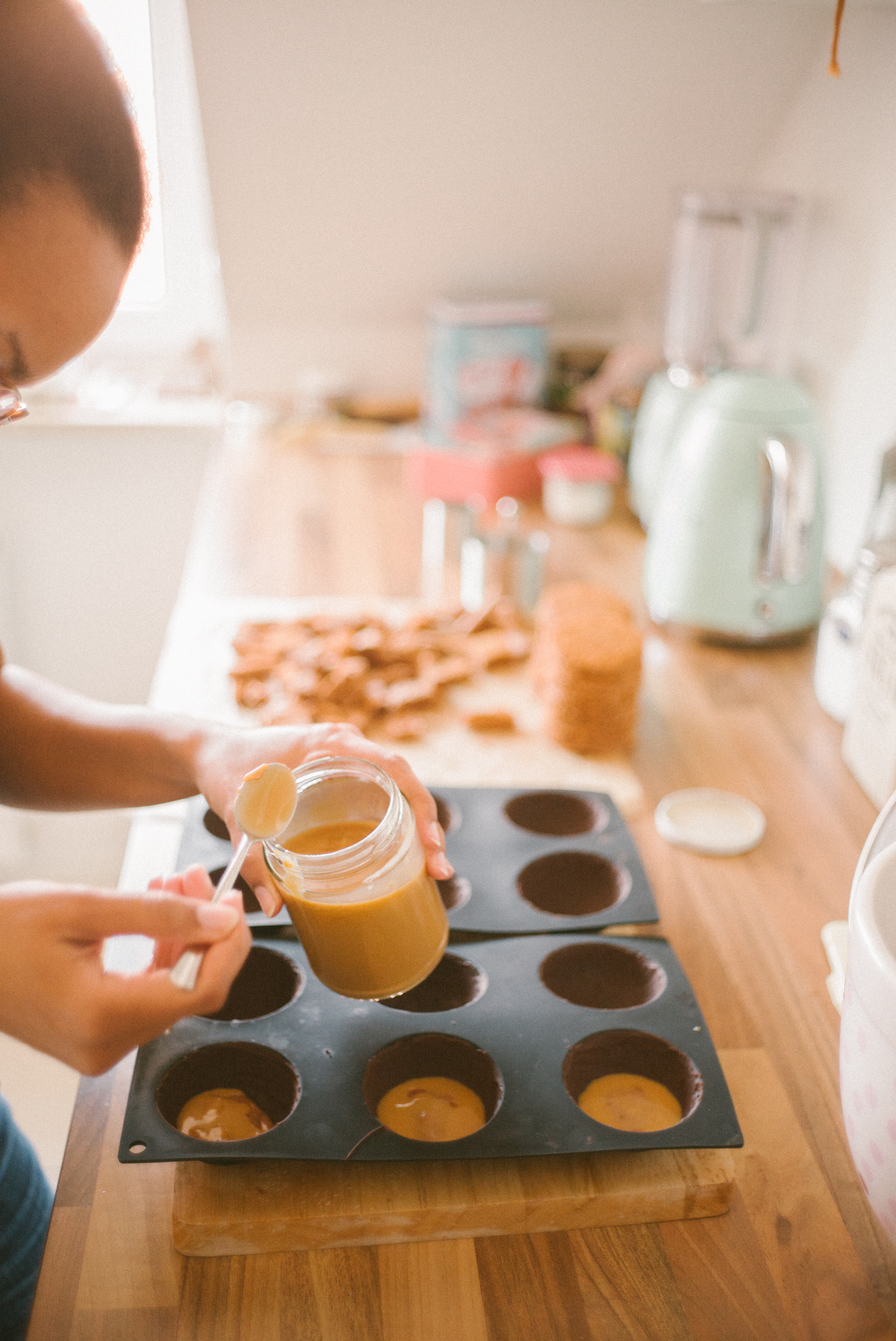 Dieses mal hatte ich die Ehre, dass wir Besuch von einem lieben Freund aus Valencia hatten und er mir vorgeschlagen hat, dass er gerne Fotos von mir beim Backen machen kann. Da konnte ich natürlich nicht nein sagen! Da er auch schon super tolle Bilder von unseren Hochzeitstorten geschossen hatte, wusste ich, was mich bei ihm erwartet. Und damit sich das auch gleich richtig lohnt, habe ich mir auch ein besonderes Rezept ausgedacht: Kuppeltörtchen mit einer Schokomousse, Karamell und Schokoladenbiskuit, umhüllt von Zartbitterschokolade.
