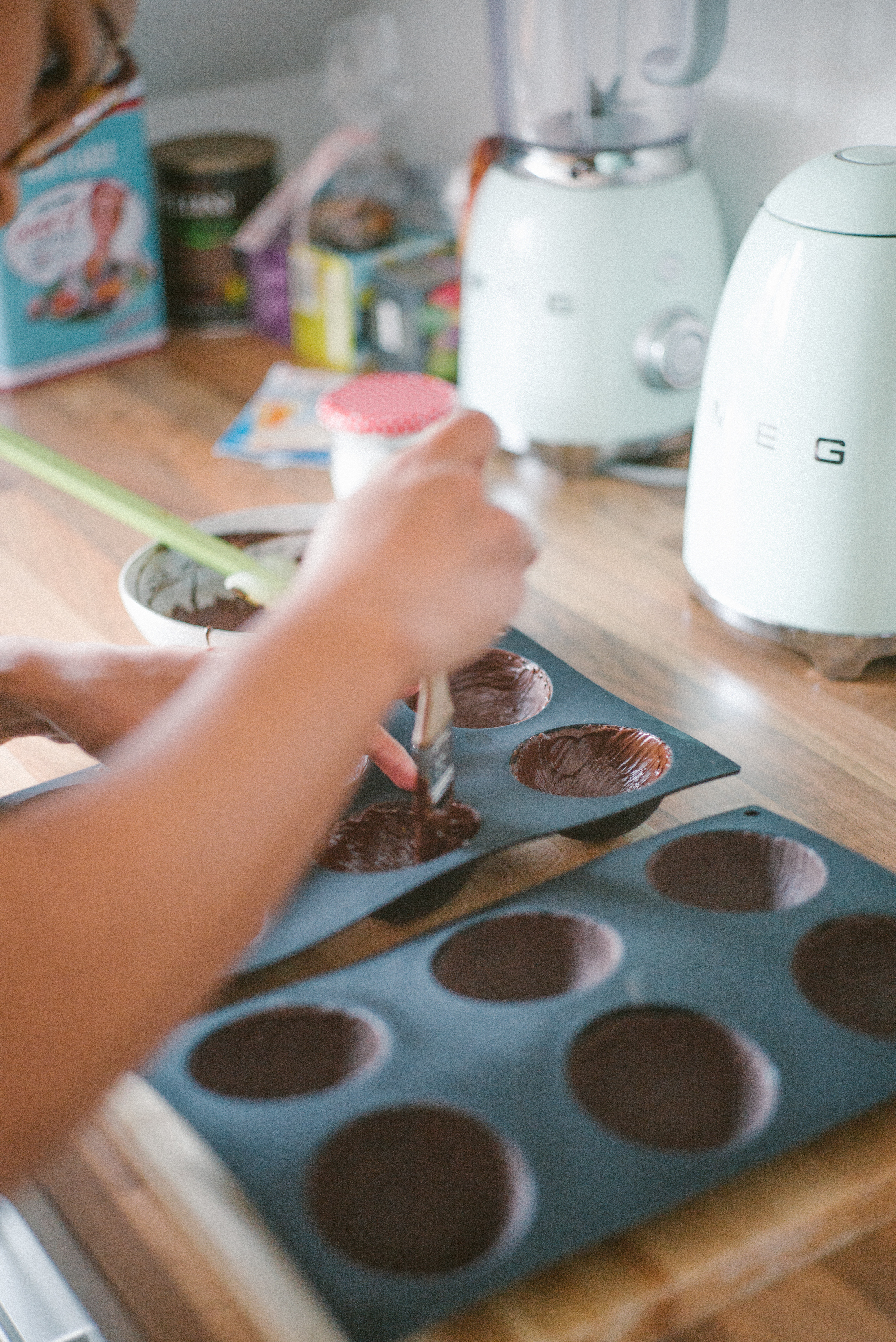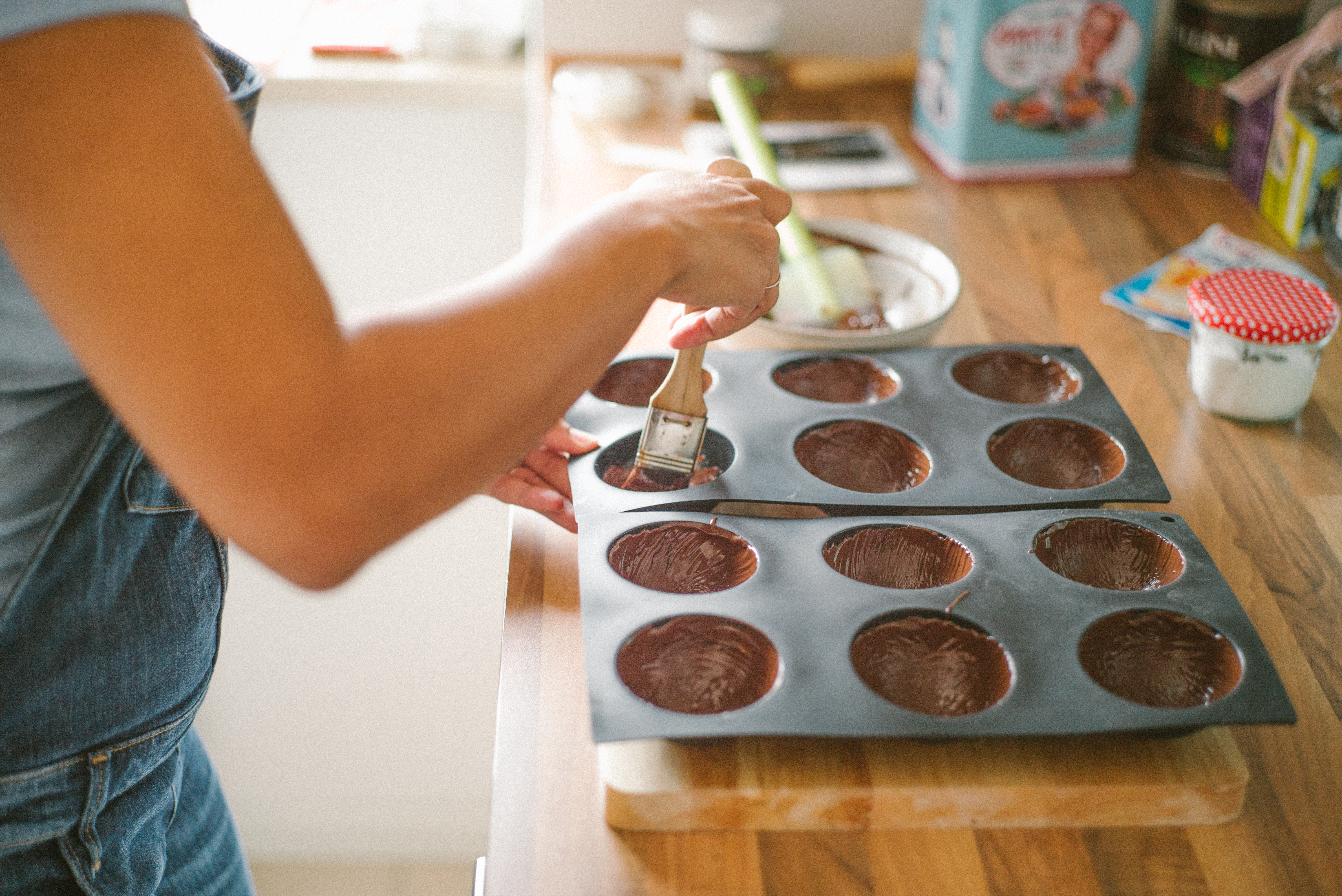 Nehmt eure Silikonform und streicht mit einem Backpinsel eine dünne Schicht auf. Ab damit in die Tiefkühltruhe für etwa 3 Minuten. Nehmt die Form wieder raus und streicht alle Kuppeln ein zweites Mal mit Schokolade ein. Passt auf, dass ihr keine Lücken habt, sonst könnt ihr hinterher die Törtchen nicht aus der Form nehmen. Wieder zurück damit in die Tiefkühltruhe.