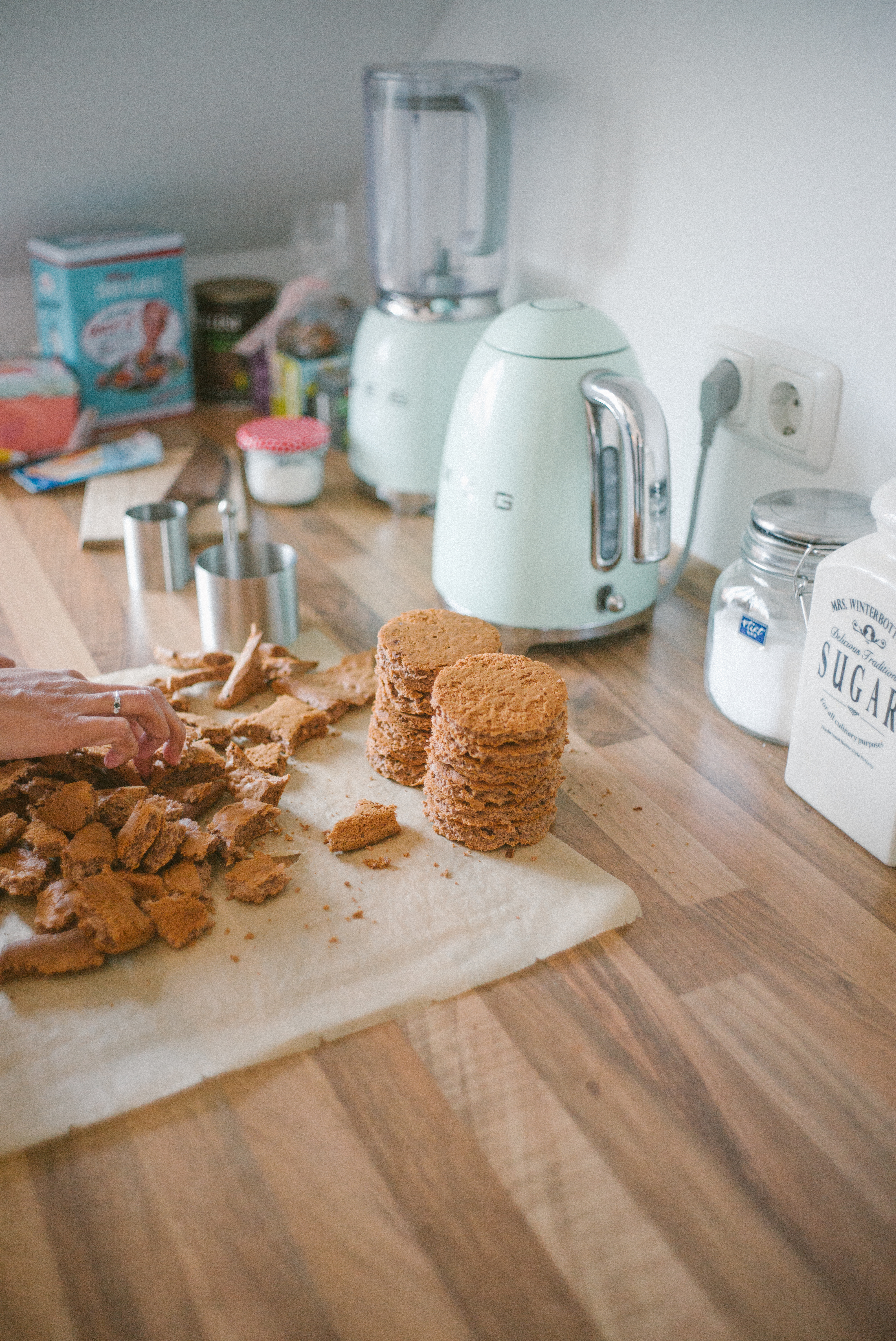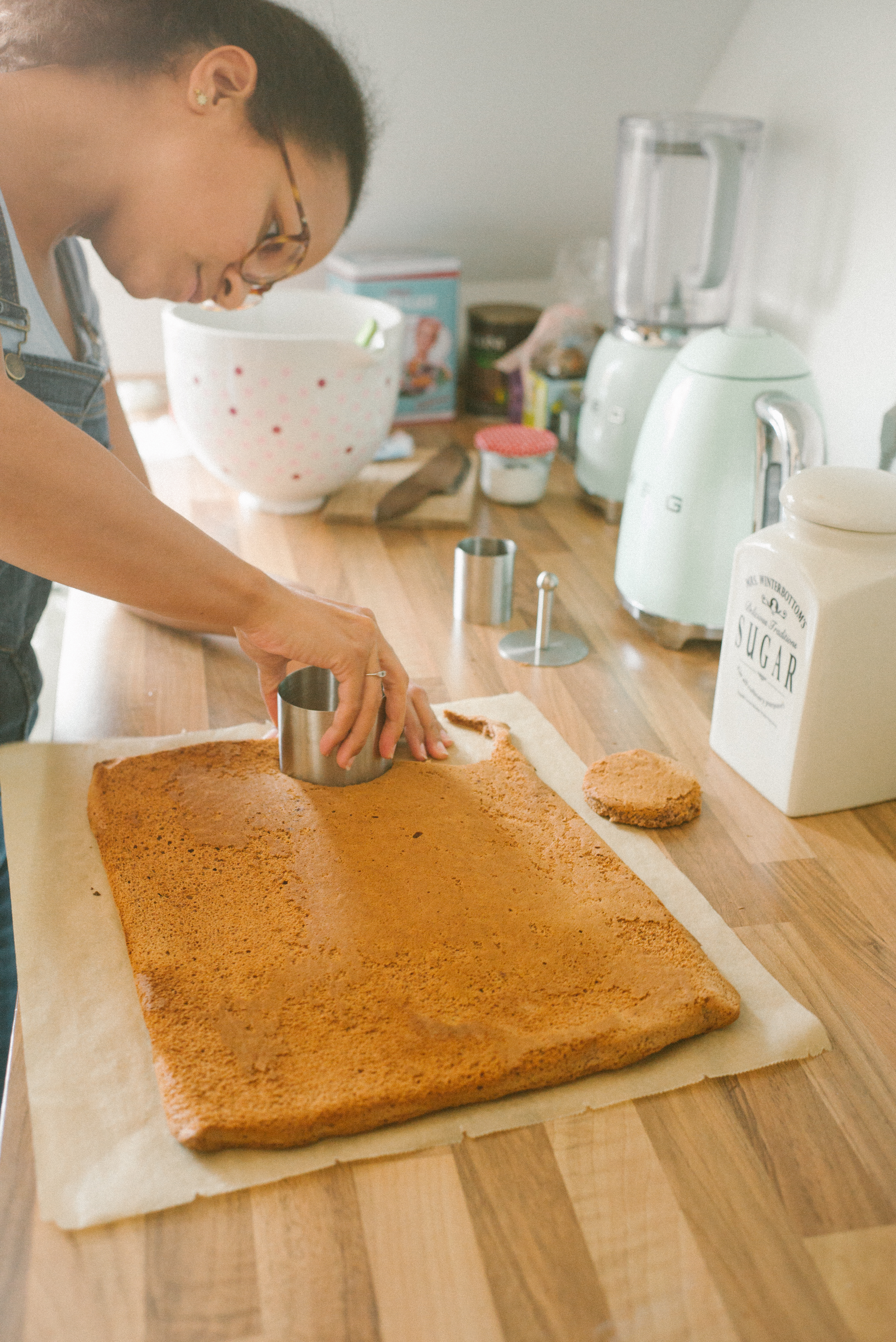 Aus dem Biskuit stecht ihr nun Kreise im Durchmesser (oder etwas größer) eurer Silikonkugeln aus. Dafür könnt ihr ein Glas nehmen, kleine Törtchen-Ringe oder einfach einen Kreis aus Karton nehmen, den ihr mit Hilfe eines Messers ausstecht. Den übrigen Biskuit könnt ihr in kleine Stücke brechen.