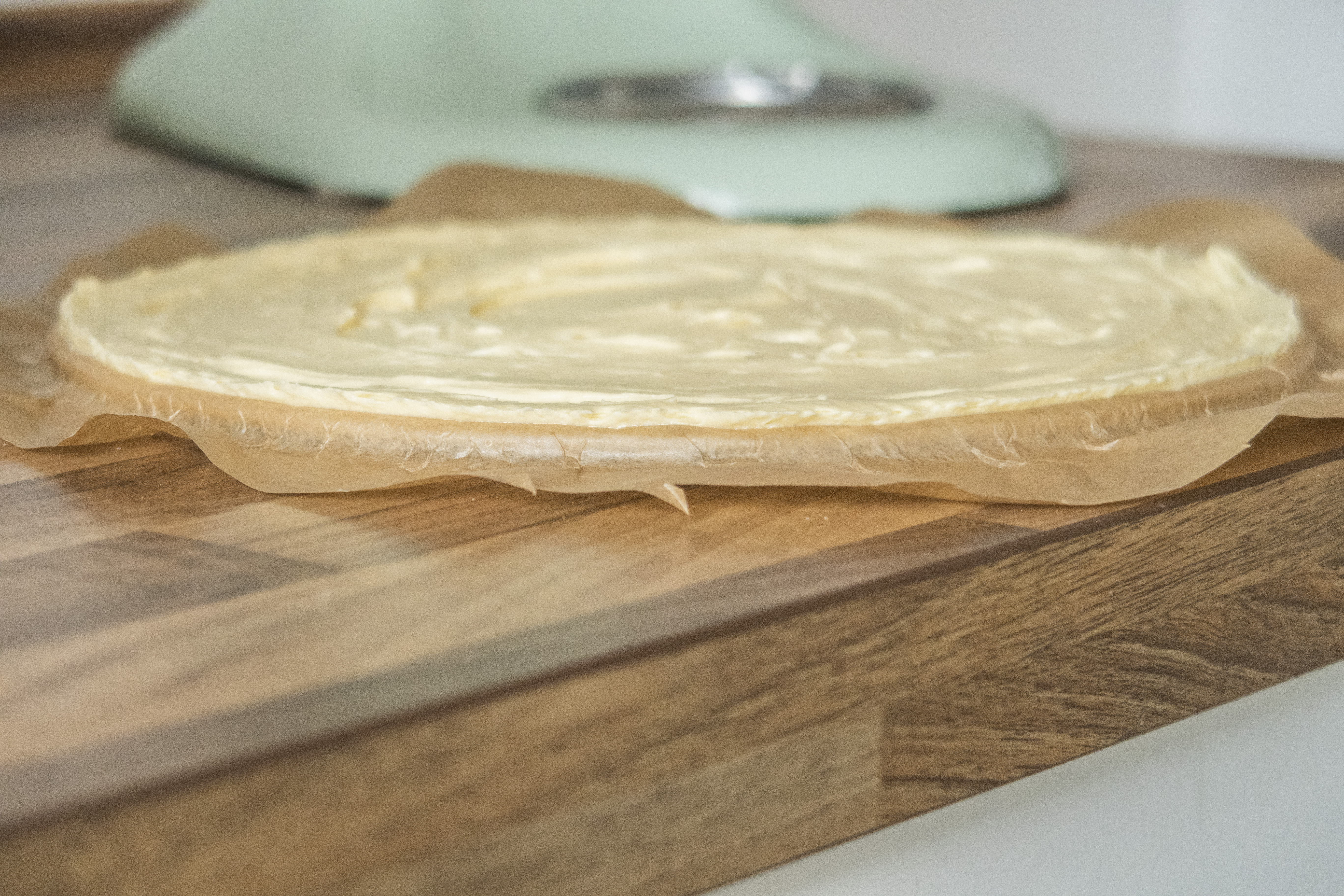 Nehmt euch nun den Boden einer Springform, gebt Backpapier darauf und gebt 1/8 des Teiges darauf und verstreicht alles gleichmäßig. Wie schon erwähnt, meine ersten Böden waren etwas zu dick, weil ich mich nicht allzu dünn getraut habe, aber der Teig geht im Ofen noch auf durch das Backpulver. Ihr könnt euch vorstellen, dass der Teig in etwa einem Pfannkuchen entspricht (nicht einem Eierkuchen – der ist zu dick). Achtet einfach darauf, dass der komplette Boden gleichmäßig bedeckt ist und ihr zum Rand hin nicht zu dünn werden. Dann geht der Boden (ohne Springformrand) für etwa 8 Minuten in den Ofen. Solltet ihr zwei Springformen haben, könnt ihr diese Zeit nutzen und den nächsten Boden vorbereiten. Lasst alle Böden anschließend komplett auskühlen.