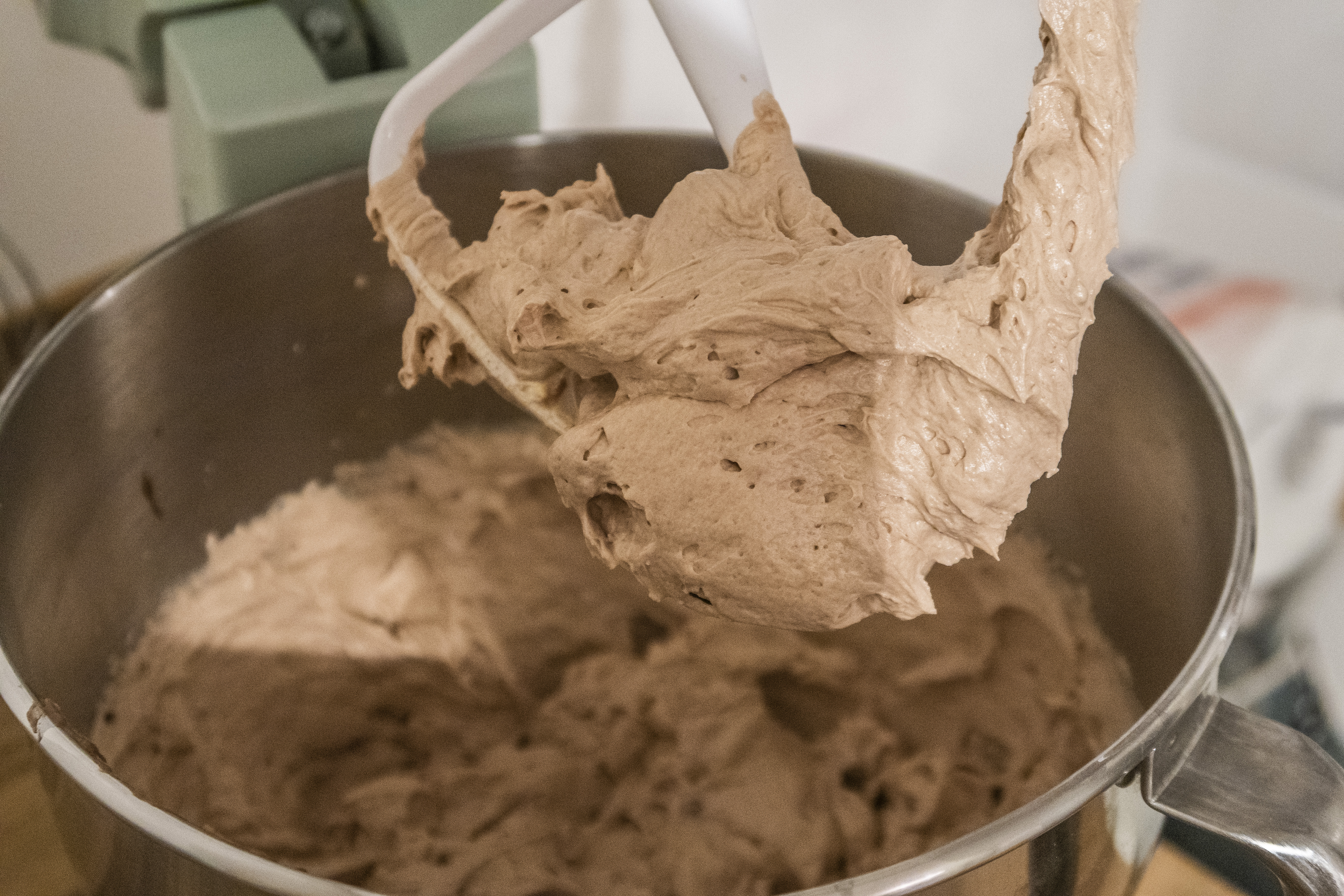 Für den Teig schlagt ihr die Butter, zusammen mit dem Getreidezucker, dem Vanille-Getreidezucker und dem Salz auf, bis sich alles gut verbunden hat und ihr eine homogene Masse habt. Nun schlagt ihr die Eier einzeln ein. Das nächste Ei kommt immer erst dazu, wenn sich das vorherige komplett mit der Buttermasse verbunden hat.