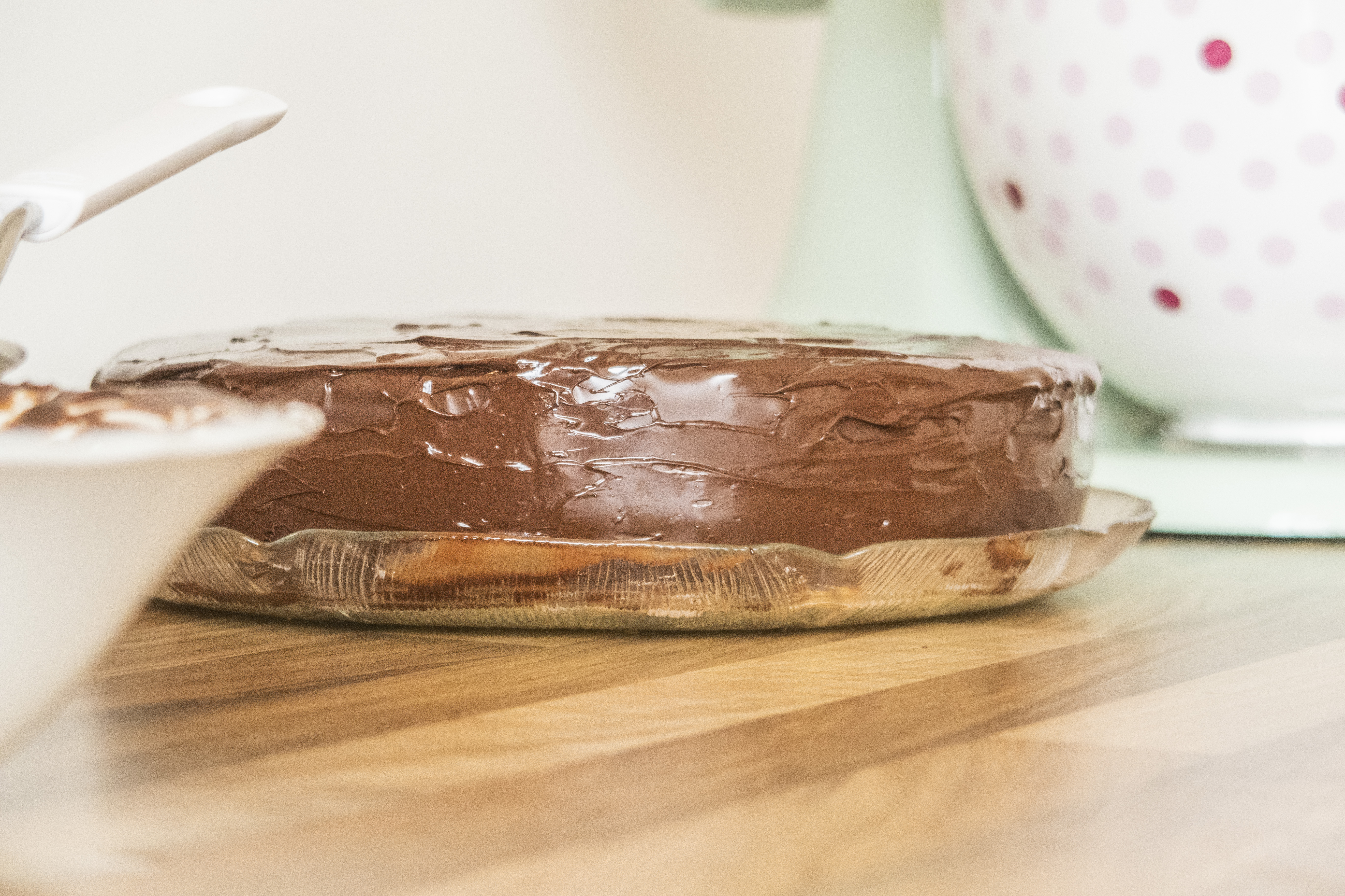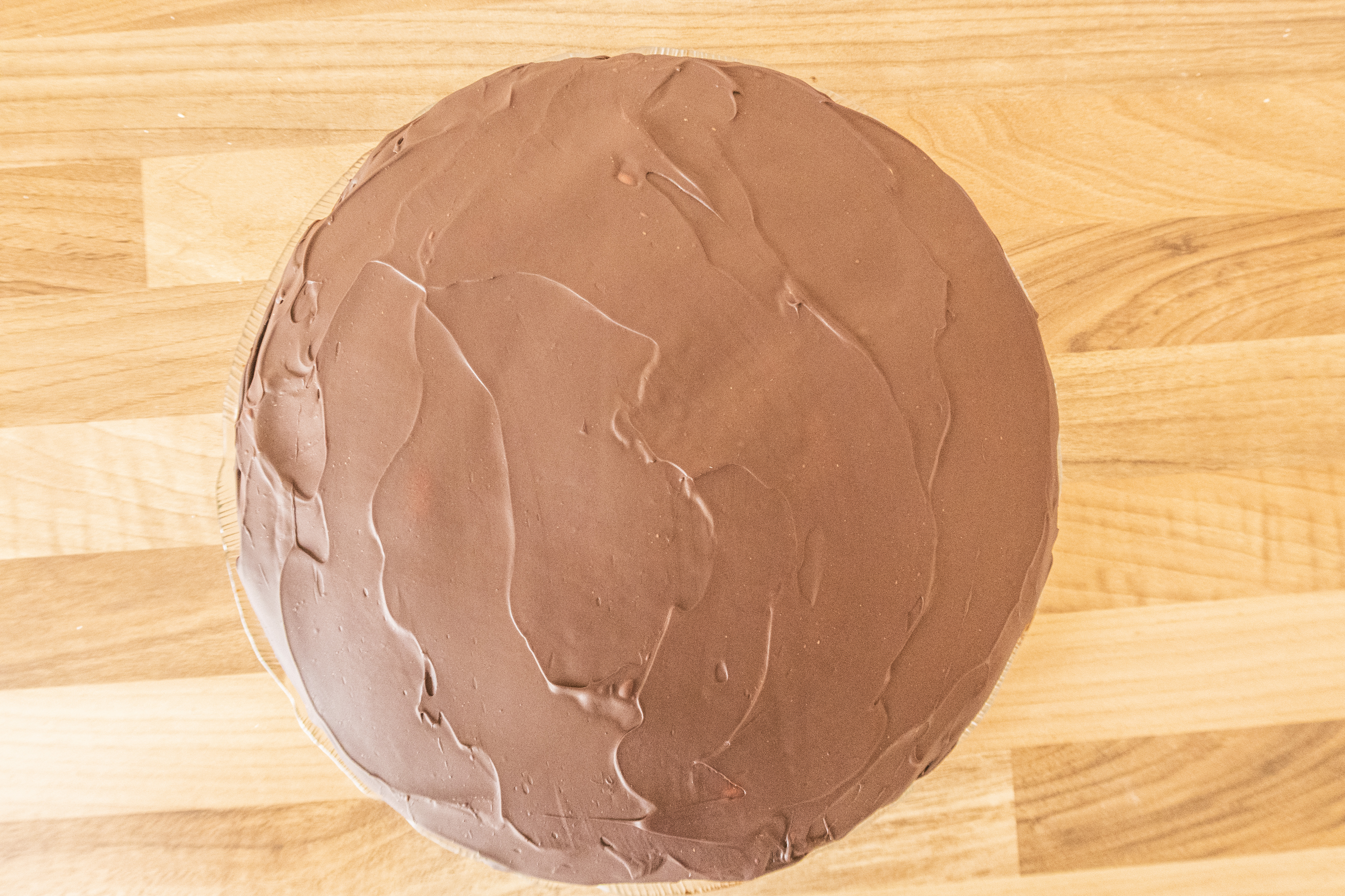 Nehmt eure durchgekühlte Torte aus dem Kühlschrank und gebt die Schokoglasur von der Mitte aus darauf und streicht sie gleichmäßig nach außen. Da der Untergrund sehr kalt ist, zieht die Schokolade recht schnell an, daher sollte man sich bei diesem Schritt beeilen (das ist auch der Grund, warum ich davon leider keine Fotos machen konnte, auch ich musste mich sputen). Vergesst auch nicht den Rand der Torte und streicht sie komplett mit Schokolade ein. Wieder zurück damit in den Kühlschrank.