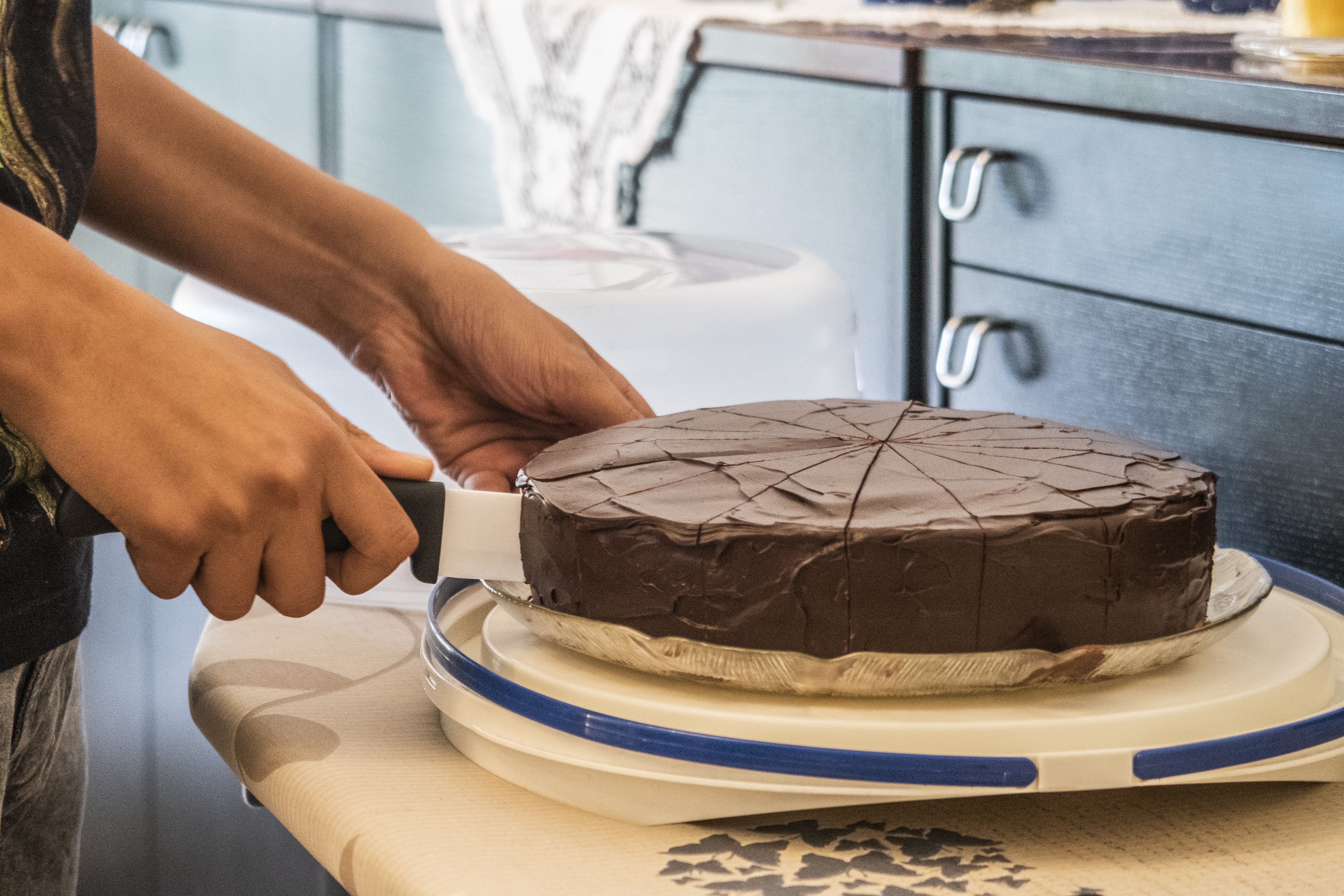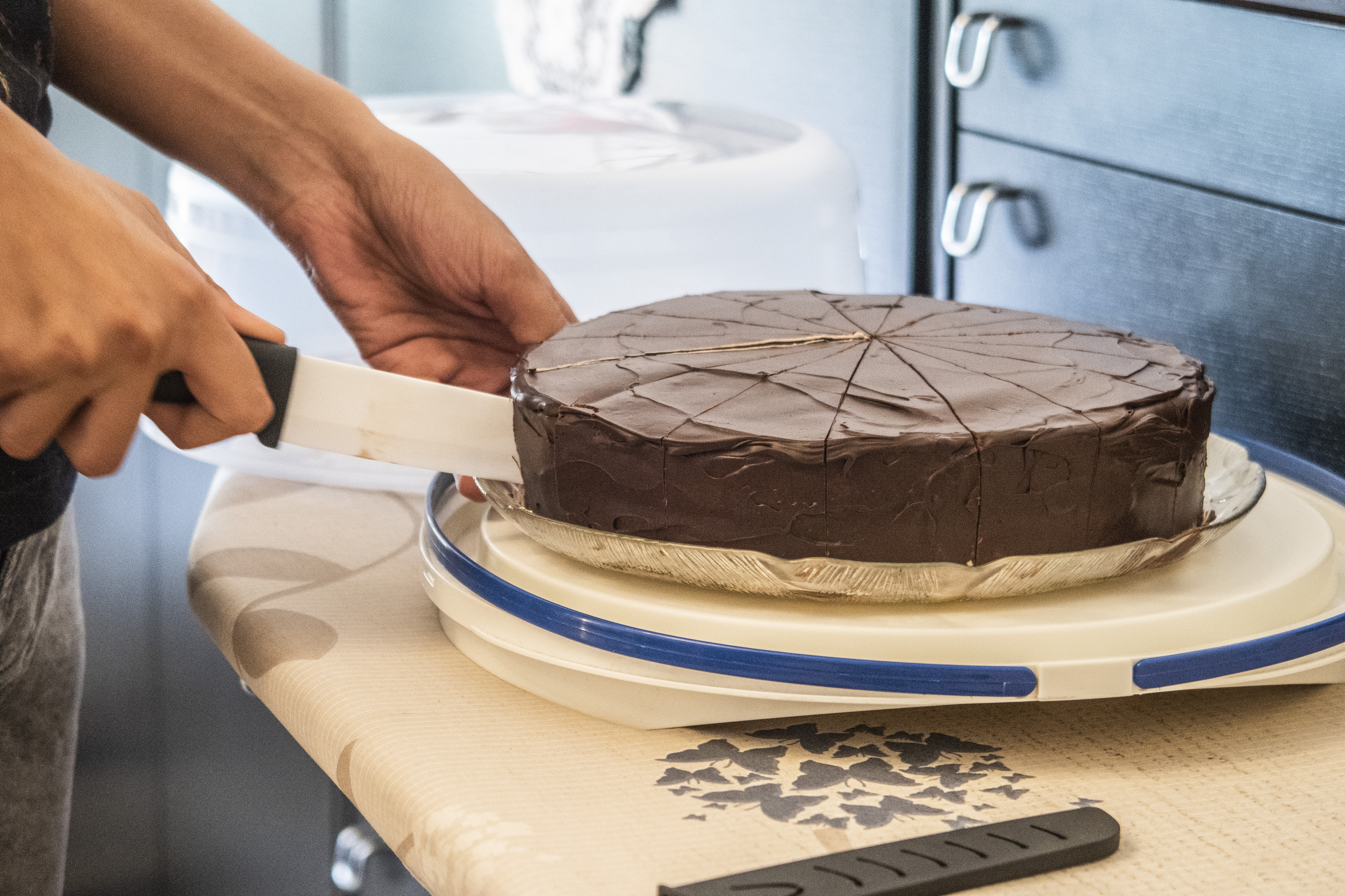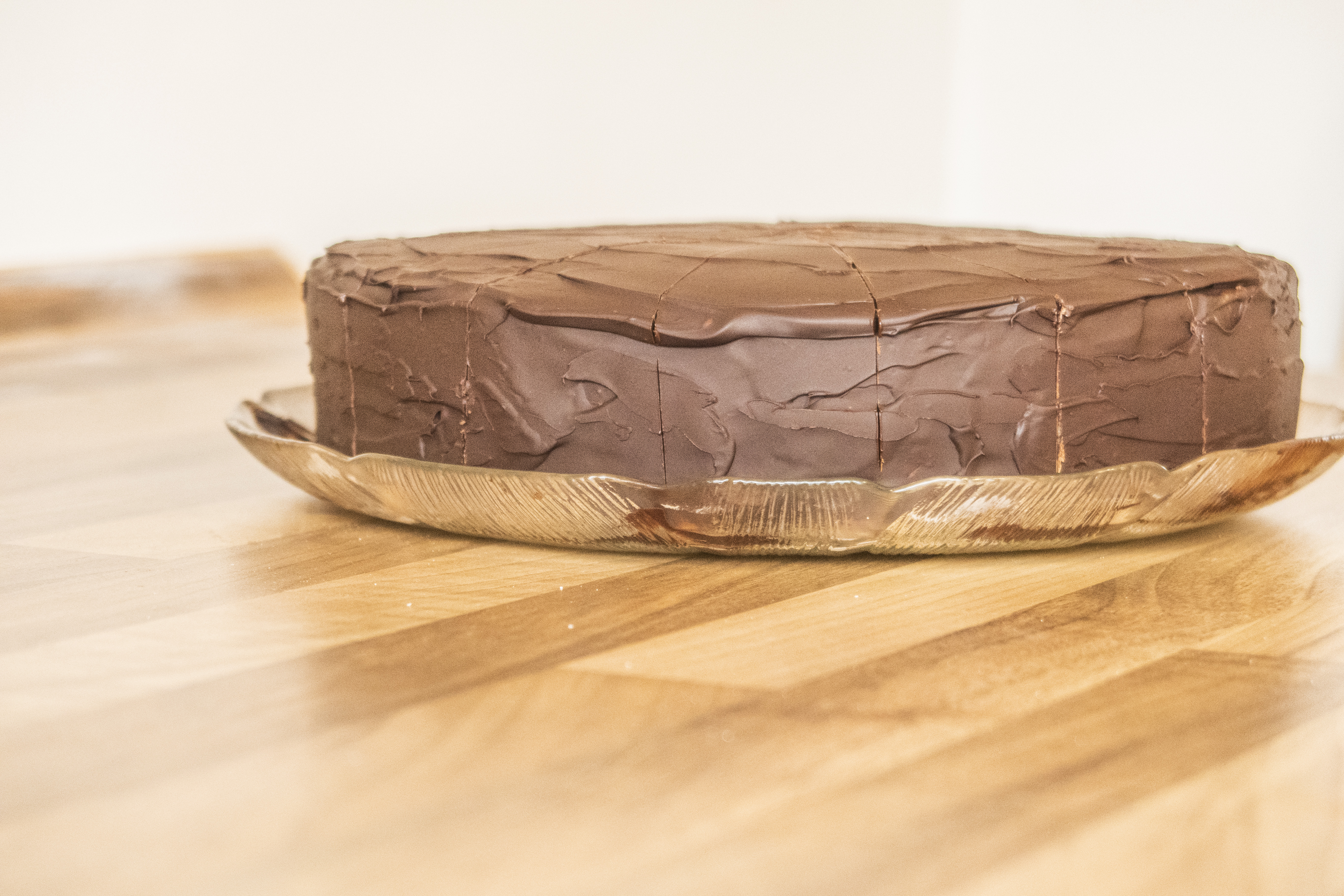 Zum Schluss noch der „Mastertipp“: damit die Schokolade nicht bricht, wenn ihr die Torte anschneidet, erwärmt ihr ein Messer und markiert damit durch leichtes Eindrücken in der kalten Schokoglasur die Tortenstückchen. Auch hier wieder den Rand nicht vergessen.