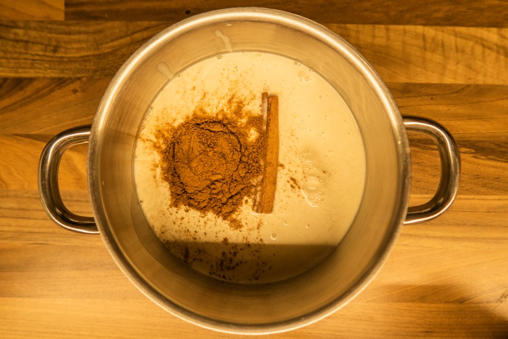 Gebt die Milch, die Sahne, den Zimt, die Zimtstange und die Prise Salz in einen Topf und erwärmt alles für etwa 10-15 Minuten bei schwacher bis mittlerer Hitze auf dem Herd. Auf diese Weise aromatisiert ihr eure „Sahnemilch“. Danach etwas abkühlen lassen. Ihr müsst sie nicht aufkochen.