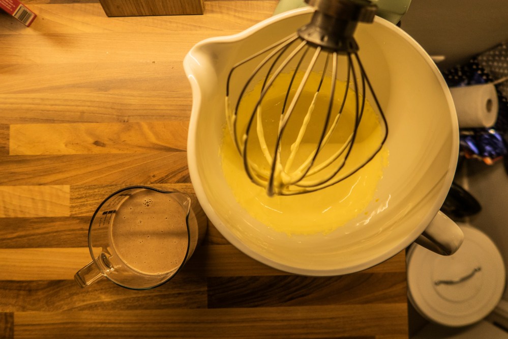 Nun gebt ihr die Eigelbe (das dazugehörige Eiweiß könnt ihr einfach einfrieren, wenn ihr es gerade nicht für ein anderes Rezept braucht) mit dem Getreidezucker in eine Rührschüssel und schlagt alles schön schaumig auf. Dadurch gewinnt die Eigelbmasse ordentlich an Volumen.
