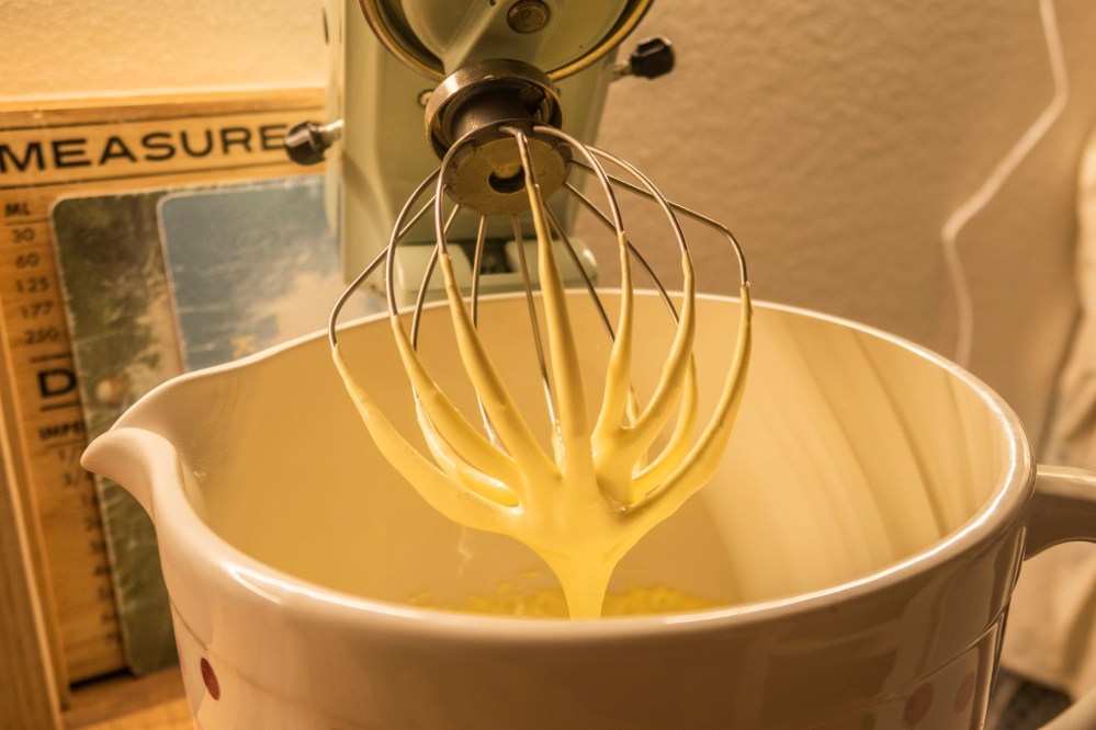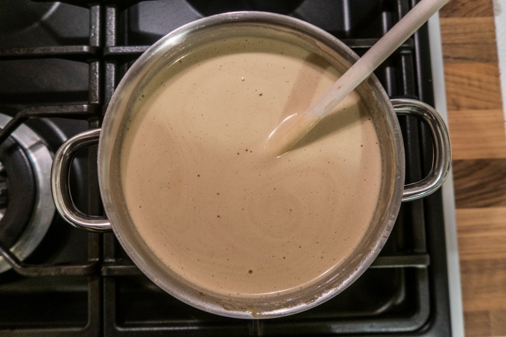 Entfernt die Zimtstange aus eurer aromatisierten und leicht abgekühlten Sahnemilch und gebt diese unter Rühren langsam zur Eigelbmasse. Wenn alles gut vermischt ist, gebt ihr alles wieder in einen Topf und erwärmt die Masse unter ständigem Rühren bei schwacher Hitze. Lasst die Masse schön eindicken, das dauert erneut etwa 10-15 Minuten. Die richtige Konsistenz ist erreicht, wenn ihr die Masse zu einer Rose abgekocht habt. Klingt komisch, ist aber so! Nehmt dafür die Unterseite eines Holzlöffels und gebt etwas von der Flüssigkeit darauf. Pustet nun von oben auf die Masse. Dabei sollte sie ein „rosenartiges“ Muster hinterlassen. Ist die Masse noch zu dünn, funktioniert es nicht. Dann einfach noch ein bisschen weiter erwärmen. Tipp: Bilder dazu findet ihr bei Google 😉