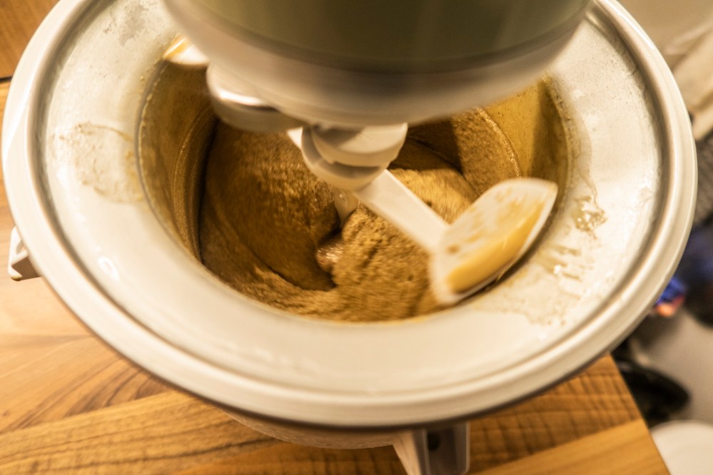 Ist eure Masse komplett erkaltet, geht es damit in die Eismaschine, die den Rest erledigt. Solltet ihr keine Eismaschine haben, könnt ihr sie auch einfach in eine Form geben und in die Tiefkühltruhe stellen. Dann bitte alle 30 Minuten mit einer Gabel durchrühren, damit beim Einfrieren keine Eiskristalle entstehen.