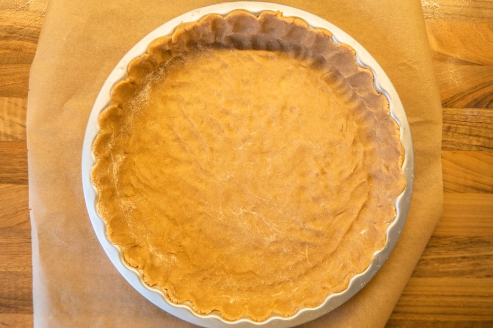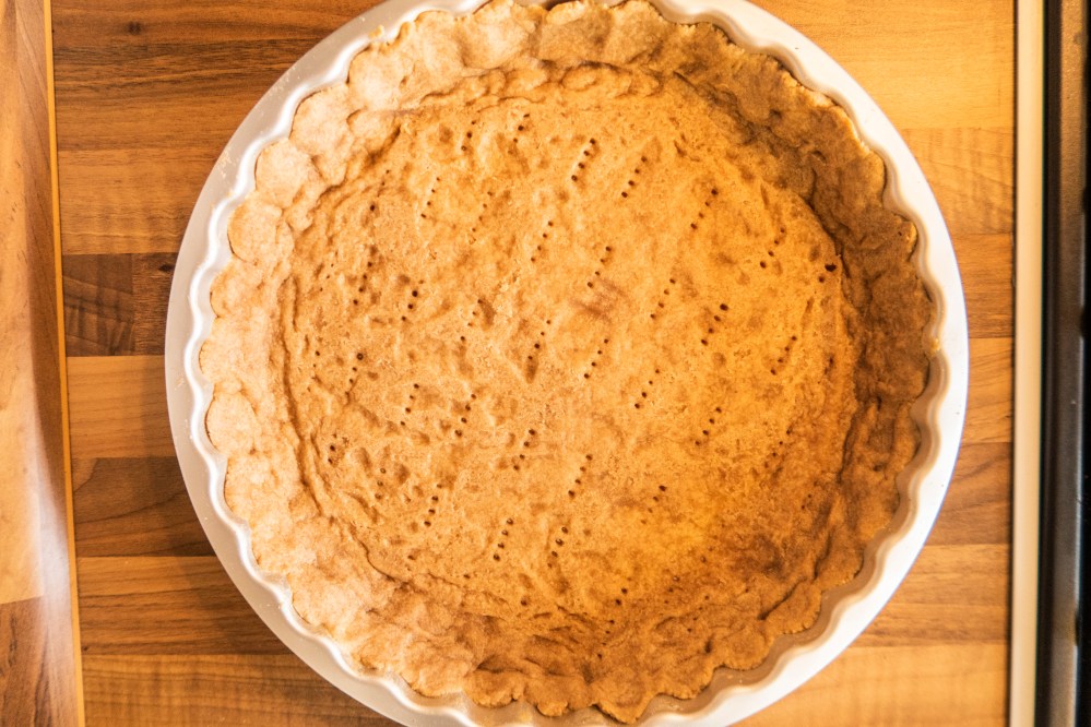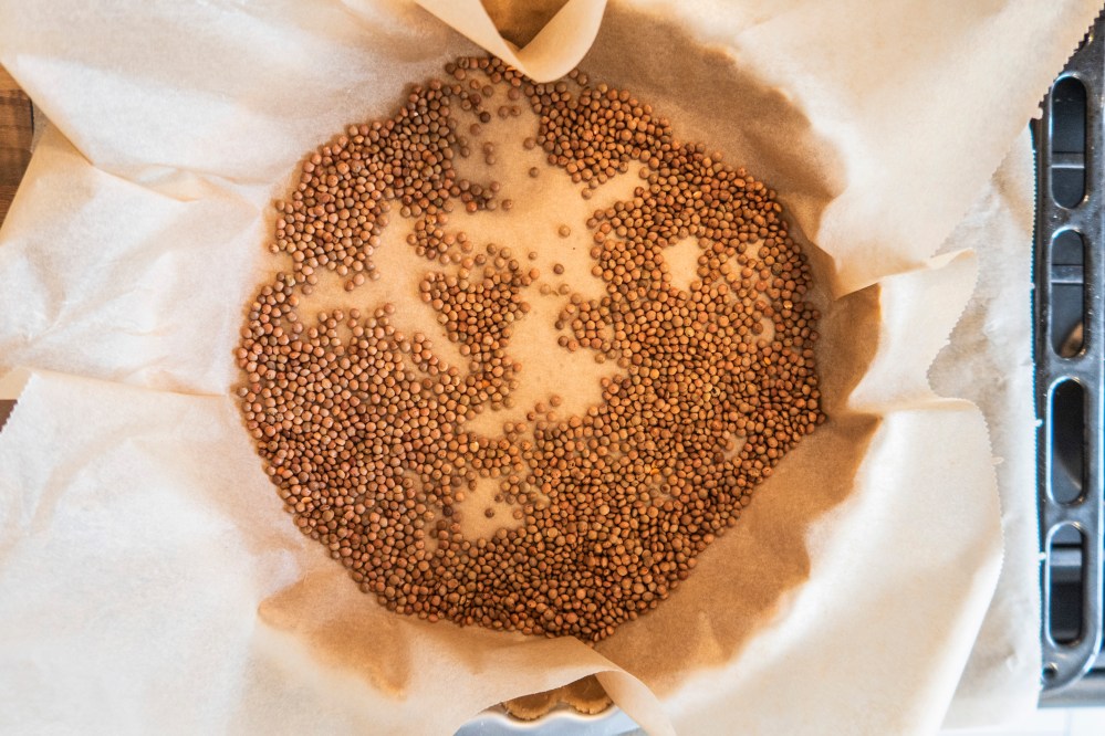 Nehmt die Tarteform wieder aus dem Kühlschrank, gebt auf den Teig Backpapier und beschwert dieses z.B. mit Backerbsen. Dann kommt alles für 15 Minuten zum „Blindbacken“ in den Ofen.
