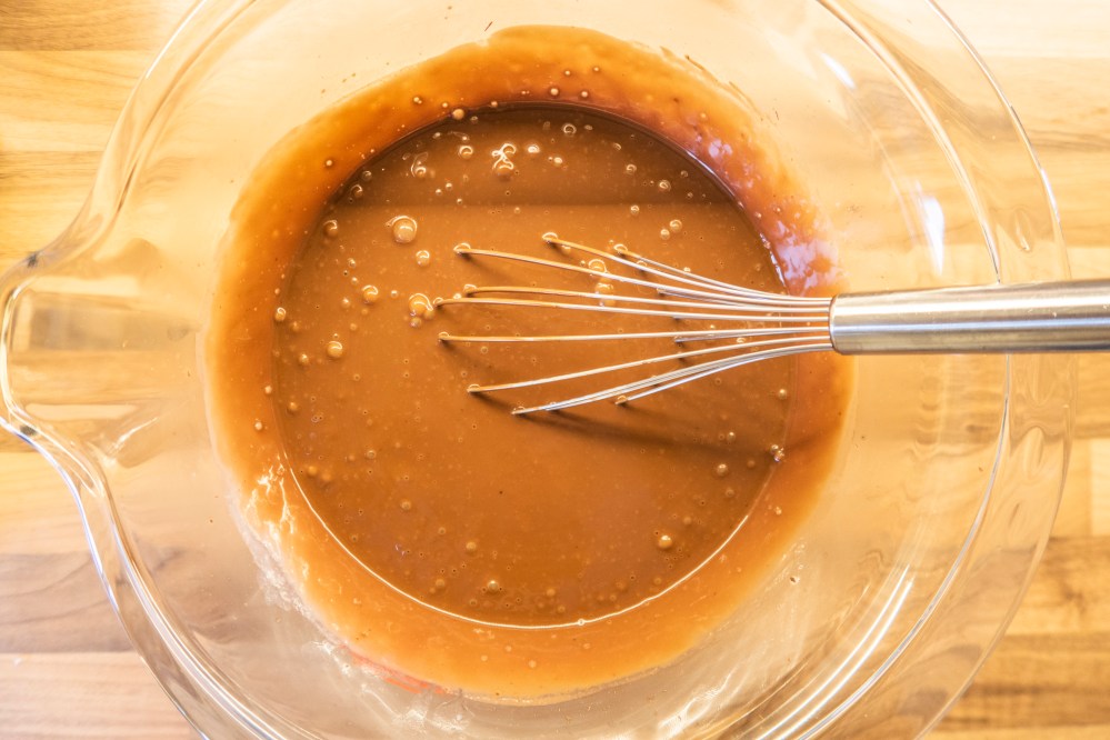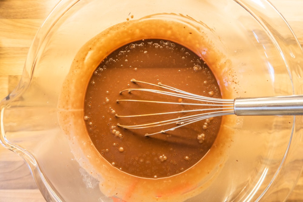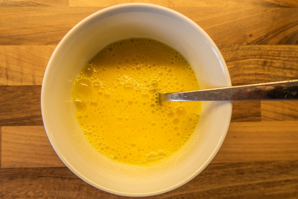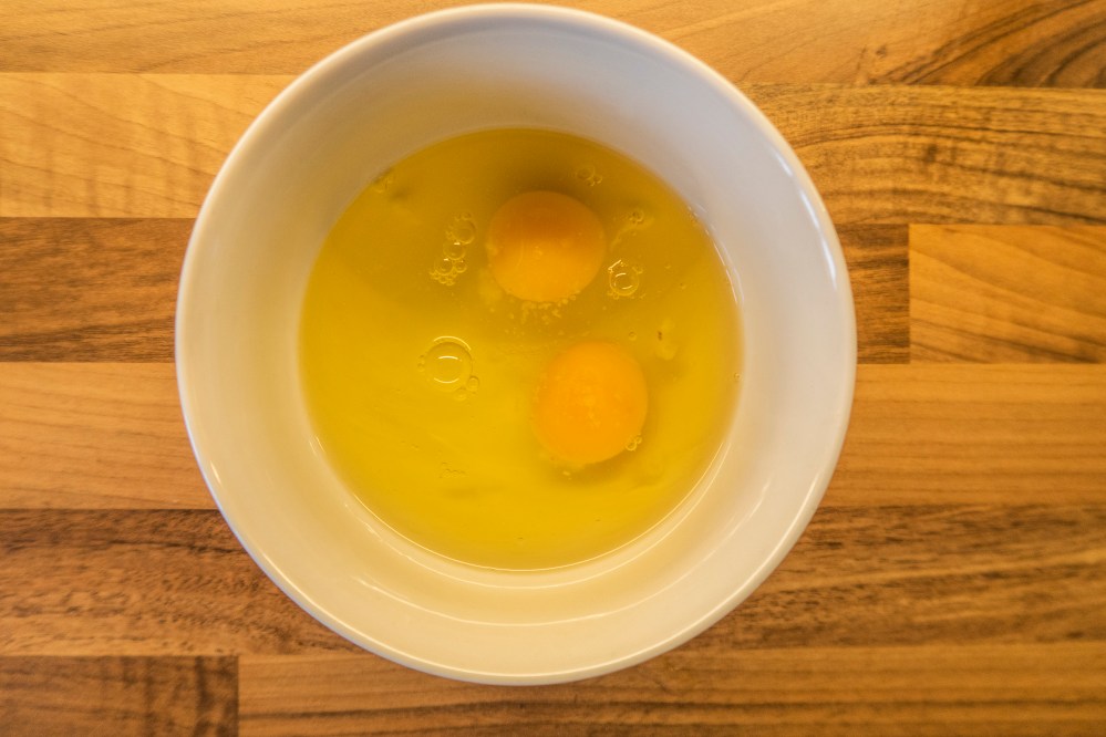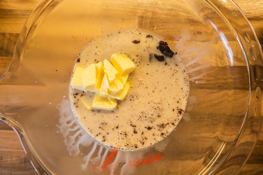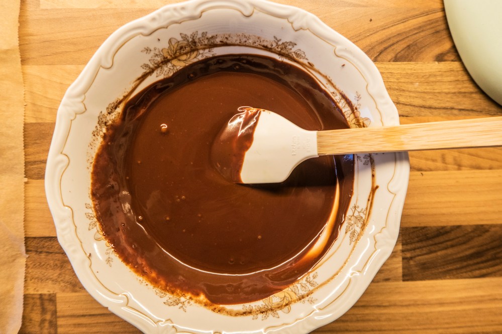 In der Zwischenzeit könnt ihr die Füllung vorbereiten. Dafür zerhackt ihr die Zartbitterschokolade und die Butter in kleine Stücke und gebt diese in eine Schüssel. Kocht die Sahne in einem kleinen Topf auf und gebt die heiße Sahne auf eure Schokoladen-Buttermischung. Lasst die Mischung 1-2 Minuten ziehen, dann rührt ihr alles mit einem Schneebesen glatt. Nun mischt ihr in einer kleinen Schüssel die Eier, die Eiweiße und eine Prise Salz zusammen und rührt auch diese glatt. Gebt diese dann zur Schokoladenmasse und rührt noch einmal kräftig durch.