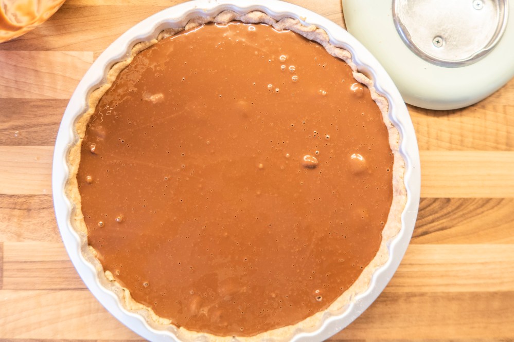 Für den Boden würfelt ihr die kalte Butter in kleine Stücke und verrührt sie mit dem Getreidezucker, der Milch und der Prise Salz. Dann gebt ihr das Mehl hinzu und verarbeitet alles zu einem Teig. Fettet eine Tarteform gut ein und drückt den Teig in die Form. Piekst mit einer Gabel mehrmals in den Boden und gebt die Form für mindestens 30 Minuten in den Kühlschrank.