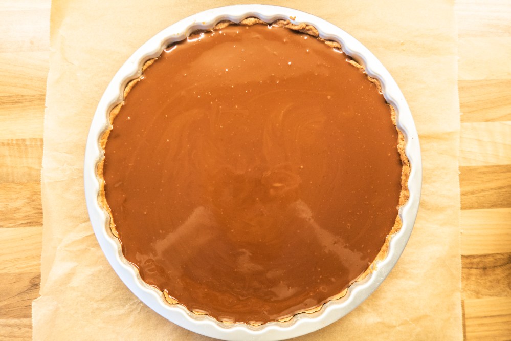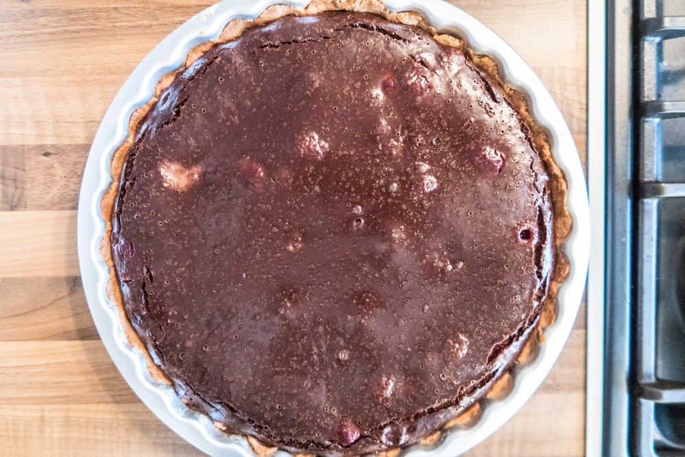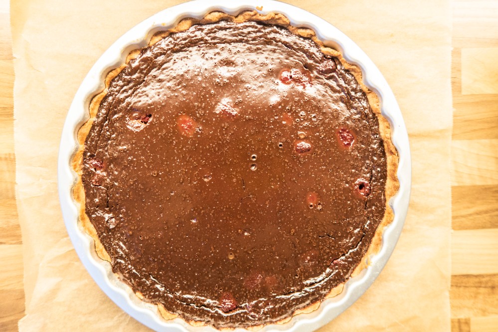 Nehmt eure Tarteform aus dem Ofen, entfernt das Backpapier mit den Backerbsen und gebt ggf. die Erdnussbutter und die Himbeeren auf den Boden. Darauf kommt die Schokoladenfüllung. Eure Tarte kommt dann noch einmal für etwa 25 Minuten in den Ofen. Danach für mindestens 1 Stunde auf Raumtemperatur abkühlen lassen.