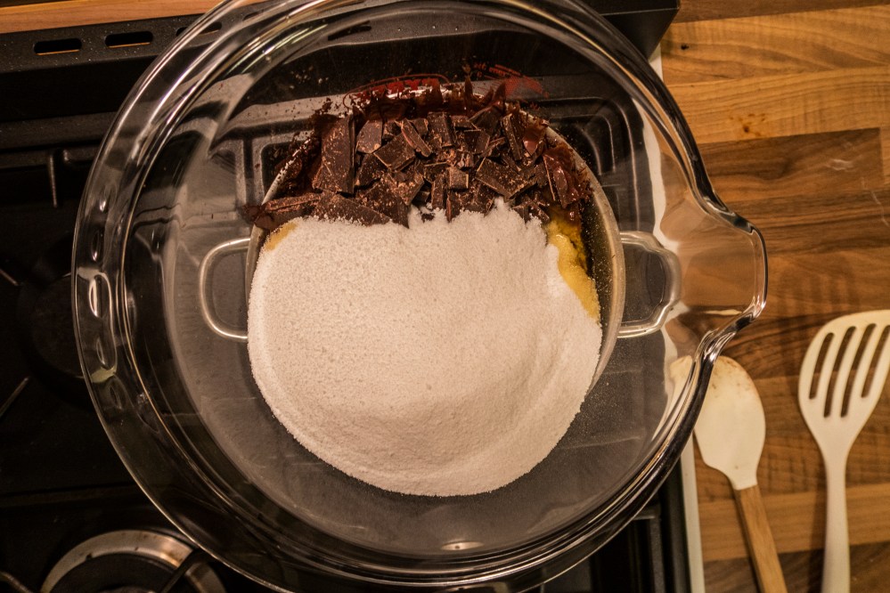 Lasst die Butter, die gehackte Zartbitterschokolade und den Getreidezucker im heißen Wasserbad schmelzen. Immer wieder umrühren. Die Mischung muss nun etwas abkühlen.