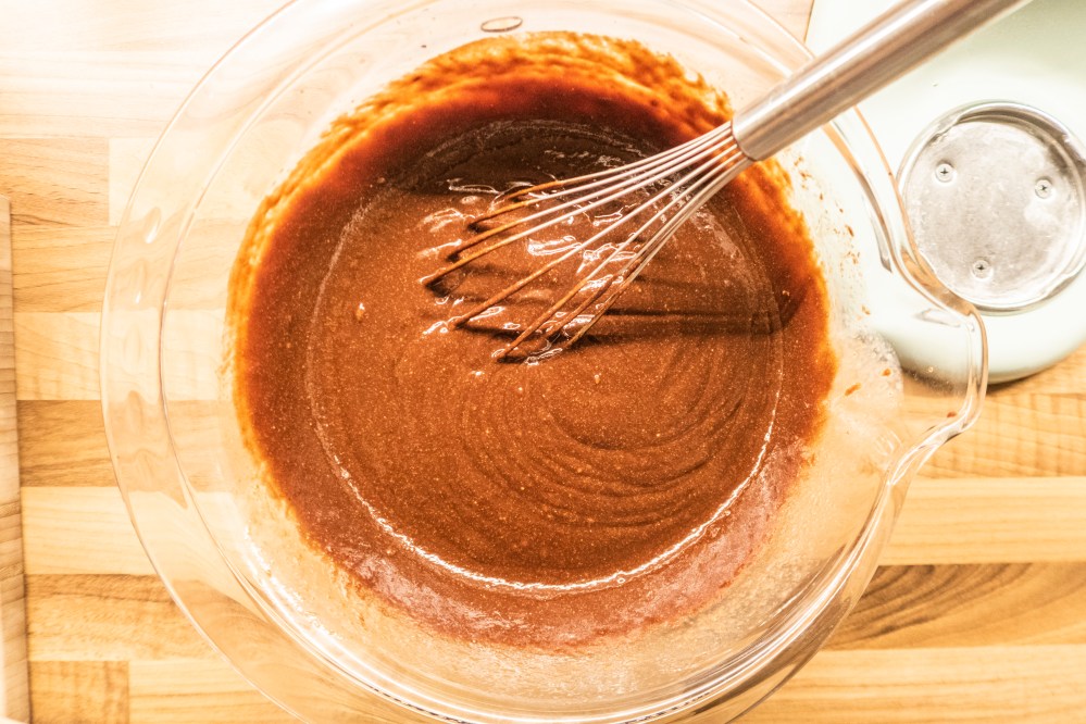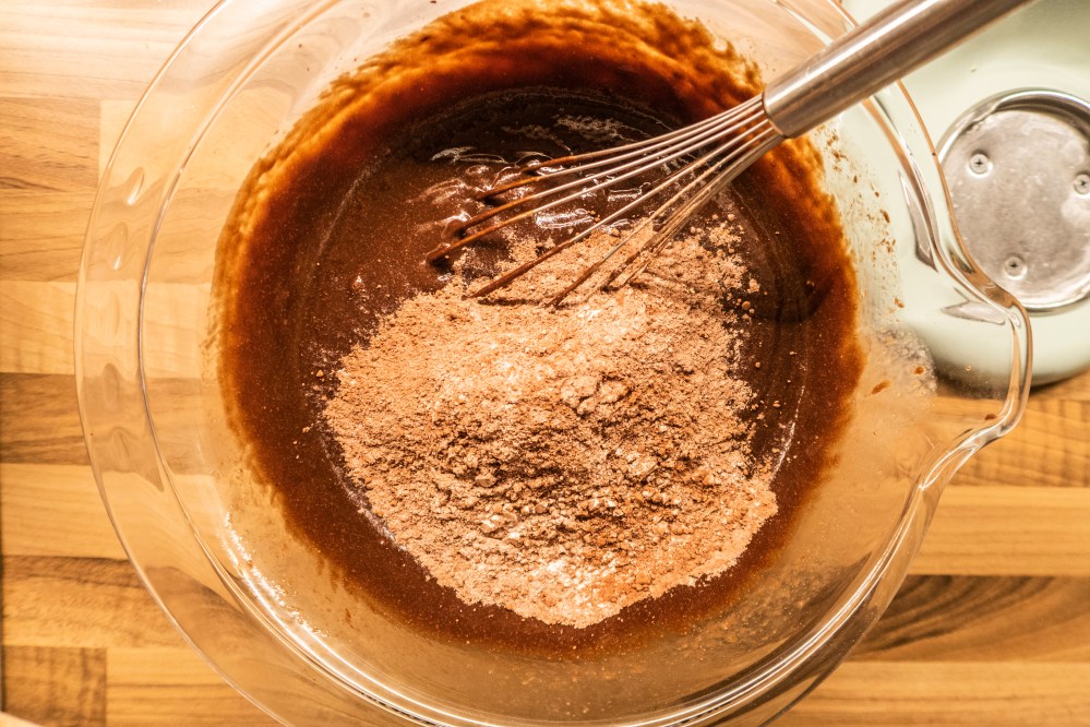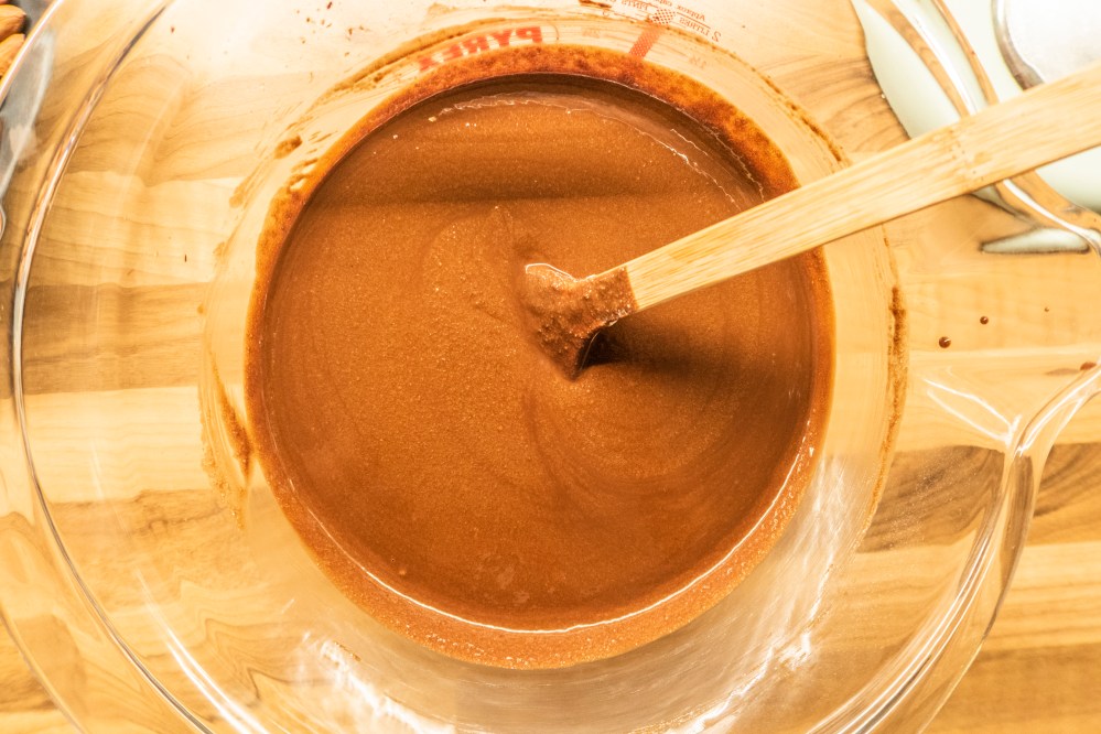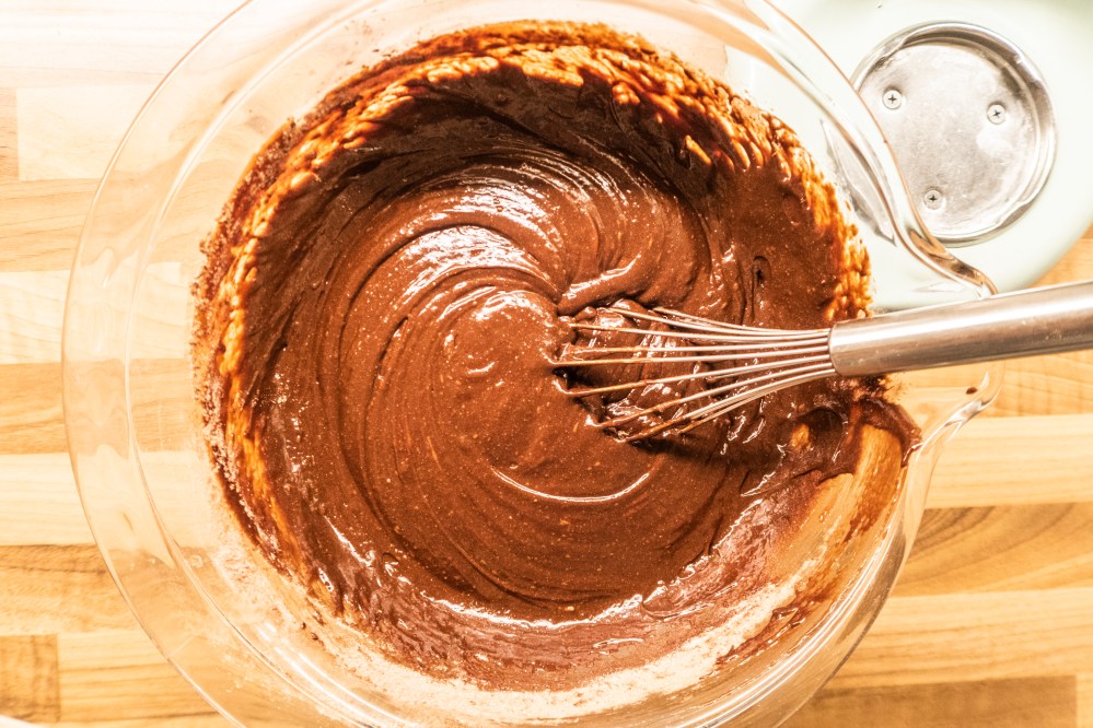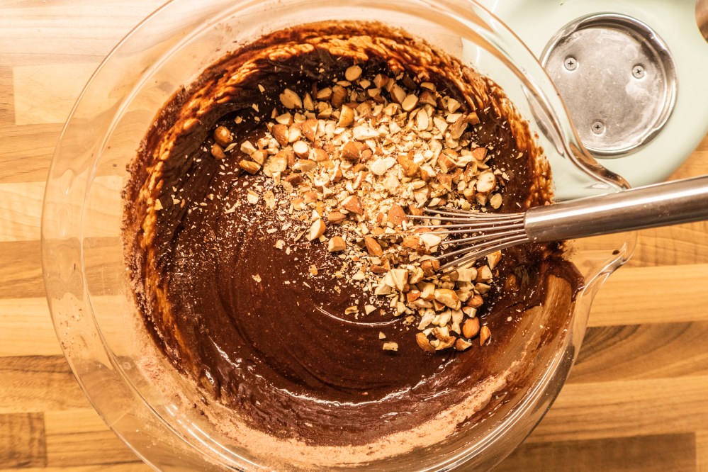 Verquirlt die Eier in einer extra Schüssel. Ist eure Schokoladenbutter abgekühlt, schlagt ihr die Eier gründlich unter. Die Masse darf dabei nicht mehr zu warm sein, sonst werden eure Brownies hart. Mischt das Mehl, das Kakaopulver, das Salz und das Natron. Nun ganz leicht mit der Eierschokoladenmasse vermengen (nicht mit der Küchenmaschine, sondern von Hand). Falls gewünscht, kommen hier noch die gehackten Mandeln hinzu.