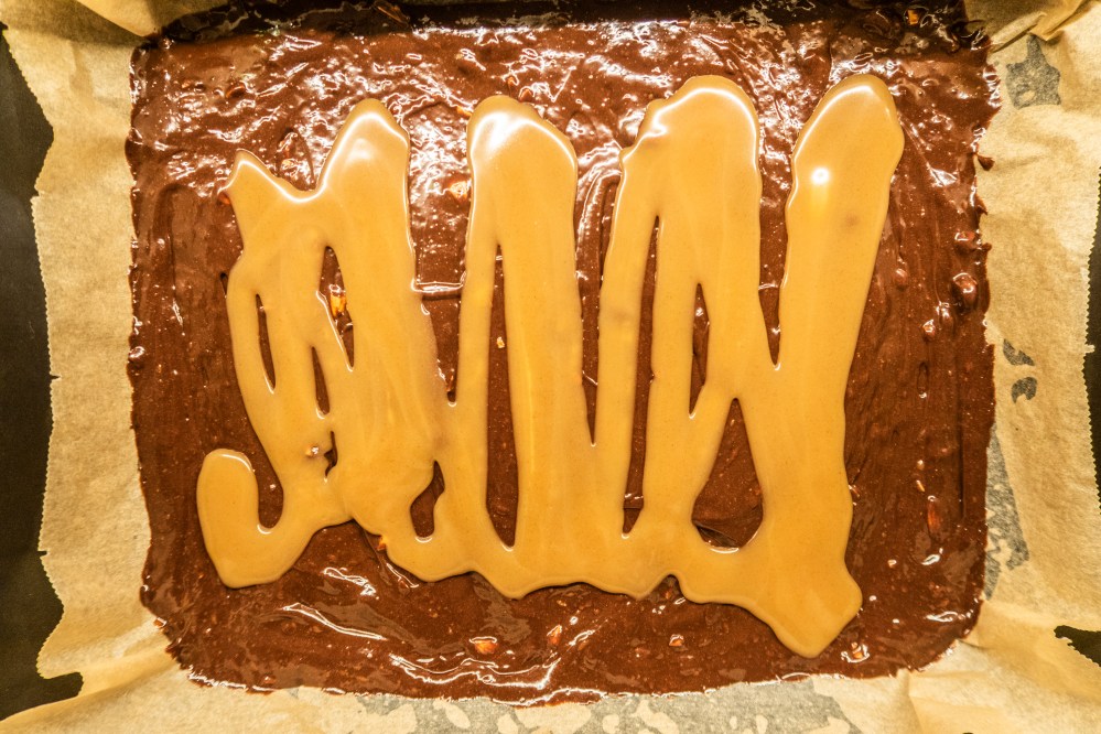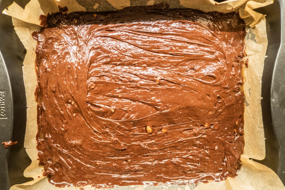 Gebt nun die Hälfte des Teiges in eine gefettete Backform (ca. 23 x 23 cm), darauf gebt ihr die Karamellsoße und darauf den restlichen Teig. Wenn ihr den restlichen Teig auf euer Karamell gebt, gebt nicht alles auf eine Stelle, sonst drückt ihr das Karamell nur seitlich weg und habt davon in der Mitte nichts mehr. Lieber häppchenweise auftragen. Die Brownies kommen für etwa 20 Minuten in den Ofen.