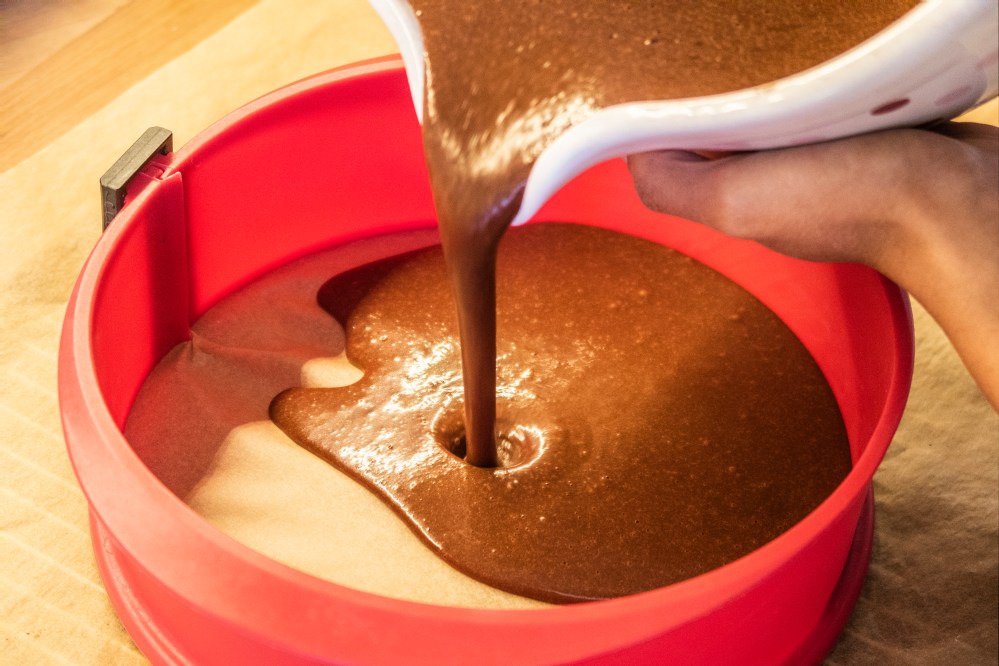Gießt nun die Hälfte des Teiges in eine gefettete Form (Durchmesser etwa 23 cm) und backt den ersten Boden für ca. 30-35 Minuten. Danach für etwa 10 Minuten in der Form auskühlen lassen, bevor ihr diese ablöst. Vollständig abkühlen lassen.
