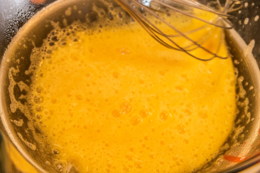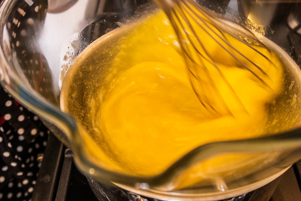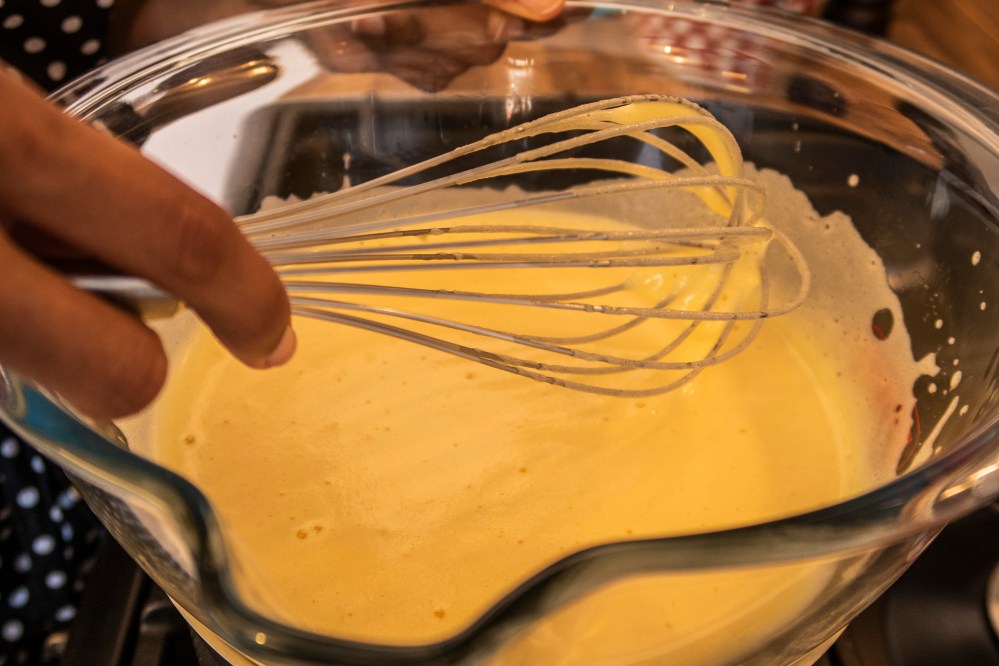 Nehmt nun eine Schüssel (oder alternativ einen kleineren Topf), die in euren Topf reinpasst, aber nicht das Wasser berührt (wichtig!). Hier gebt ihr die Eier und den Getreidezucker rein. Nun schlagt ihr die Masse für ca. 10 Minuten über dem heißen Wasser schaumig auf. Dabei nimmt die Eiermasse an Volumen zu und wird immer heller. Anschließend in einem kalten Wasserbad noch weiter aufschlagen, bis die Masse wieder ganz ausgekühlt ist. Zum Testen am besten einmal mit dem Fingerknöchel eintauchen und die Temperatur checken.