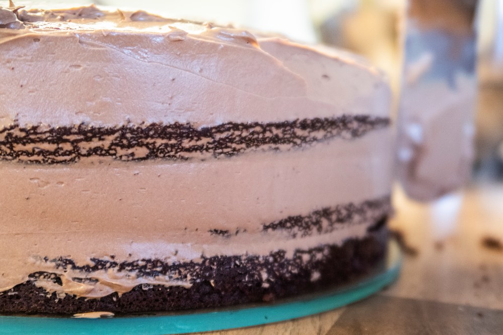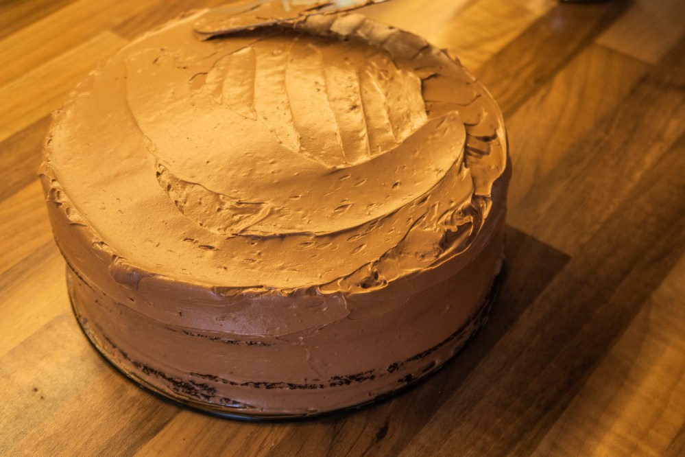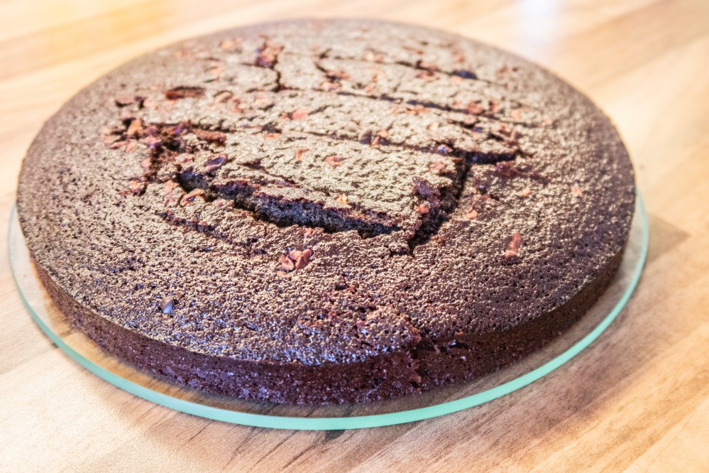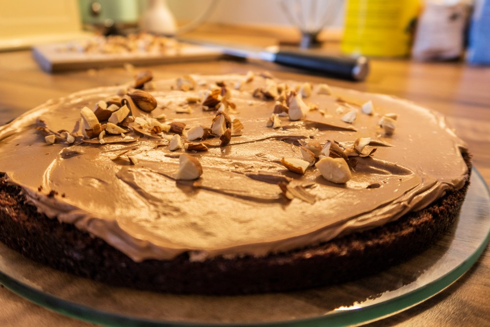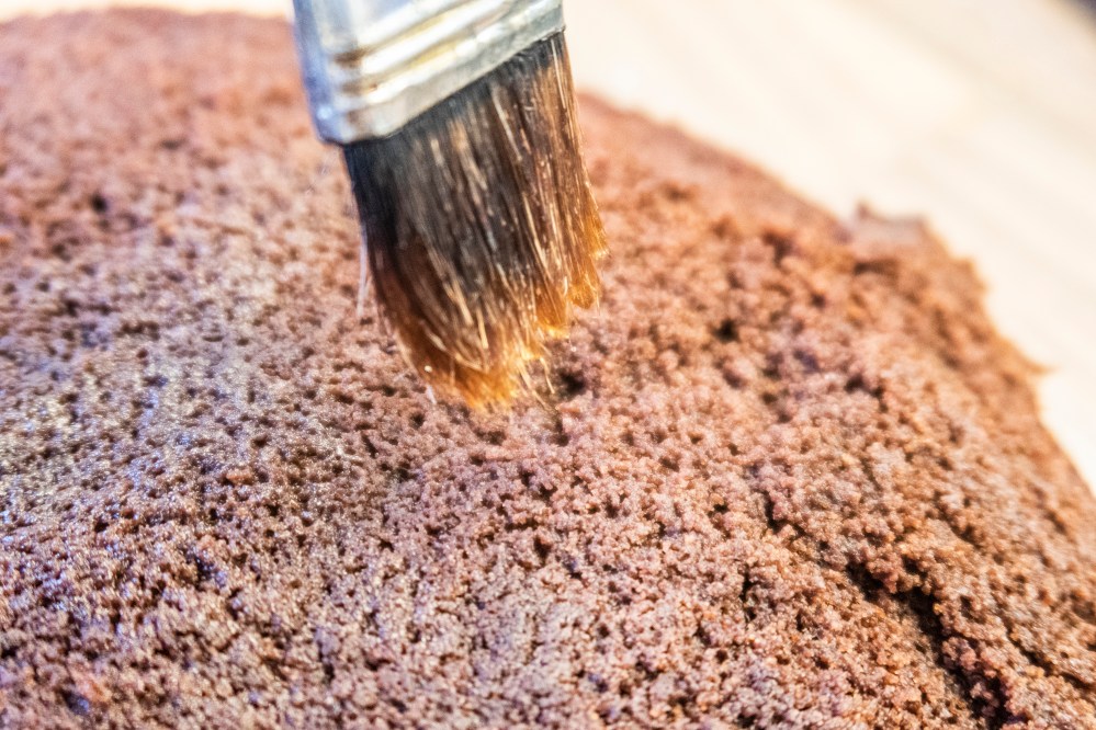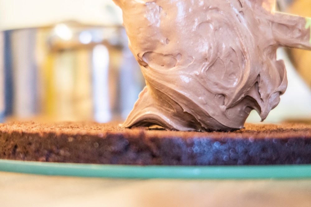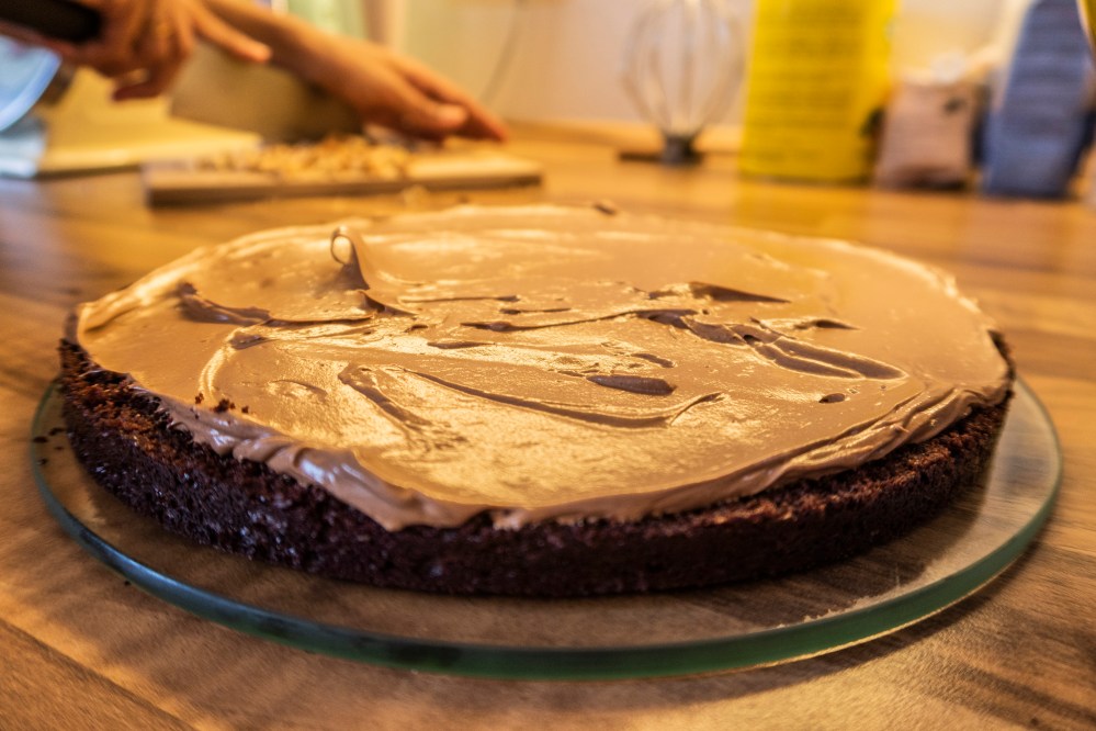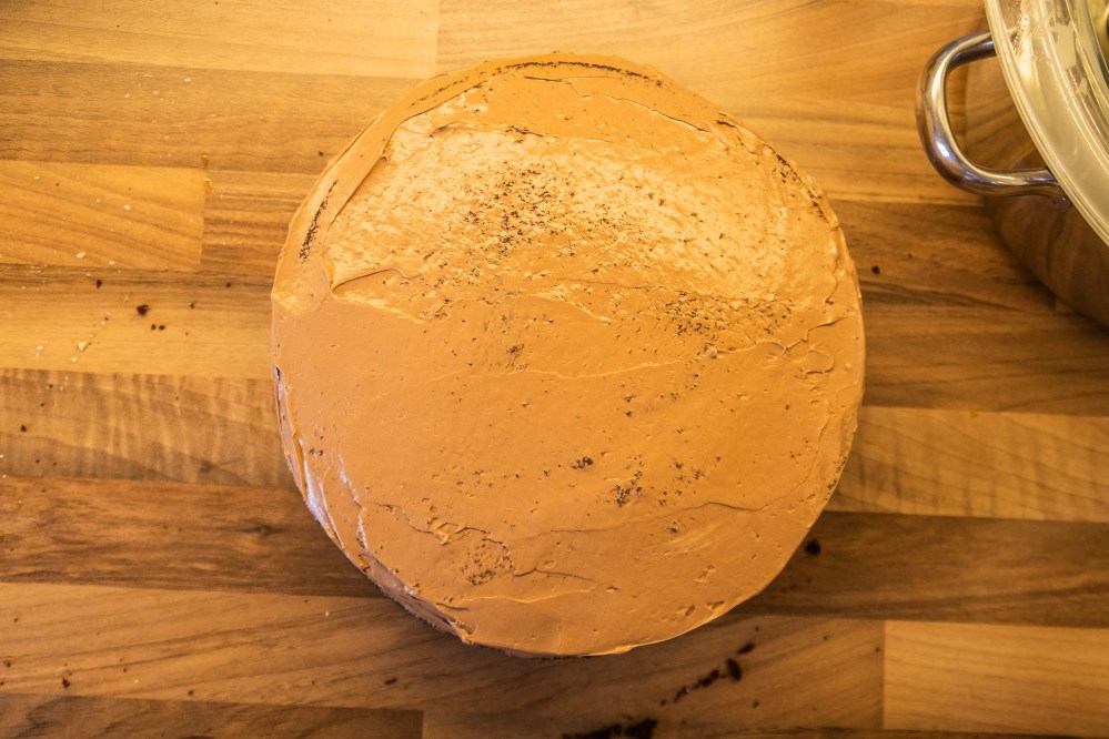 Platziert den ersten Boden auf einer Platte, tränkt ihn mit dem kalten Kaffee, gebt darauf etwas Creme, dann den nächsten Boden (mit der gewölbteren Seite nach unten), erneut mit Kaffee tränken, darauf wieder Creme und so weiter, bis ihr alle Böden übereinander geschichtet habt. Der Kaffee sorgt dafür, dass der schokoladige Geschmack noch verstärkt wird und verhindert zusätzlich, dass die Böden im Kühlschrank austrocknen und hart werden. Wenn ihr wollt, könnt ihr zwischen eure Böden noch etwas gehackte Mandeln (vielleicht auch karamellisiert), Kakaonibs oder ähnliches geben, dann habt ihr zwischendrin auch etwas Festes zum darauf Beißen und gebt der Torte mehr Struktur.