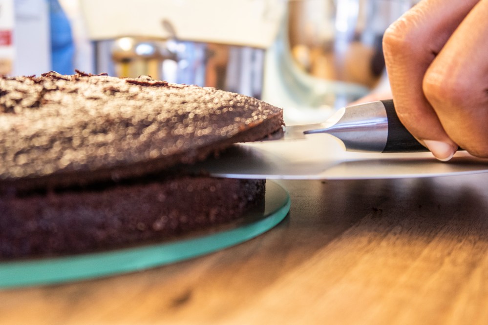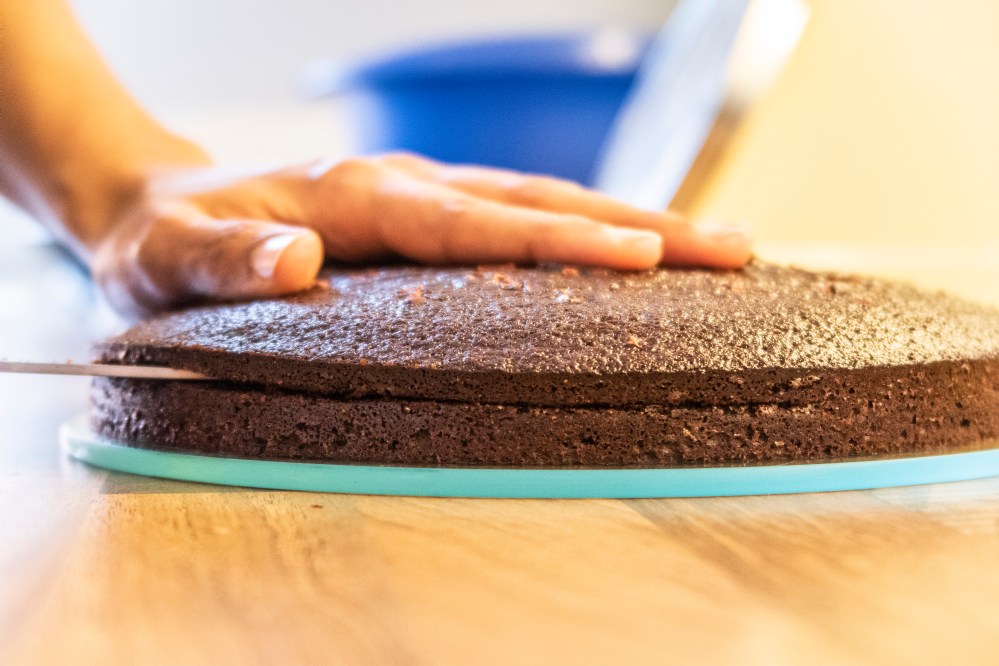 Nun geht es ans Schichten der Torte. Halbiert dazu die Böden jeweils, sodass ihr insgesamt 4 Böden habt.