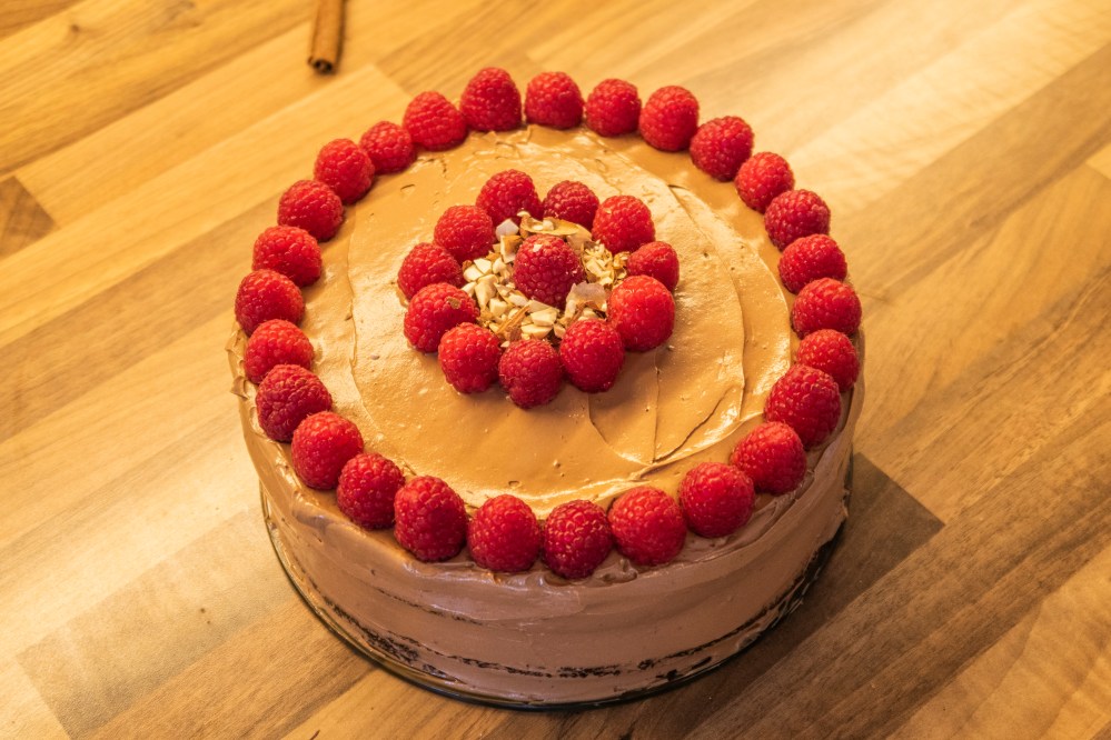 Streicht eure Torte auch von außen dünn mit etwas Buttercreme ein und gebt sie für etwa 10 Minuten in den Kühlschrank. Anschließend mit der restlichen Creme einstreichen. Zum Schluss könnt ihr die Torte noch Dekorieren, zum Beispiel mit Himbeeren, Mandeln oder Schokolade. Für mindestens 2 Stunden im Kühlschrank kalt stellen.