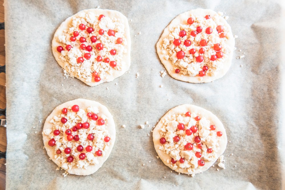 Nach der Gehzeit teilt ihr euren Teig in 10 gleich große Teile. Diese rollt ihr nun zu kleinen, runden Talern mit einer Dicke von ca 0,5 cm aus und legt diese auf ein mit Backpapier ausgelegtes Backblech. Auf die Taler gebt ihr zunächst die Streusel und verteilt dann darauf die Johannisbeeren in eurer gewünschten Menge. Die Streuseltaler kommen dann für etwa 15 Minuten in den Backofen, bis diese am Rand goldbraun gebacken sind.